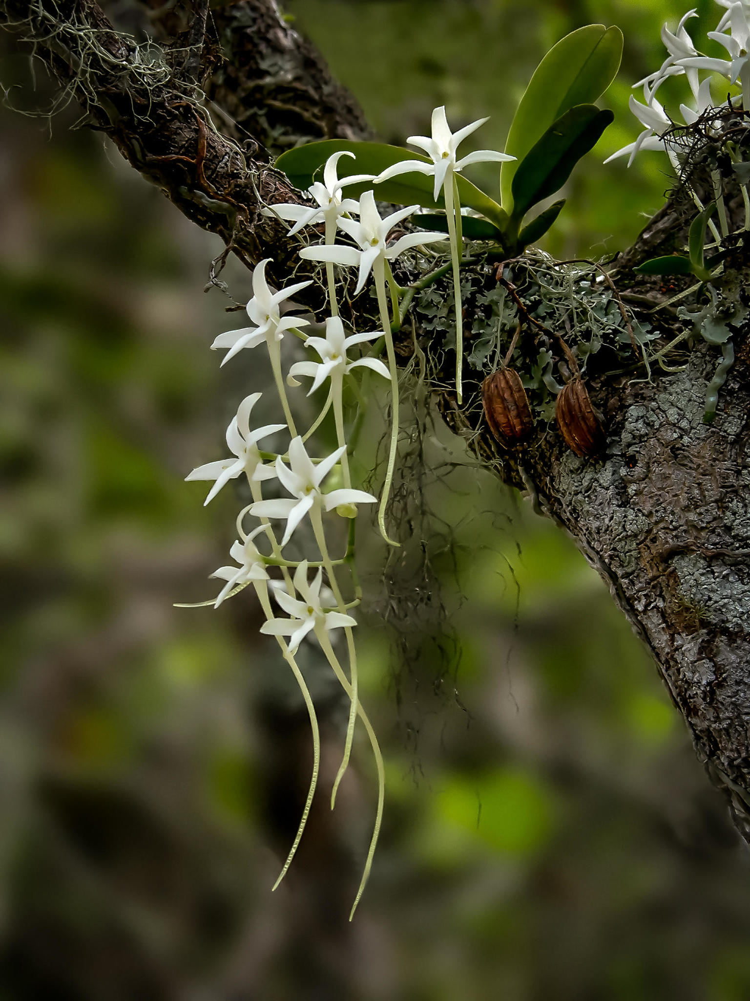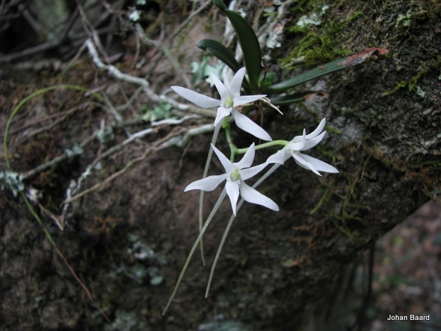 Monopodial epiphyte with stems to 2.5 cm. Leaves oblong-oblanceolate, channelled, apically notched. Flowers several in a lax raceme, white, 25-30 mm diam., tepals lanceolate, lip with short side lobes and a filiform spur 35-60 mm long. From: Kurzweil, H. 2012. Orchidaceae. In: J Manning & P Goldblatt (eds), Plants of the Greater Cape Floristic Region 1: The Core Cape flora. Strelitzia 29: 177-197. South African National Biodiversity Institute, Pretoria. [CC BY]