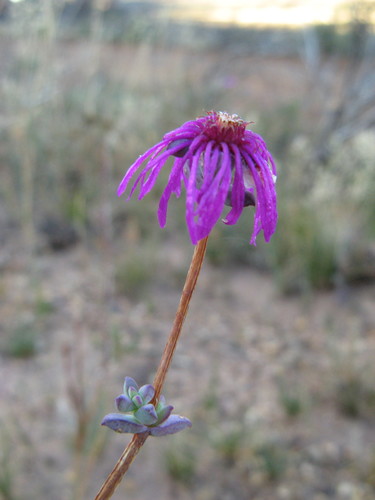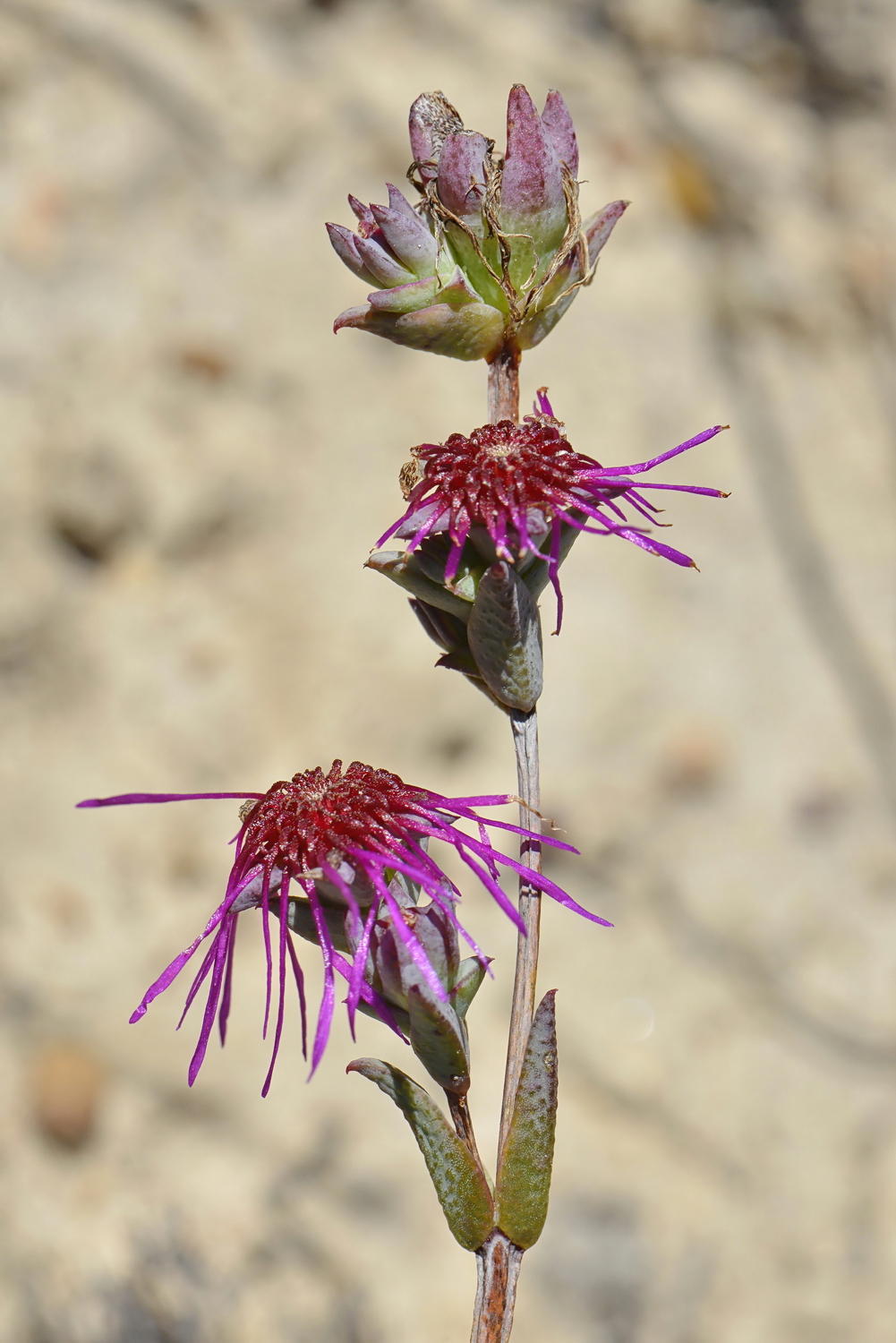 General notes: Fynbos biome. Swartland Shale Renosterveld vegetation. Gentle, hill slope. Well-drained, loam, stony soil. Shale. Full sun. N aspect. No biotic effect seen. Succulent. Petals deep purple, cone purple. Laxly branched, at 45°. Petals all reflexed. Flowers and fruit present. Plant height 0.45 m. Locally common, on shales at base of mountain. Veld >6 years old, and in recently burnt veld.