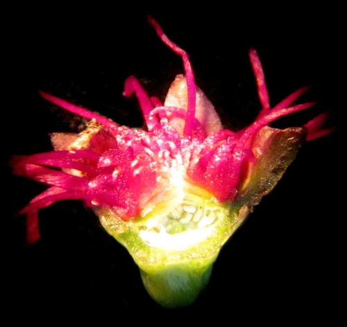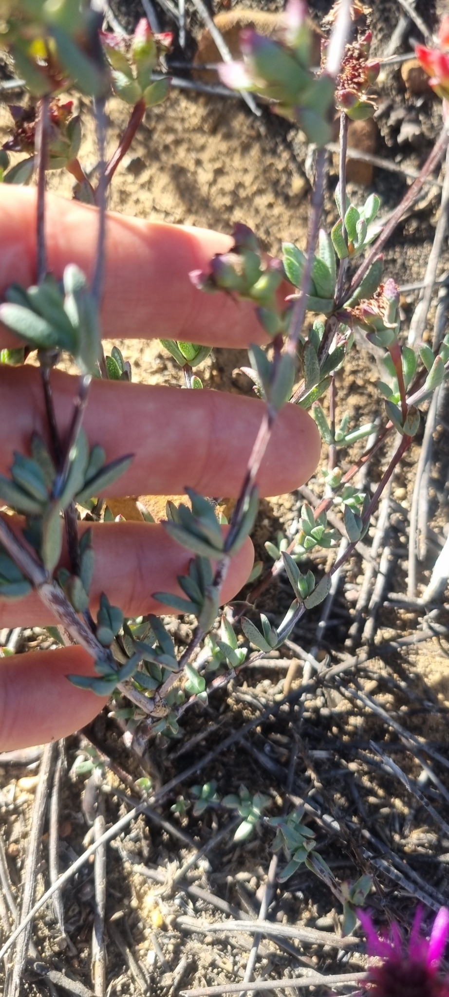 Leaves narrower, usually < 5 mm diam.; walls of hypanthium erect. Erect shrublet to 40 cm, with slender branches from base. Leaves < 5 mm diam. Flowers in monochasia, magenta, remaining open, outer filamentous staminodes red, inner yellow with red tips, reproductive parts hidden. Fruits 5-7 mm diam. From: Klak, C. 2012. Aizoaceae: Erepsia N.E.Br. In: J Manning & P Goldblatt (eds), Plants of the Greater Cape Floristic Region 1: The Core Cape flora. Strelitzia 29: 280-282. South African National Biodiversity Institute, Pretoria. [CC BY]