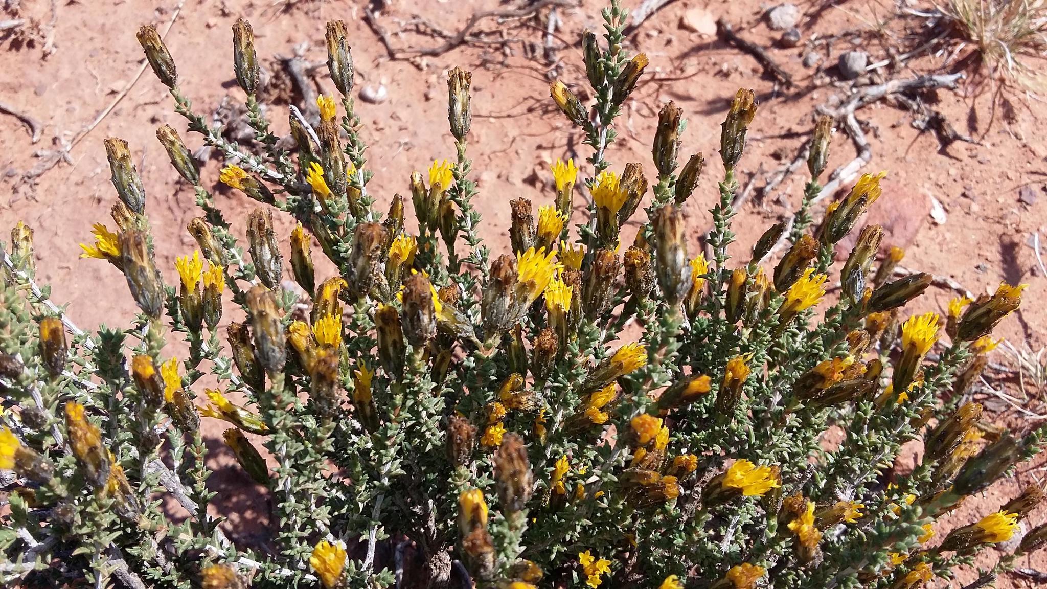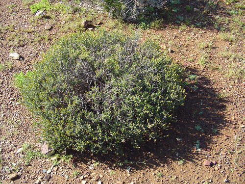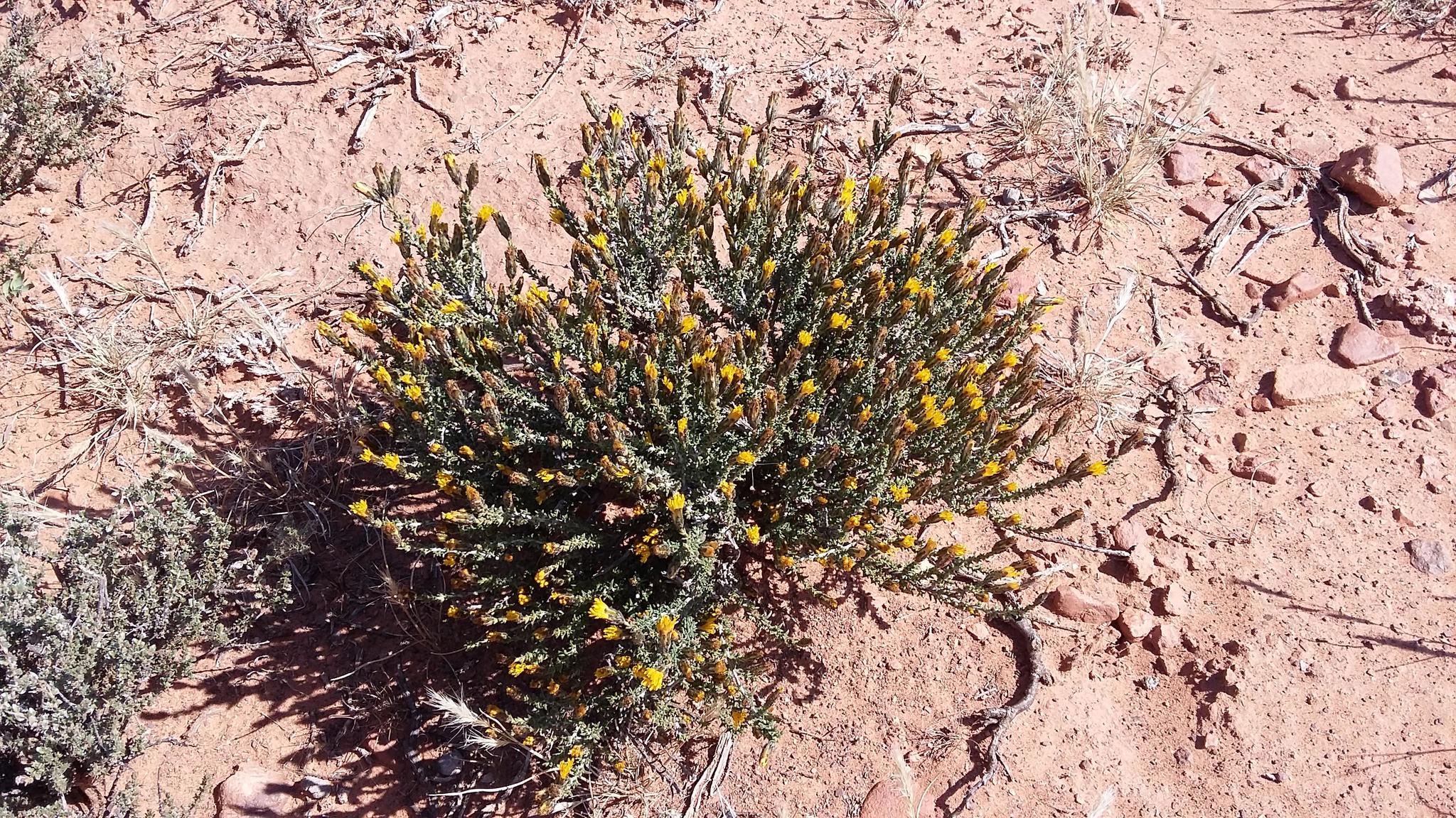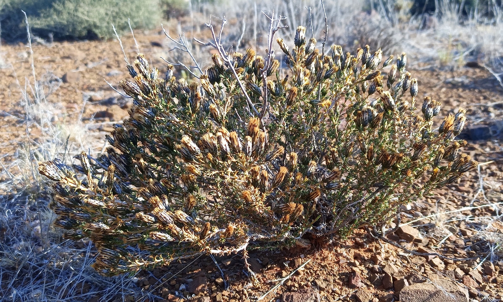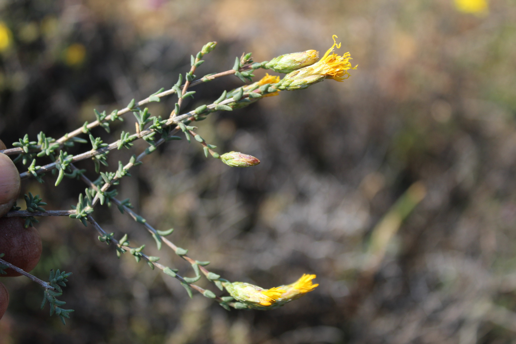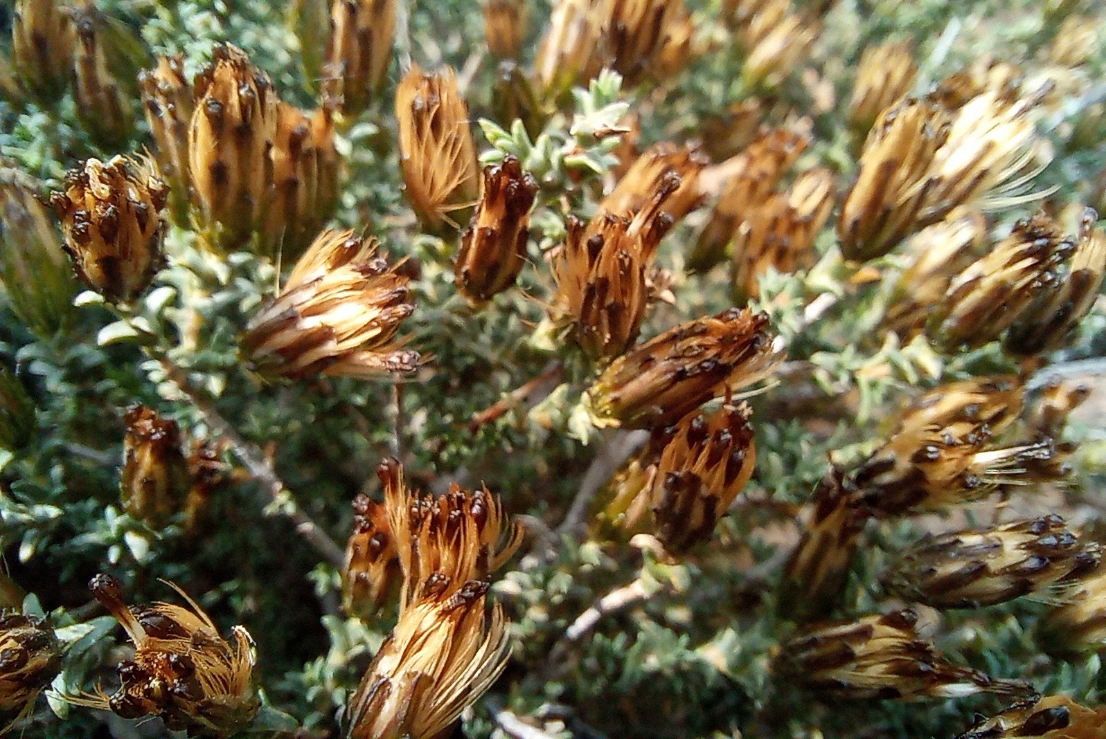 Dwarf shrub, up to 0.6 m high. Leaves ericoid, opposite, sessile, subconnate at base, closely set; blade linear or very narrowly ovate, apex obtuse, margins entire, glabrous, minutely puberulous when young. Heads discoid, terminal, solitary or few together, subcorymbosely arranged. Involucral bracts ± 7-seriate, imbricate, oblong-linear, obtuse, green along middle with membranous margins, glabrous. Flowers: disc florets only, yellow; Jul.-Sep. Fruit with cypsela oblong, densely long-hairy. Pappus of straw-coloured, subplumose bristles, outer more slender than inner. From: Herman, PPJ; Retief, E; Meyer, NL. 2017. Asteraceae. In: E Retief & NL Meyer (eds), Plants of the Free State: Inventory and identification guide. Strelitzia 38: 249-413. South African National Biodiversity Institute, Pretoria. [CC BY]