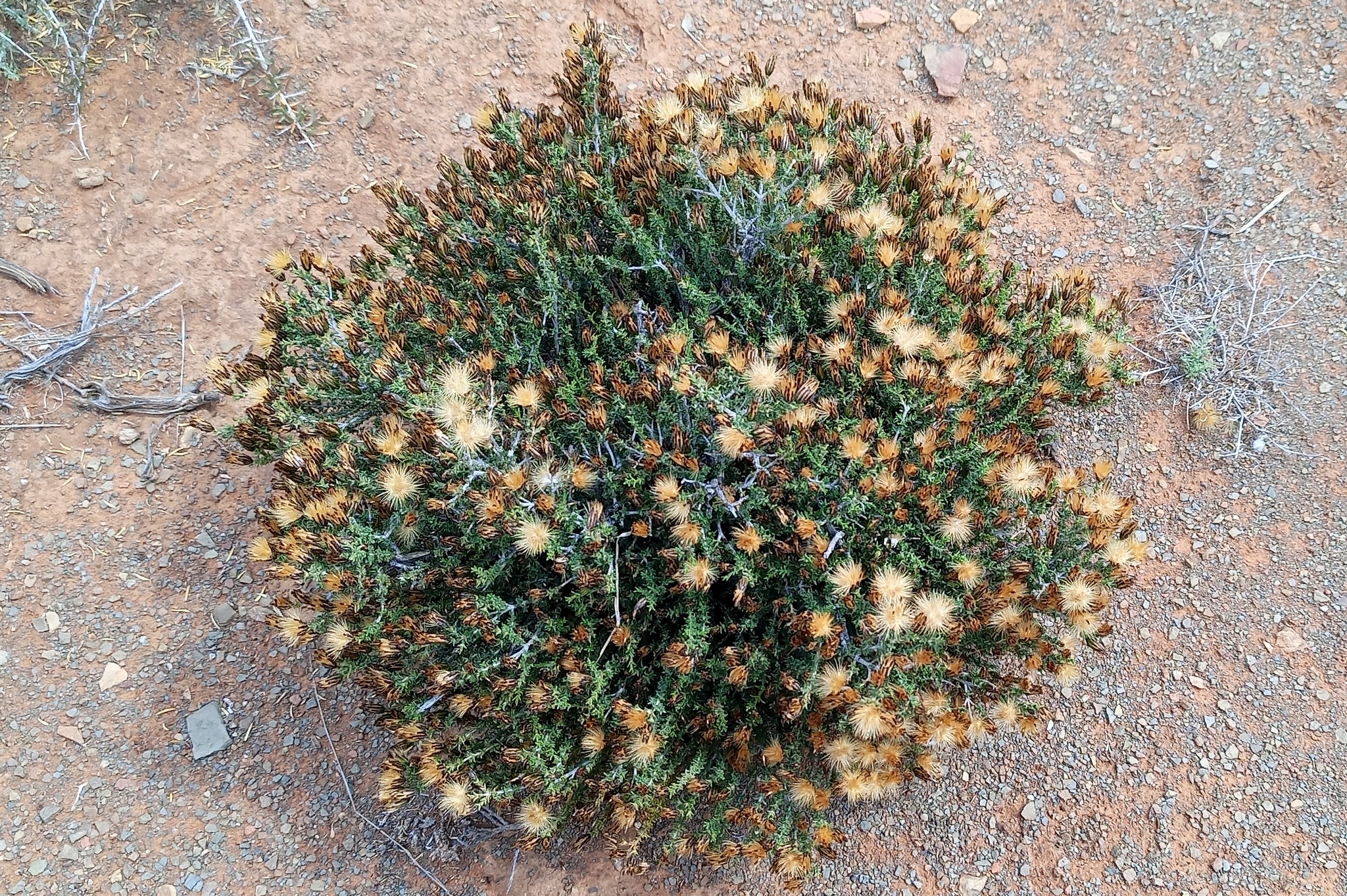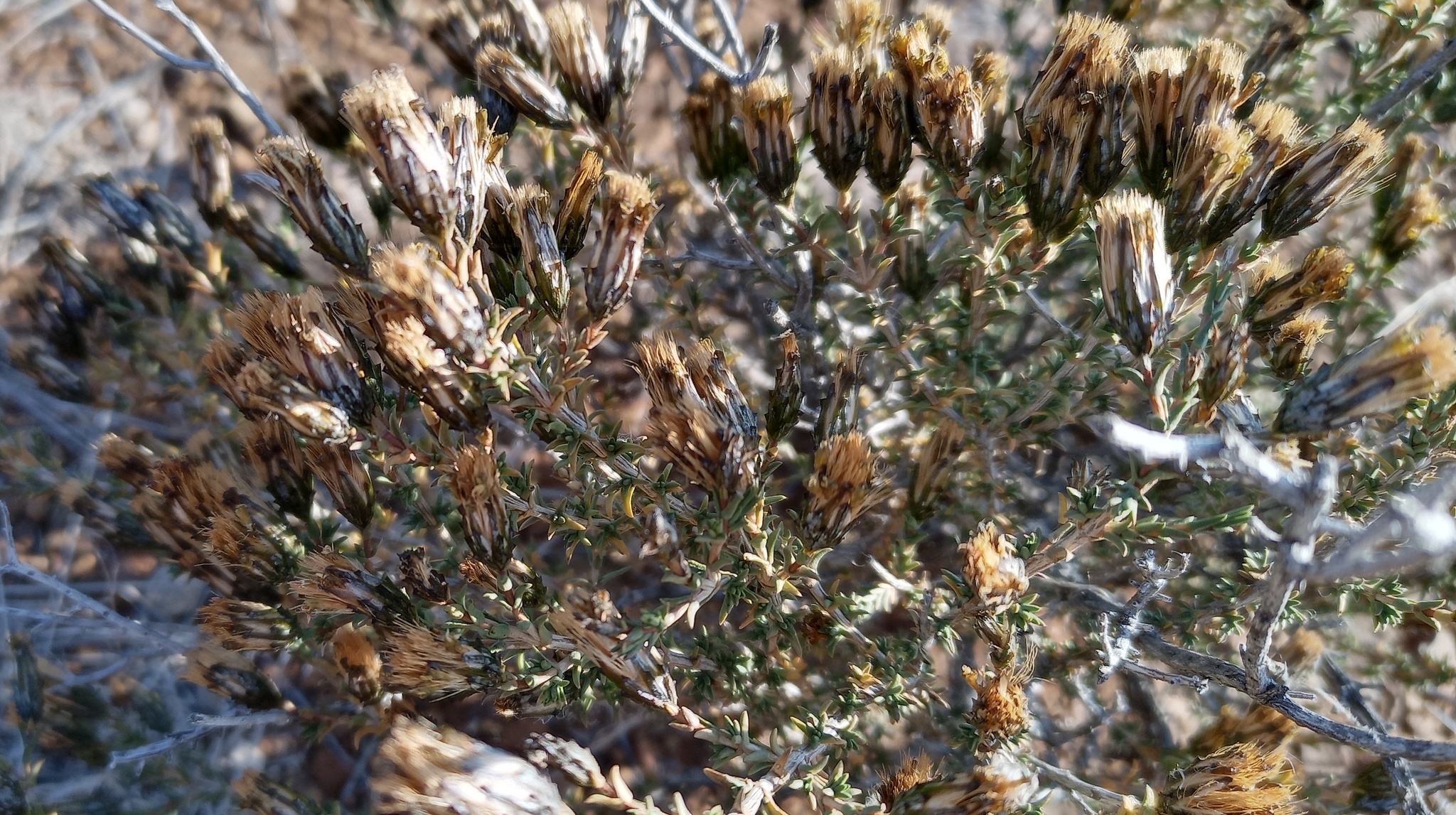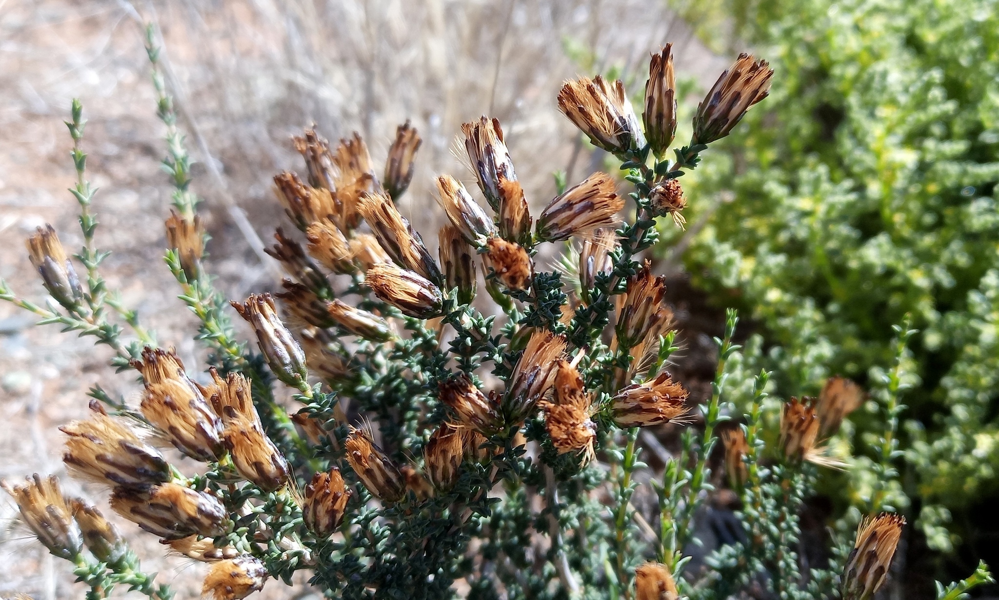 Small shrub, 0.2-0.6 m high. Leaves opposite, subconnate at base, closely set, linear or lanceolate-linear, obtuse, ericoid, glabrous, minutely puberulous when young. Capitula discoid, terminal, solitary or few together, subcorymbosely arranged; involucral bracts in several rows, imbricate, oblong-linear, obtuse, green along middle with membranous margins, glabrous. Florets yellow. Flowering time July-Sept. Pappus of straw-coloured, subplumose bristles, outer more slender than inner. Cypselae oblong, densely long-hairy. From: Cron, GV; et al. 2019. Asteraceae. In: CL Bredenkamp (ed.), A Flora of the Eastern Cape Province. Strelitzia 41(1): 423-682. South African National Biodiversity Institute, Pretoria. [CC BY]