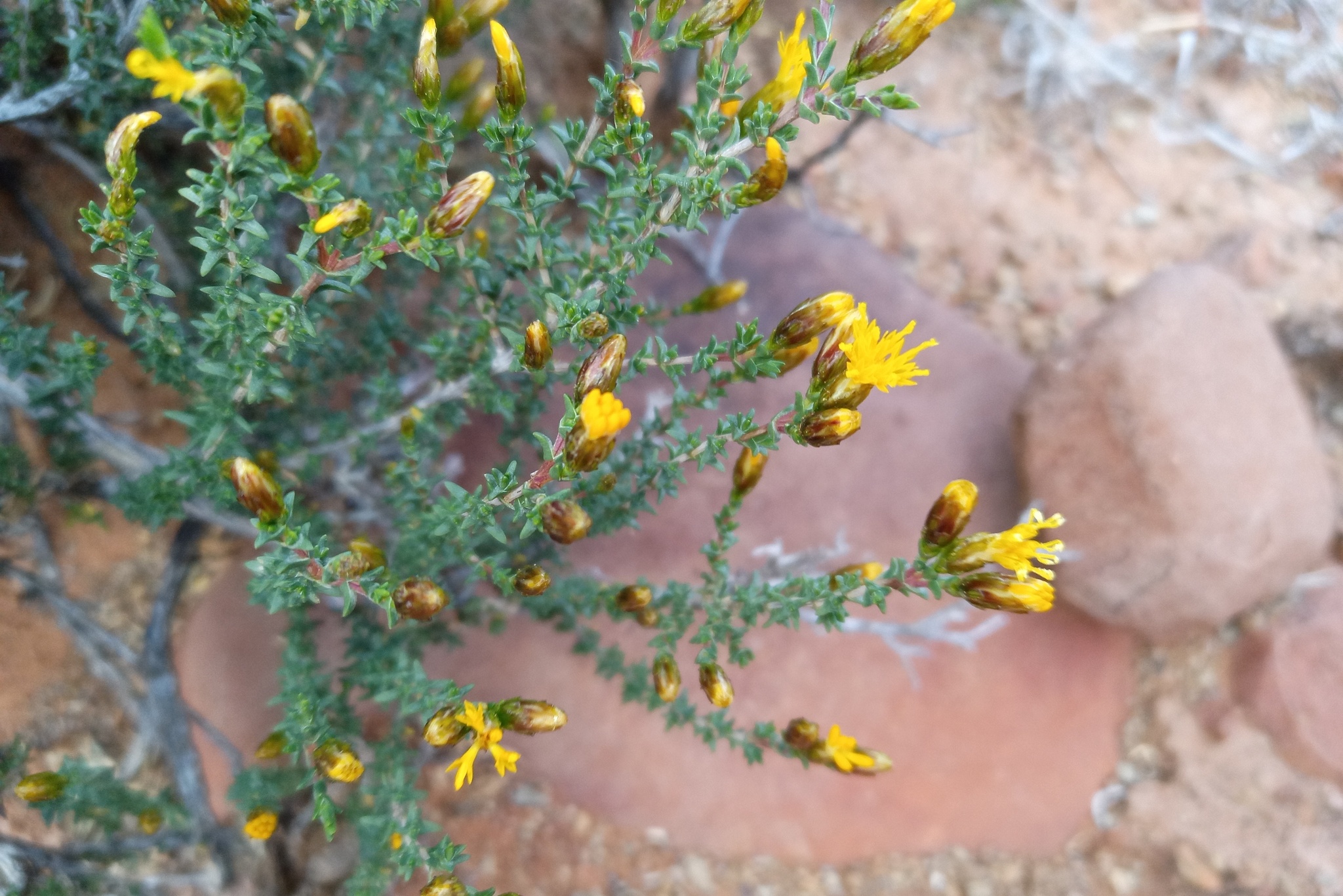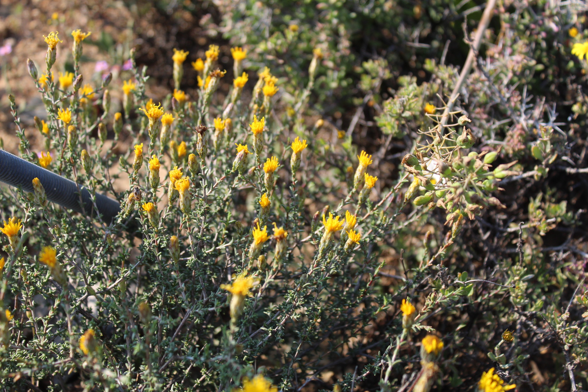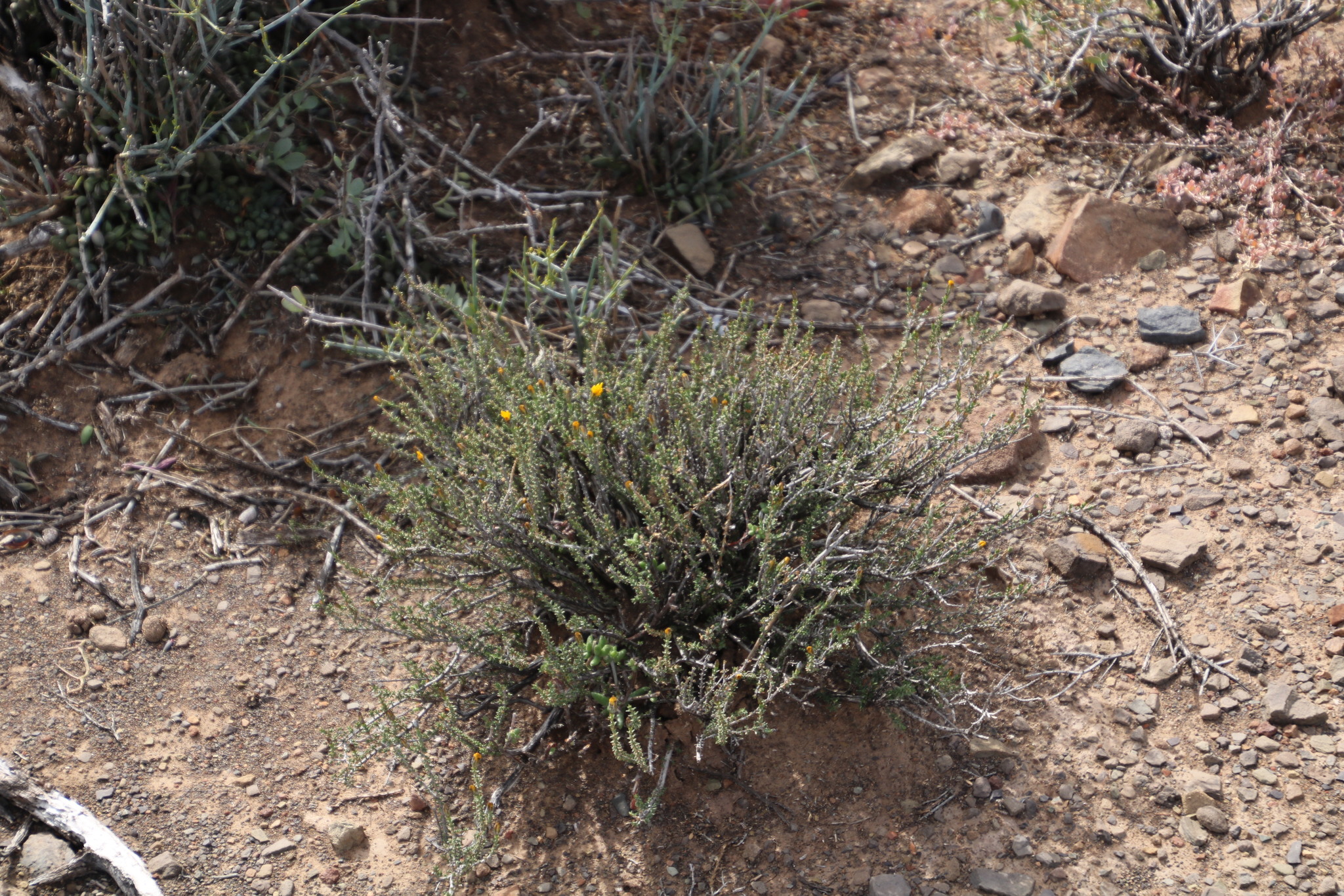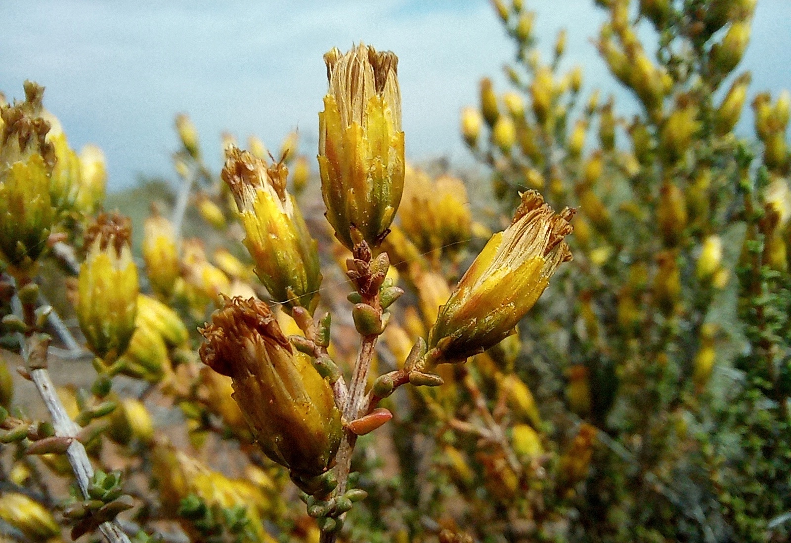 Small shrub, 0.2-0.6 m high. Leaves opposite, subconnate at base, closely set, linear or lanceolate-linear, obtuse, ericoid, glabrous, minutely puberulous when young. Capitula discoid, terminal, solitary or few together, subcorymbosely arranged; involucral bracts in several rows, imbricate, oblong-linear, obtuse, green along middle with membranous margins, glabrous. Florets yellow. Flowering time July-Sept. Pappus of straw-coloured, subplumose bristles, outer more slender than inner. Cypselae oblong, densely long-hairy. From: Cron, GV; et al. 2019. Asteraceae. In: CL Bredenkamp (ed.), A Flora of the Eastern Cape Province. Strelitzia 41(1): 423-682. South African National Biodiversity Institute, Pretoria. [CC BY]
