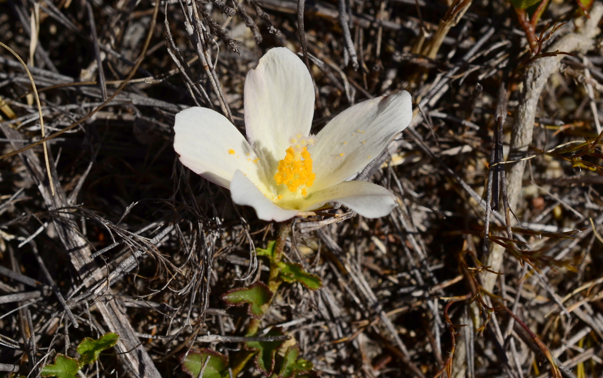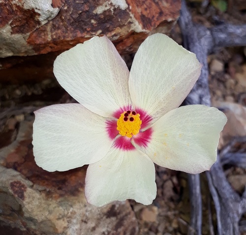 Perennial herb, 0.05-0.50 m high; rootstock woody. Leaves ± suborbicular in outline, not lobed to deeply 3-5-palmatisect, lobes narrowly elliptic, sharply toothed or pinnatifid. Flowers axillary, solitary; peduncles up to 120 mm long, inconspicuously articulated near apex. Epicalyx of 8-11 acicular bracts. Calyx with lobes narrowly lanceolate-triangular, acute. Petals obovate, yellow, crimson-centred (rarely purplish). Staminal tube 4-8 mm long; filaments up to 8 mm long. Flowering time Oct.-May. Fruit a capsule, hispid on margins of valves. Seeds with reddish brown silky floss. Flowers rarely purplish. From: Bredenkamp, CL. 2019. Malvaceae s.l. In: CL Bredenkamp (ed.), A Flora of the Eastern Cape Province. Strelitzia 41(2): 1181-1216. South African National Biodiversity Institute, Pretoria. [CC BY]