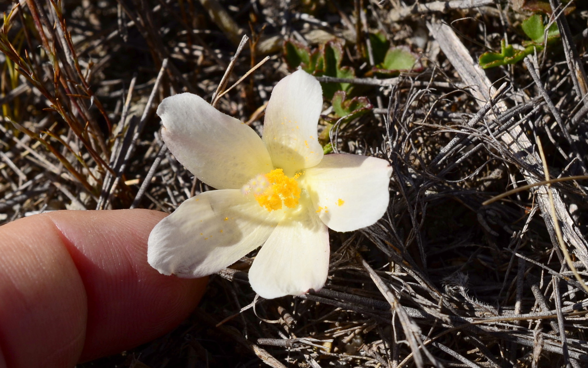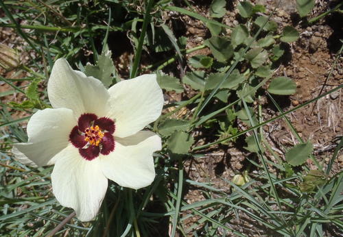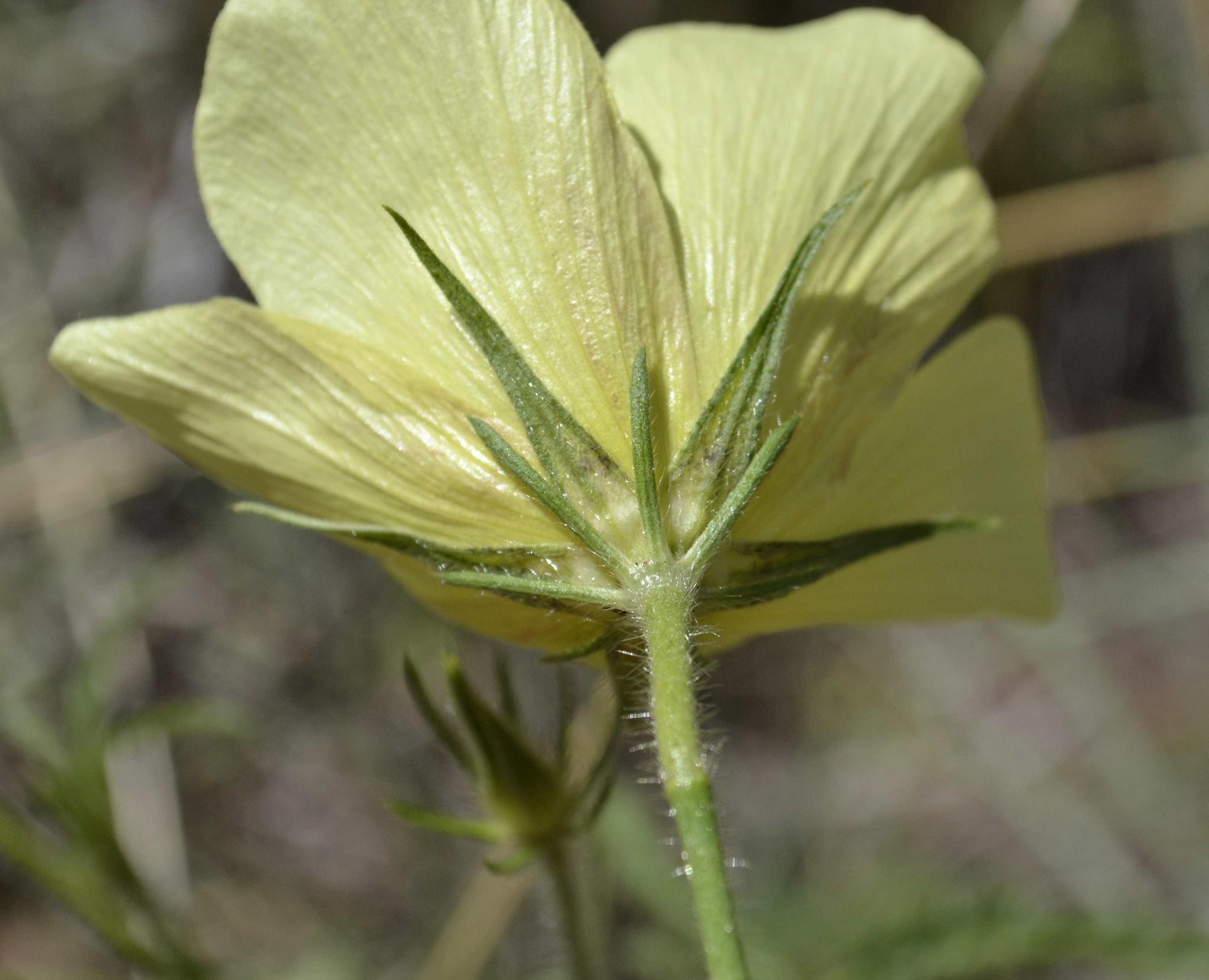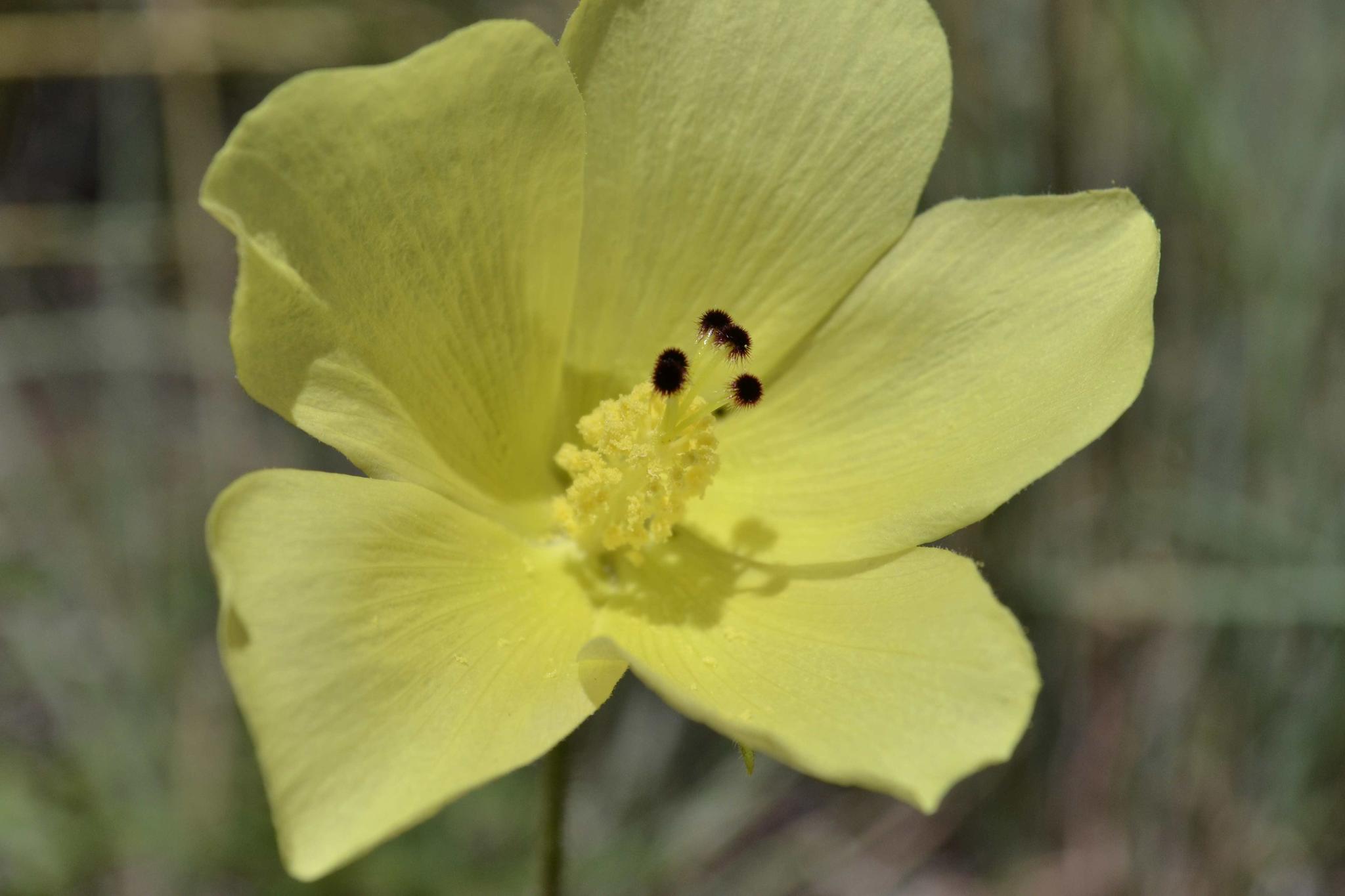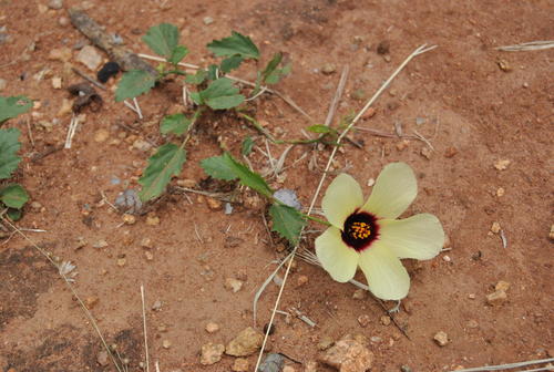General notes: Growing in dry stony mixed bushveld on east side of the road. Slender herb with stems ± 350 mm tall, from a perennial root. Flowers pale lemon yellow, centre purple.