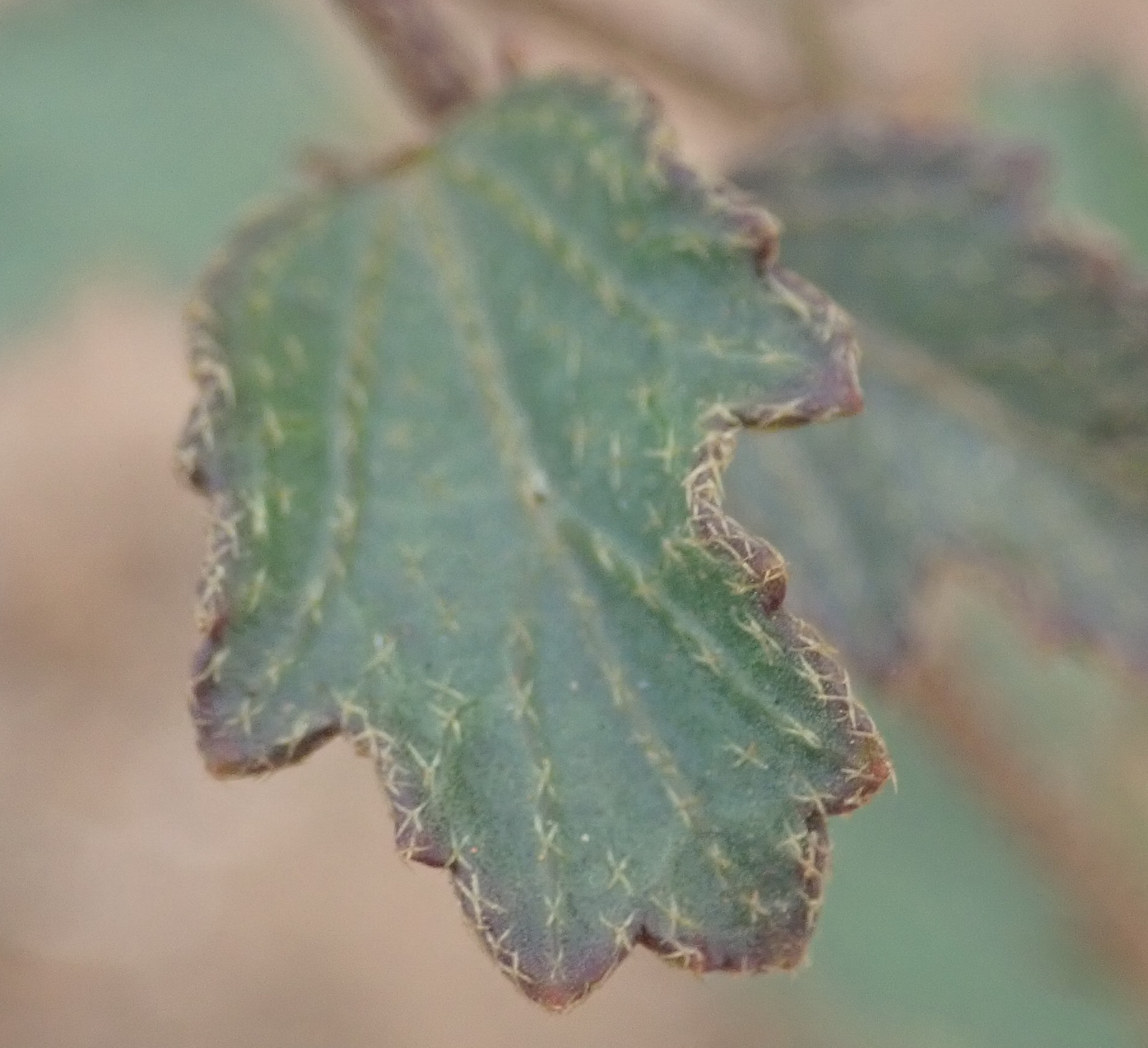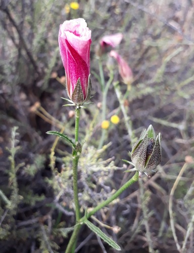 Perennial herb, 50-300 mm high. Leaves with blade undivided to deeply 3-5 palmatisect, 50-60 x 20-45 mm, nearly glabrous to hispid, lobes narrowly elliptic to sharply toothed or pinnatifid. Flowers: epicalyx with > 5 segments; petals 10-45 mm long, yellow (rarely pink) with purple or crimson centre; Sep.-May. Seeds with a silky or cottony floss at maturity. From: Retief, E; Meyer, NL. 2017. Malvaceae. In: E Retief & NL Meyer (eds), Plants of the Free State: Inventory and identification guide. Strelitzia 38: 631-651. South African National Biodiversity Institute, Pretoria. [CC BY]