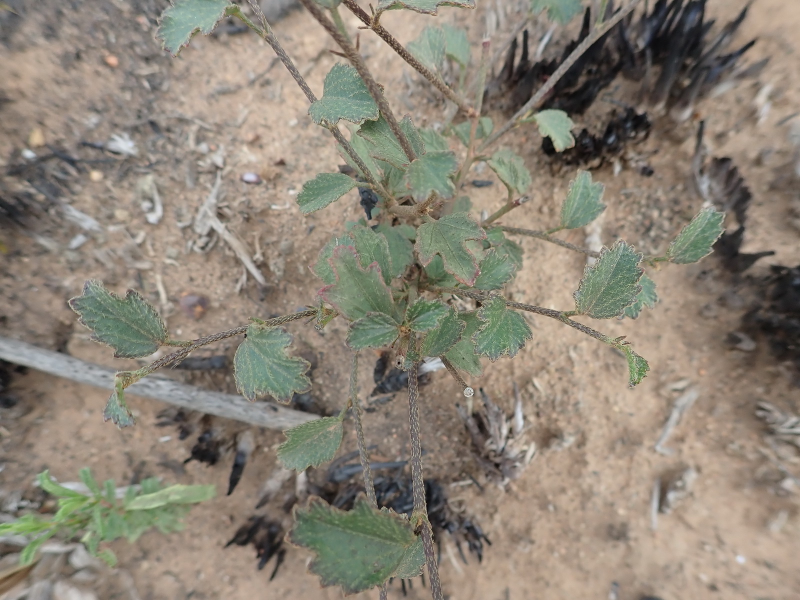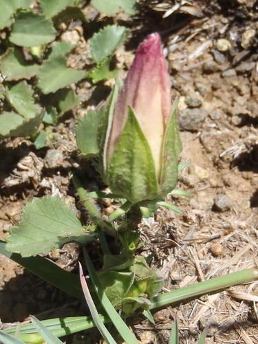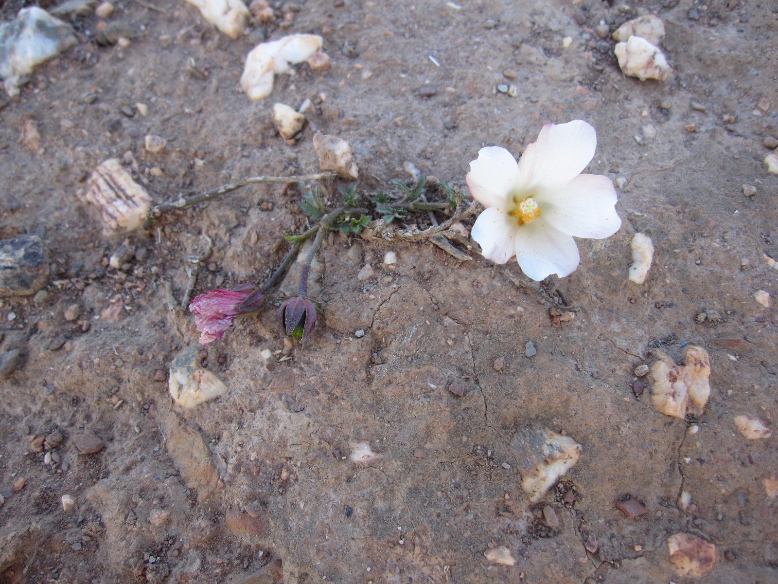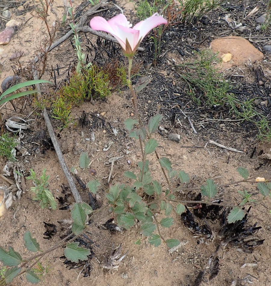 Glabrescent subshrub with slender branches to 60 cm, from woody rootstock. Leaves 3-5-palmatisect, lobes linear-oblong, usually toothed. Flowers axillary, on long peduncles, cream-coloured to yellow or pink, sometimes with dark eye, calyx lobes attenuate, epicalyx of 10-12 linear lobes, staminal tube 4-8 mm long; seeds with silky floss. From: Manning, JC; Goldblatt, P. 2012. Malvaceae. In: J Manning & P Goldblatt (eds), Plants of the Greater Cape Floristic Region 1: The Core Cape flora. Strelitzia 29: 613-621. South African National Biodiversity Institute, Pretoria. [CC BY]