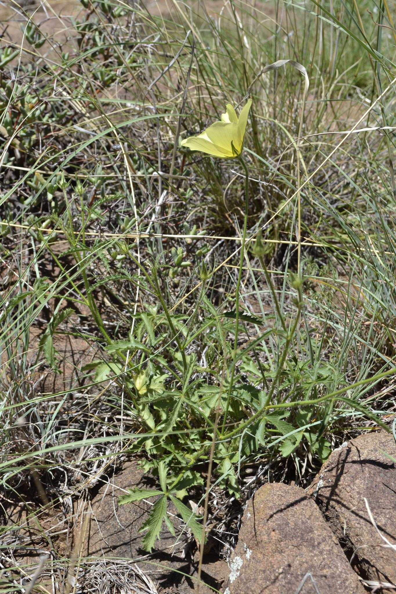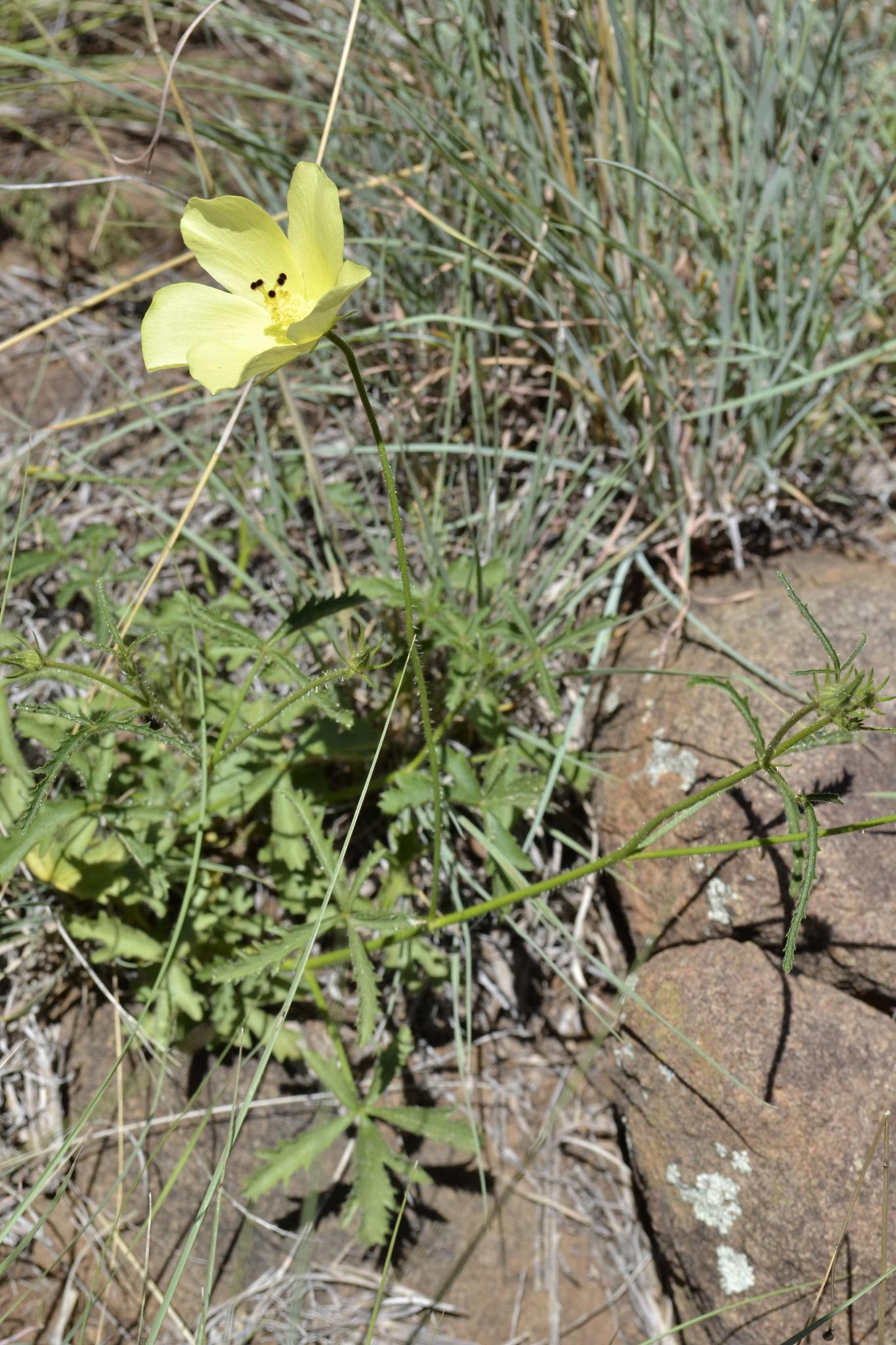 Perennial herb, 50-300 mm tall. Leaves not lobed to deeply 3-5-palmatisect, nearly glabrous to hispid, lobes narrowly elliptic to sharply toothed or pinnatifid. Petals 10-45 mm long. Flowers yellow (rarely pink) with purple or crimson centre. From: Retief, E; Herman, PPJ. 1997. Plants of the northern provinces of South Africa: Keys and diagnostic characters. Strelitzia 6: 1-681. National Botanical Institute, Pretoria. [CC BY]