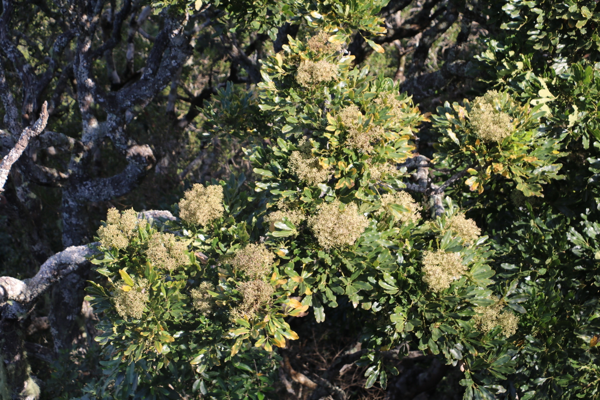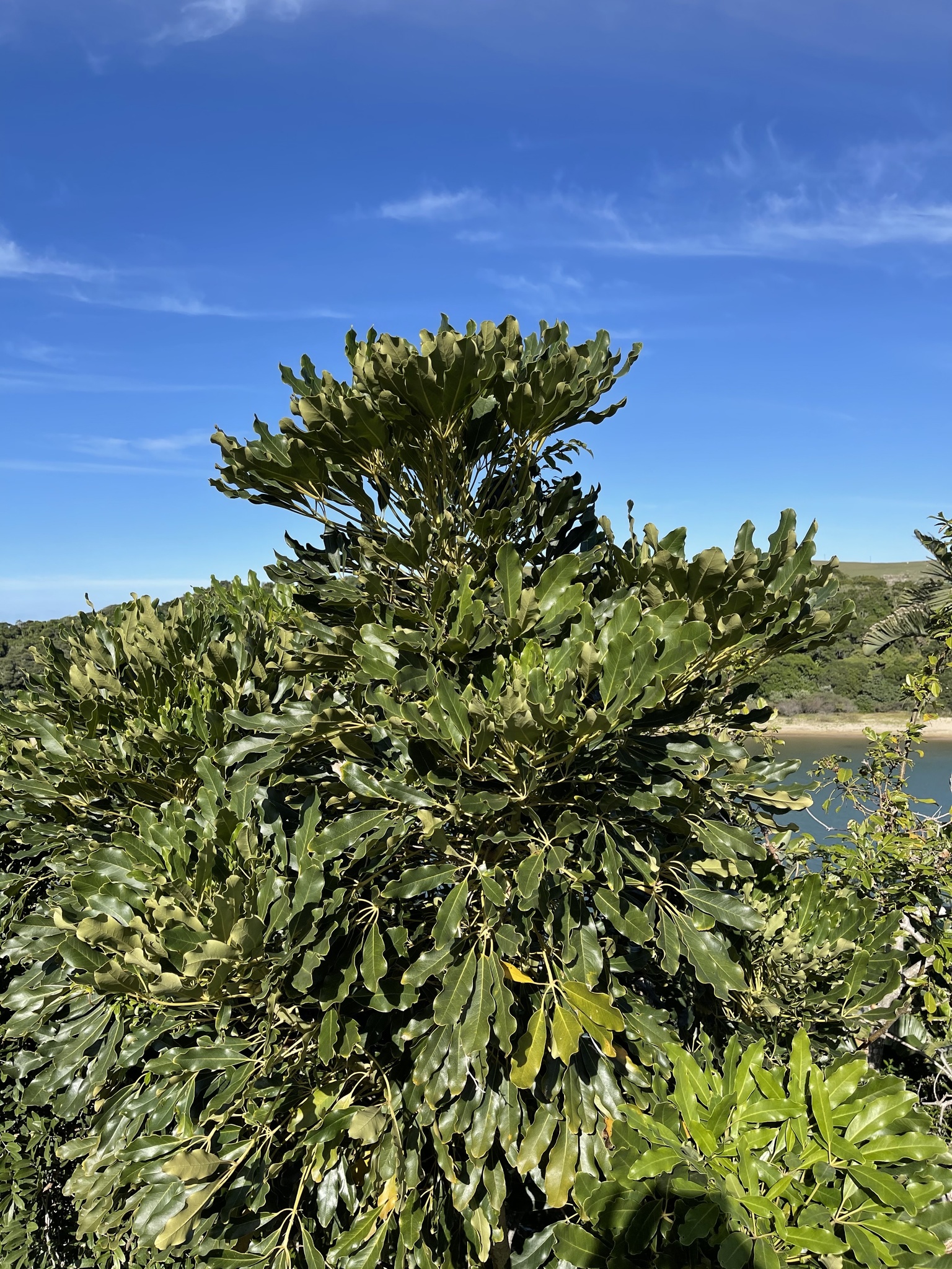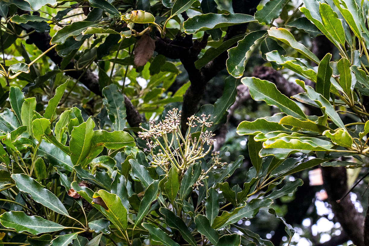 Perennial tree, rounded crown, up to 6-20 m high. Bark grey-brown, smooth with lenticels when young, becoming rough and longitudinally fissured. Leaves digitate, with 3-5 leaflets spirally arranged, crowded at ends of branches; leaflets oblong to elliptic, 70-150 x 20-50 mm, leathery, lower surface pale green, upper dark green, base tapering, apex broadly tapering to rounded, margins entire, rarely toothed on upper half, wavy; petioles up to 250 mm long; stipules absent; petiolules slender, 10-40 mm long. Flowers in umbel of panicles, large, loose, terminal heads, up to 180 mm in diam.; small, greenish cream-coloured to yellow. Flowering time Jan.-May. Fruit almost round, up to 2-3 mm in diam., greyish green becoming dark red (Apr.-Aug.). From: De Villiers, BJ. 2019. Araliaceae: Schefflera J.R.Forst. & G.Forst. In: CL Bredenkamp (ed.), A Flora of the Eastern Cape Province. Strelitzia 41(1): 421-421. South African National Biodiversity Institute, Pretoria. [CC BY] As: Schefflera umbellifera (Sond.) Baill.