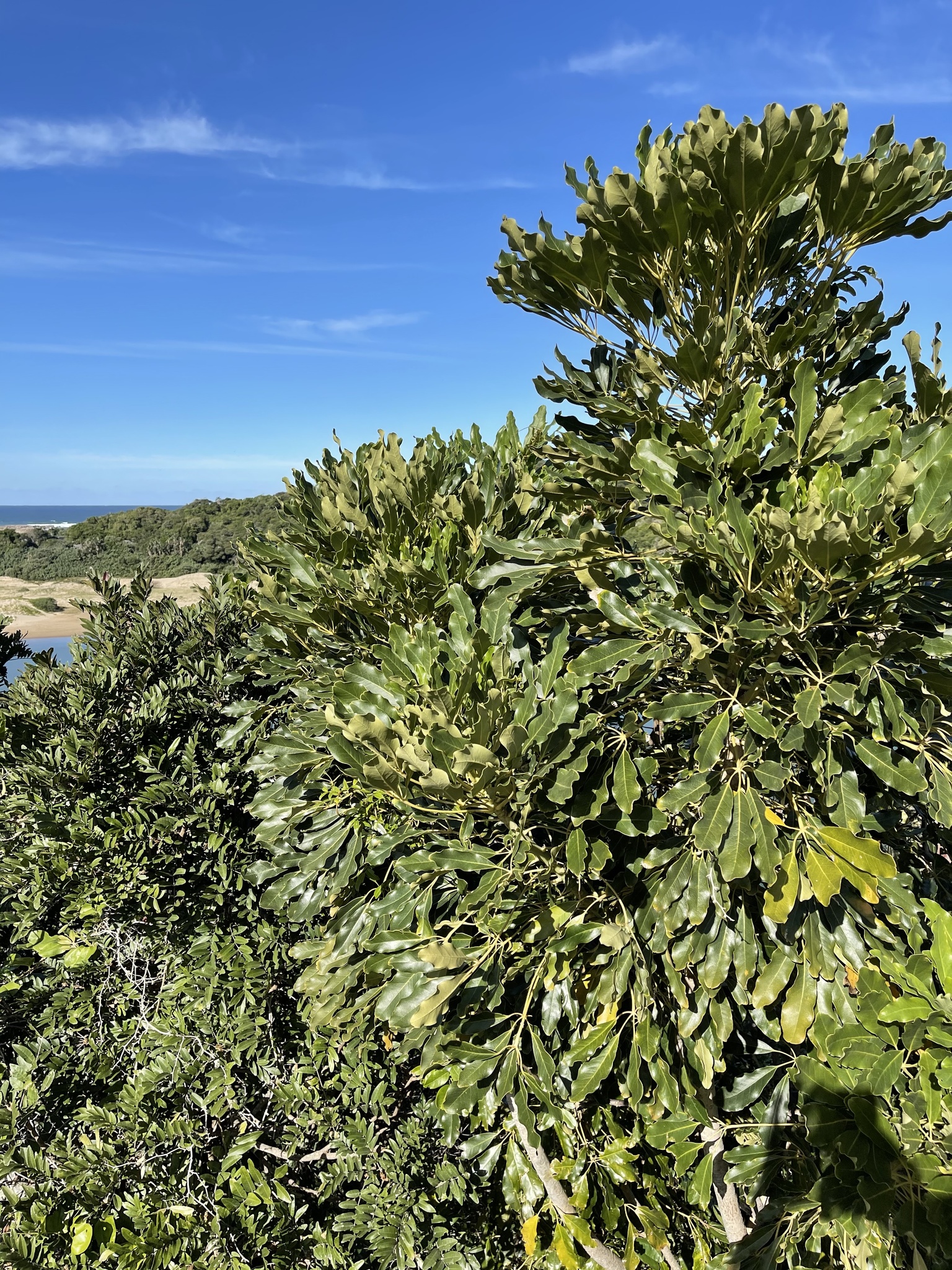 Margins and in coastal and montane forests, alt. 60-1980 m. Indian Ocean Coastal Belt, Indigenous Forests, Albany Thicket, Eastern Fynbos-Renosterveld. From: De Villiers, BJ. 2019. Araliaceae: Schefflera J.R.Forst. & G.Forst. In: CL Bredenkamp (ed.), A Flora of the Eastern Cape Province. Strelitzia 41(1): 421-421. South African National Biodiversity Institute, Pretoria. [CC BY] As: Schefflera umbellifera (Sond.) Baill.