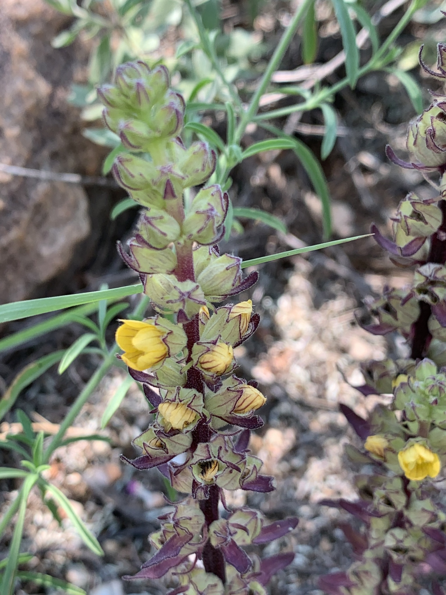 Annual herb, parasite, 0.1-0.6 m high; stem erect, simple or branched near base, pubescent to subglabrous. Leaves 3.5-13.0 x 1-2 mm, scale-like, opposite or alternate, lanceolate to ovate-oblong, entire, hispid, apex obtuse. Inflorescence a spike with many, small, orange-yellow flowers, red-veined on reverse, in axils of upper leaves. Bracts linear to oblong, hispid-pubescent. Calyx campanulate, externally pubescent, internally glabrous; lobes ovate or obtuse, ± equal. Corolla veined; lobes elliptic, obtuse or spathulate. Stamens Sub-Equal; filaments ± glabrous; anthers elliptic, obtuse. Ovary globose, glabrous; style compressed; stigma simple, glabrous. Flowering time Feb., Mar. From: Smithies, SJ; Magwaza, ZL. 2019. Orobanchaceae. In: CL Bredenkamp (ed.), A Flora of the Eastern Cape Province. Strelitzia 41(2): 1268-1280. South African National Biodiversity Institute, Pretoria. [CC BY]