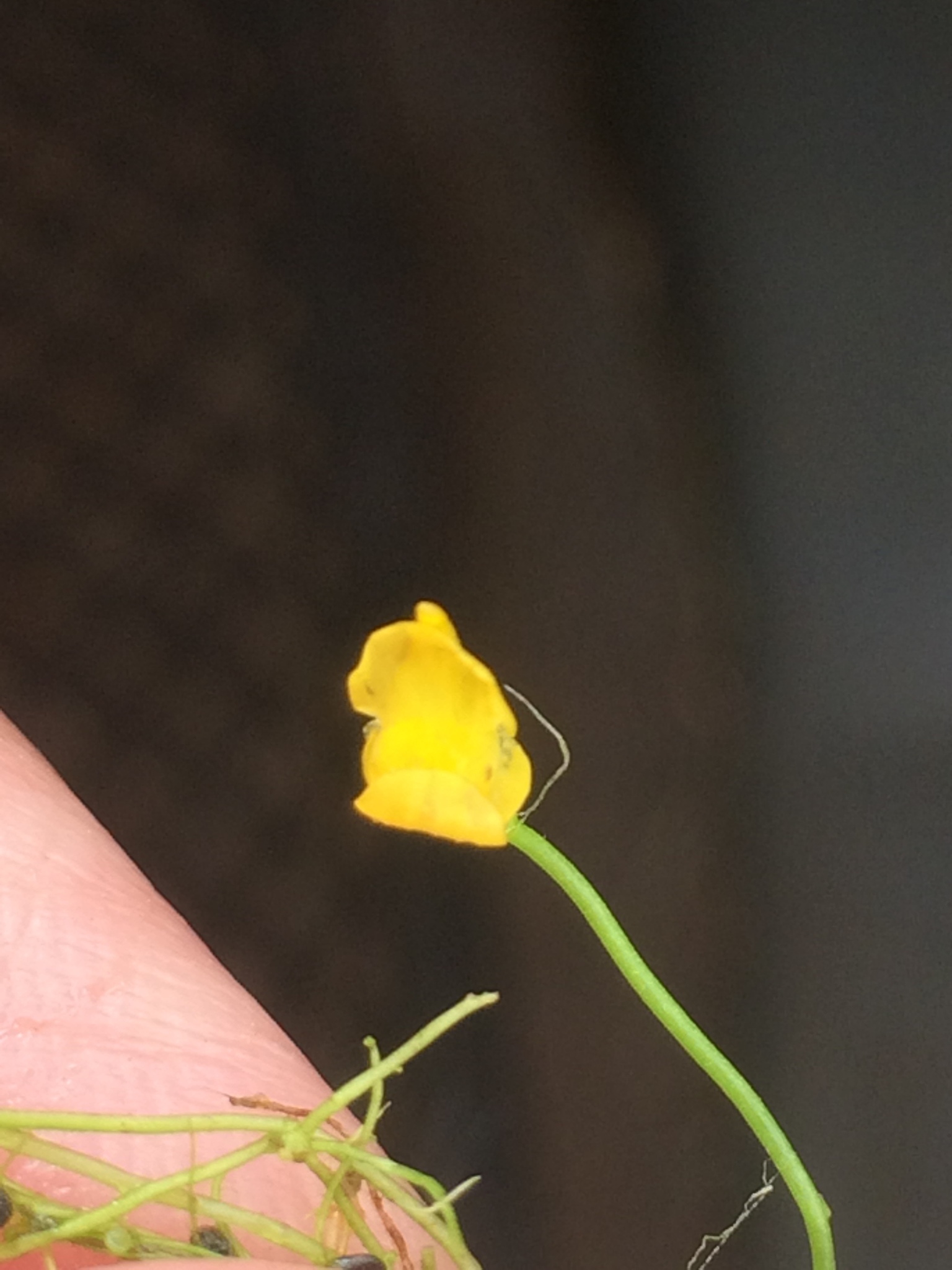 Small to medium sized, annual or perennial, affixed or suspended aquatic. Rhizoids absent or present, filiform, a few cm long, 0.2-0.4 mm thick, bearing a few very short, dichotomously divided branches with curved, papillose, apically obtuse segments; sometimes the rhizoids with an indefinite apical transformation as a stolon. Stolons usually numerous, much branched and often mat-forming, filiform, terete, glabrous, up to 20 cm long or longer, 0.2-1 mm thick, sometimes somewhat thicker and spongy. Leaves numerous, 0.5-1.5 cm long, ± uniform, the primary segments 2 (or sometimes reduced to 1), sparsely dichotomously branched into up to 8 (but usually not more than 4) ultimate segments, or sometimes 1 branch of each dichotomy replaced by a trap, the ultimate segments capillary, slightly flattened, laterally entire or sparsely denticulate, the apex of the segments and of the lateral teeth when present setulose. Traps rather few, lateral on the primary to penultimate segments, ovoid, stalked, 1-2.5 mm long, the mouth lateral with 2 dorsal, setiform, branched appendages and further dorsal, lateral and ventral setae, the internal glands 2- and 4-armed, the arms narrowly ovoid, with apex acute, 10-40 µ long, 1.5-6 times as long as wide, the quadrifids with both pairs ± equally slightly divergent. Inflorescence erect, emergent, (or sometimes submersed, much reduced and with cleistogamous flowers), 1-20(-30) cm long, solitary or frequently 2 or more arising together or in succession; peduncle filiform, terete, glabrous, ± straight, 0.4-0.8 mm thick. Scales usually 1, sometimes 2, at or near the middle of the peduncle, similar to the bract, or frequently absent. Bracts basifixed, semi-amplexicaul, approximately semicircular, with apex rounded, truncate or obscurely dentate, c. 1 mm long, minutely glandular, obscurely nerved. Bracteoles absent. Flowers (1-)2-6(-12), the raceme axis short to elongate; pedicels erect or spreading, filiform, terete, 0.2-3 cm long. Calyx lobes subequal, broadly ovate or circular with apex rounded, 1-3 mm long. Corolla yellow, often with reddish-brown nerves, 4-25 mm long; upper lip broadly ovate to almost circular, usually ± obscurely to distinctly 3-lobed; lower lip limb usually slightly smaller, circular to transversely elliptic, the base with a prominent, rounded, bilobed swelling, the apex rounded, entire; palate densely pubescent with simple unicellular hairs; spur narrowly conical or narrowly cylindrical from a conical base with apex obtuse or ± obscurely bifid, a little shorter than to distinctly longer than the lower lip, the distal part externally, sparsely, minutely stipitate-glandular. Filaments curved, 1-1.5 mm long, the anther thecae ± confluent. Ovary globose; style distinct; stigma lower lip transversely elliptic, the upper lip obsolete. Capsule globose, 2-3 mm in diameter, the wall membranous, tardily laterally bivalvate. Seeds imbricate on the placenta, thickly lenticular, approximately circular in dorsal view, 0.8-1 mm in diameter, with a relatively broad, thick wing, the wing produced to form a rounded lobe on that part of the margin which, in situ on the placenta, is nearest the apex of the capsule, the rest of the margin shallowly and irregularly dentate, the ventral surface smooth or sometimes with multicellular, obtusely conical processes, the testa cells small, slightly elongate, with the anticlinal boundaries sunken, the periclinal walls smooth, convex, but with the central area collapsing and becoming concave. Flowering more or less throughout the year when conditions are suitable. From: Taylor, PG. 1989. The genus Utricularia- a taxonomic monograph. Kew Bull., Addit. Ser. 14: 1-736. [All rights reserved]