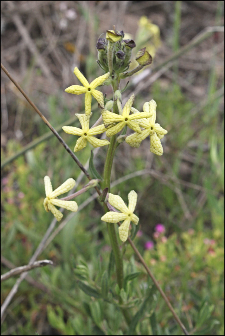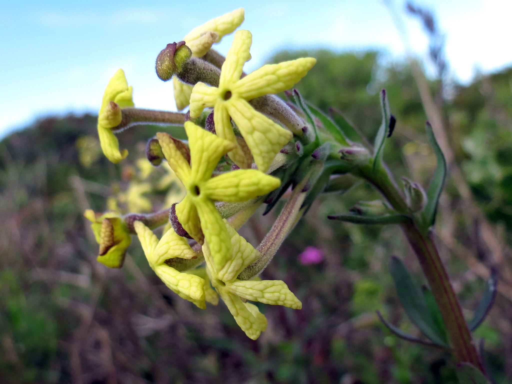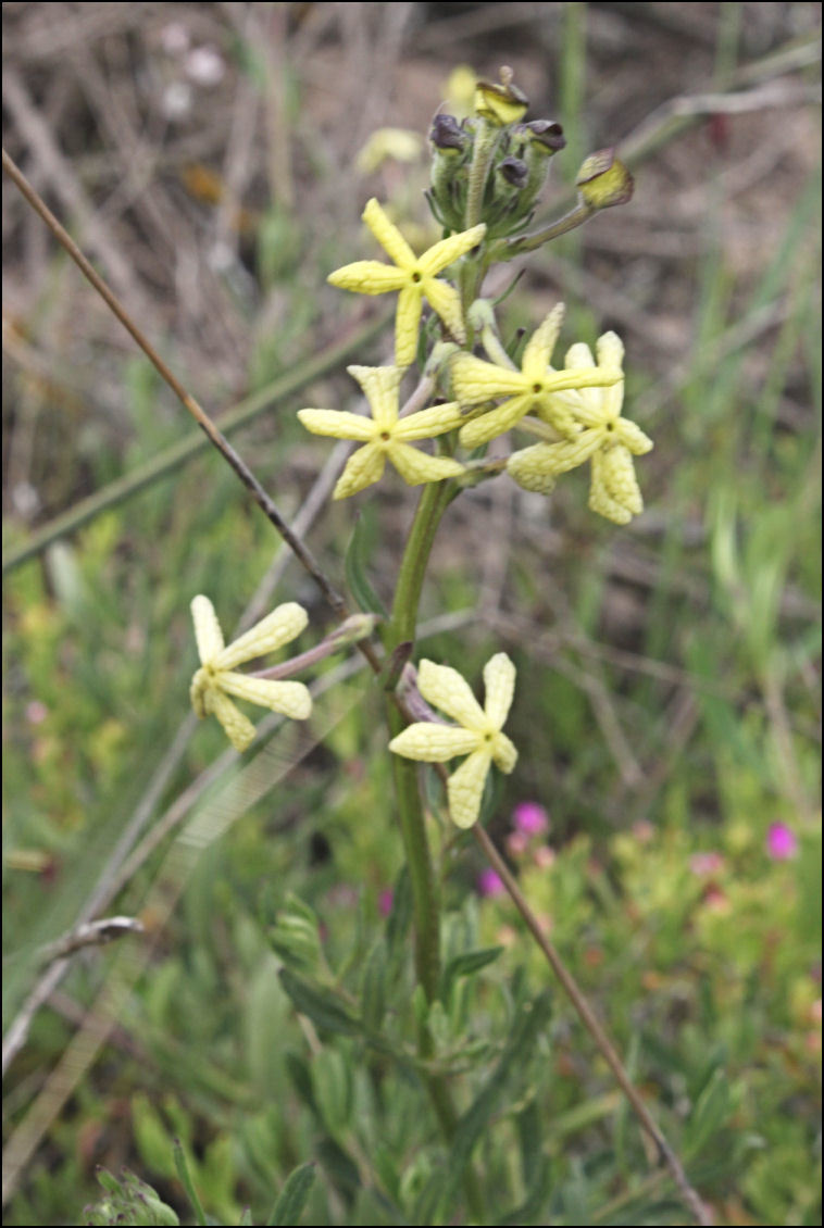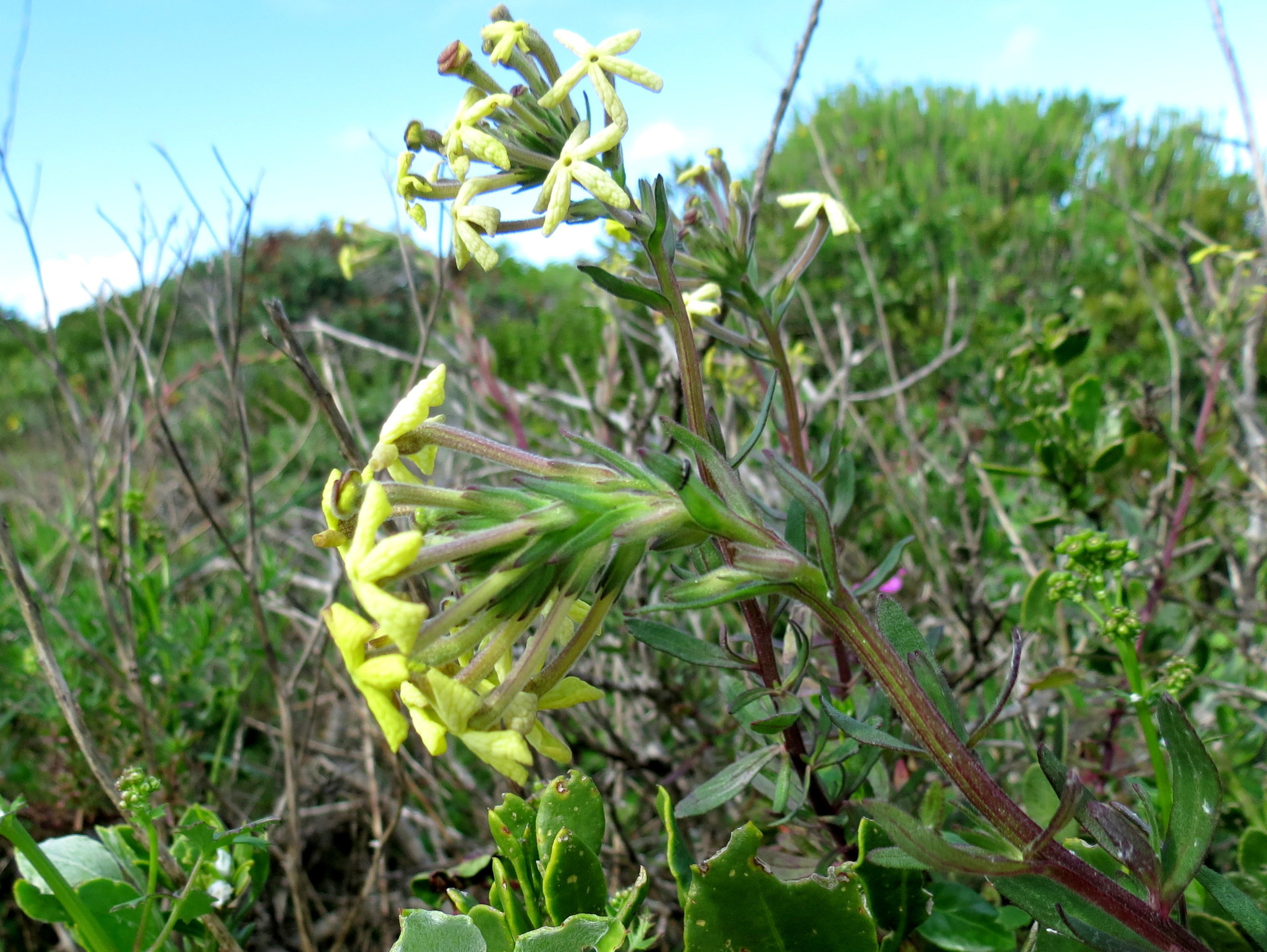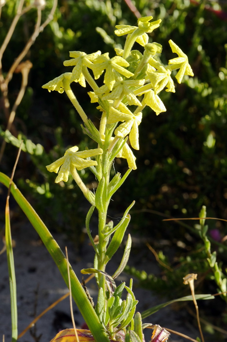 Leafy, glandular-hairy, glistening perennial to 1 m. Leaves mostly in axillary tufts, shortly toothed above. Flowers in racemes, ±15-20 mm diam., tube abruptly inflated above, 23-28 mm long, lobes narrow, greenish to yellow, clove-scented at night, fertile stamens 4. From: Manning, JC; Goldblatt, P. 2012. Scrophulariaceae: Lyperia Benth. In: J Manning & P Goldblatt (eds), Plants of the Greater Cape Floristic Region 1: The Core Cape flora. Strelitzia 29: 744-745. South African National Biodiversity Institute, Pretoria. [CC BY]