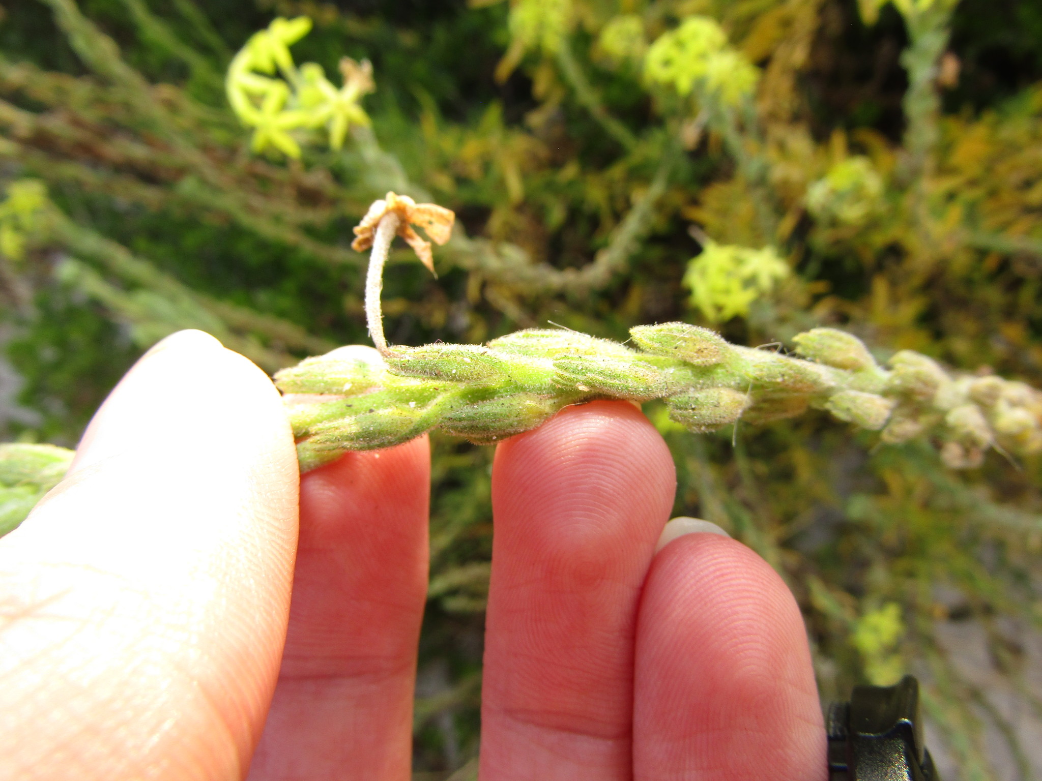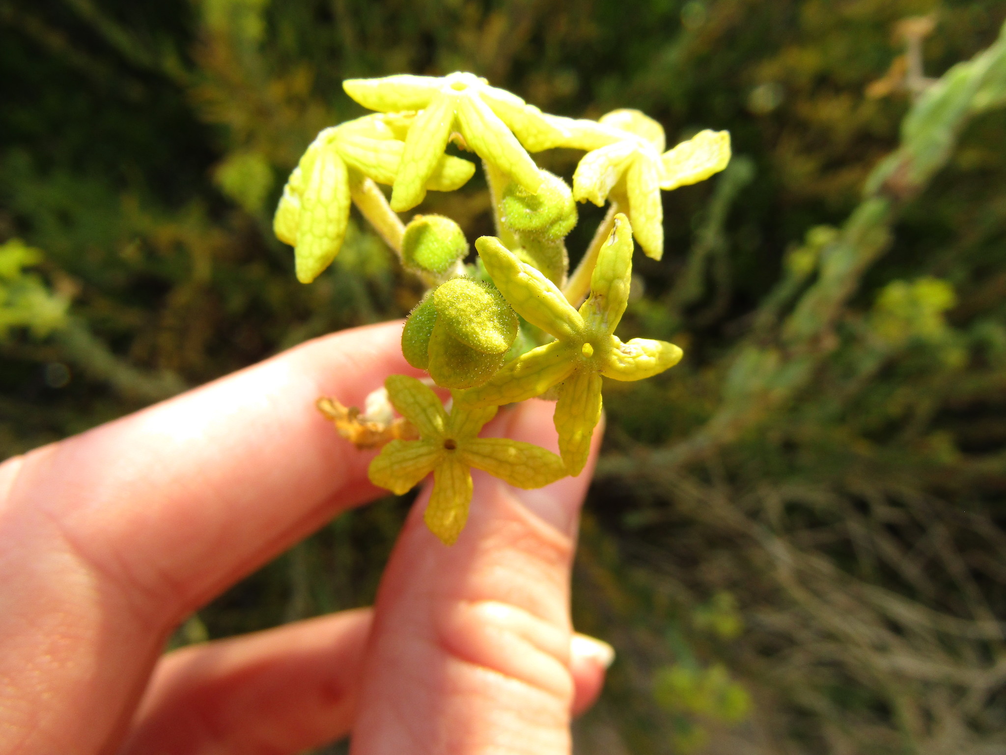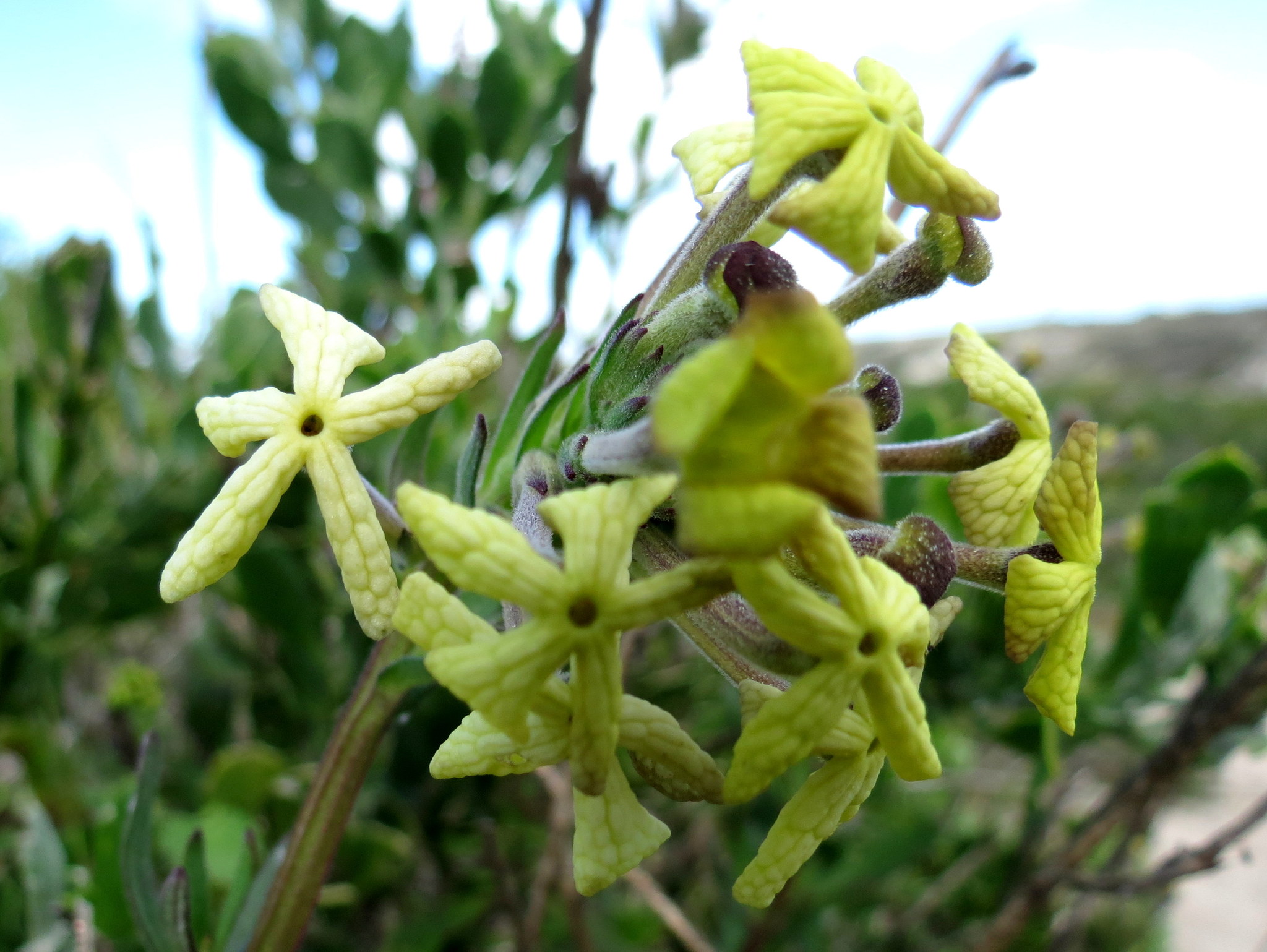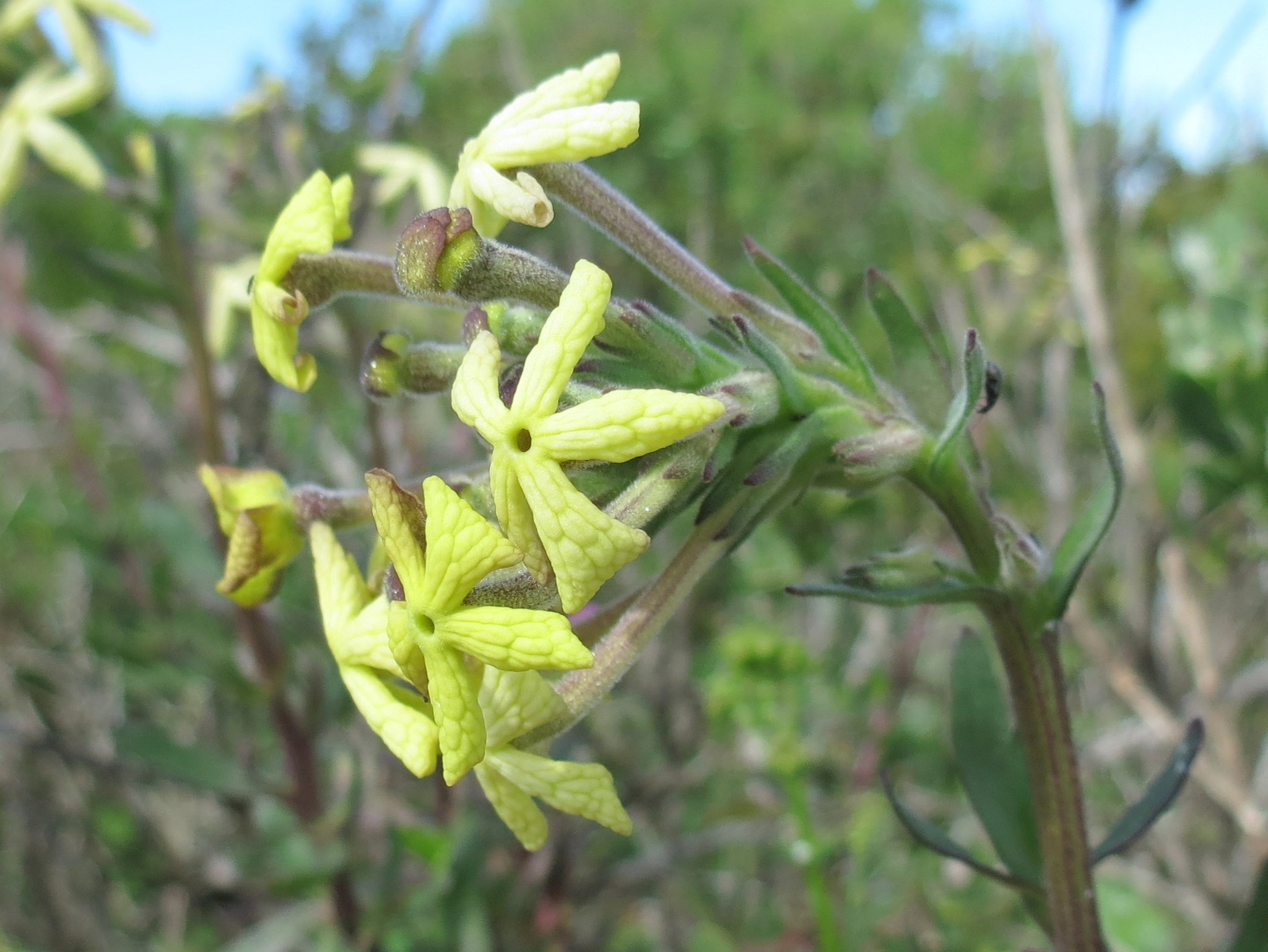 Perennial herb branching from the base and above, branches ± erect, decumbent or sprawling, eventually forming a bushy clump up to 0.5-1 m tall and as much across, main stems c. 4-8 mm in diam., glandular pubescent, hairs c. 0.2-0.3 mm long, glistening glands as well, leafy, whole plant blackening on drying. Leaves opposite to alternate, pseudofasciculate, the leaf tufts often elongating into short branchlets, primary leaves c. 30-65 x 4-13 mm, smaller upwards and passing into floral leaves, oblanceolate, obtuse, margins entire to shortly toothed in upper half, both surfaces hairy as the stems. Flowers many, corymbose at first, soon elongating into racemes up to c. 300 mm long, often panicled. Bracts (floral leaves) c. 20-35 x 2-5 mm at base of inflorescence; pair of true bracts ± immediately below calyx, lowermost c. 2.5-4.5 x 0.2-0.7 mm, hairy as leaves. Pedicels (lowermost) 4-7 mm long. Calyx tube c. 0.2-0.5 mm long, lobes 4.5-7 x 0.5-1.25 mm, glandular-pubescent, hairs 0.25-0.5 mm long, glistening glands as well. Corolla tube 23-28 x 1.5-1.8 mm, cylindric, abruptly expanded in throat and there c. 3-4 mm in diam., contracted abruptly to mouth and there c. 1.5 mm in diam., limb nearly regular, rotate, c. 15-21 mm across, lobes 6-9 x 5-7 mm, ± broadly cuneate, margins revolute and therefore lobes look oblong to the eye, tube and backs of lobes glandular-pubescent, hairs up to 0.4-0.6 mm long, glistening glands as well, upper surface of lobes glabrous except for a broad band of minute stalked glands around mouth, these also within upper part of throat above 2 patches of clavate hairs, limb greenish-cream to lime-yellow or primrose yellow, darkening with age, tube sometimes tinged with mauve, sweetly clove-scented at night. Stamens 4, anticous filaments 1-1.5 mm long, anthers 1.2-1.5 mm long, posticous filaments similar but almost knee-jointed, anthers 1.5-2 mm long. Stigma c. 1 mm long, hastate. Style 20-23 mm long. Ovary c. 3 x 1.25 mm, thickly clad in glistening glands, glandular hairs as well c. 0.2-0.3 mm long. Capsules c. 13-23 x 5-7 mm, oblong, valves acute, prominently hairy as ovary. Seeds c. 3.5-4 x 1 mm, elongate, with broad pale wings at both ends, these accounting for c. 2/3 total length of seed. From: Hilliard, OM. 1994. The Manuleae: a tribe of Scrophulariaceae. Edinburgh University Press, Edinburgh. [All rights reserved]