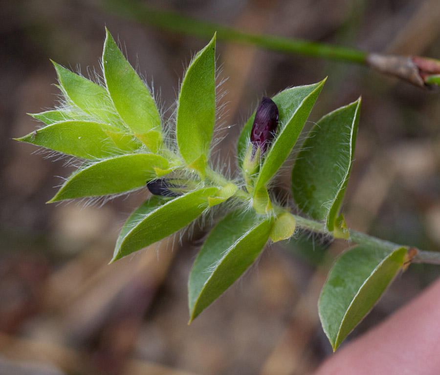 Sprawling, resprouting shrublet to 50 cm. Leaves 1-foliolate, folded flat, broadly elliptic. Flowers on filiform pedicels, deep purple with black nectar patch. From: Stirton, CH; Schutte, AL. 2012. Fabaceae: Psoralea L. In: J Manning & P Goldblatt (eds), Plants of the Greater Cape Floristic Region 1: The Core Cape flora. Strelitzia 29: 571-576. South African National Biodiversity Institute, Pretoria. [CC BY]