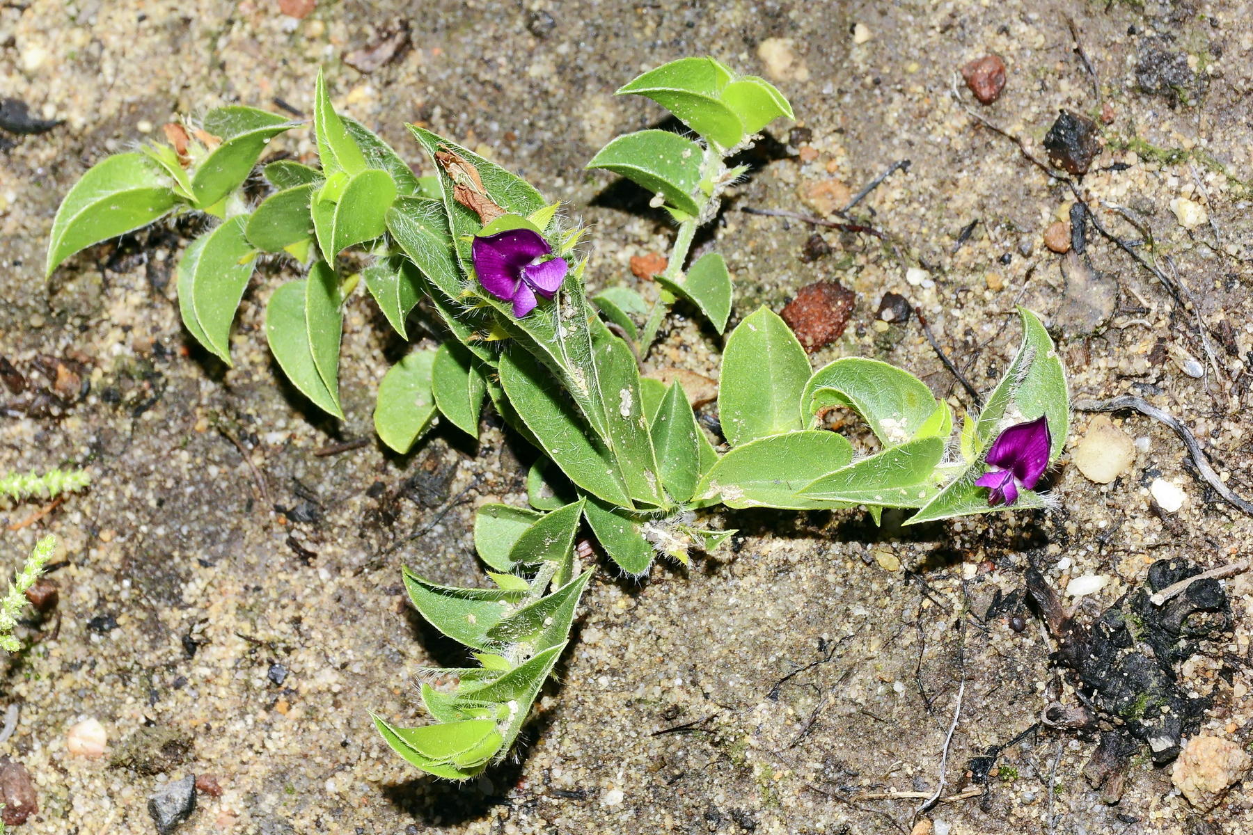 General notes: Fynbos biome. Boland Granite Fynbos vegetation. Stream bank. Moist/damp, sandy soil. Granite. Full sun. Moderate slope. E aspect. Recently burned. Dwarf shrub. Flowers purple, auxillary. Leaves alternate, cordate, hairy. Plant height ±15 cm. Decumbent shrub.