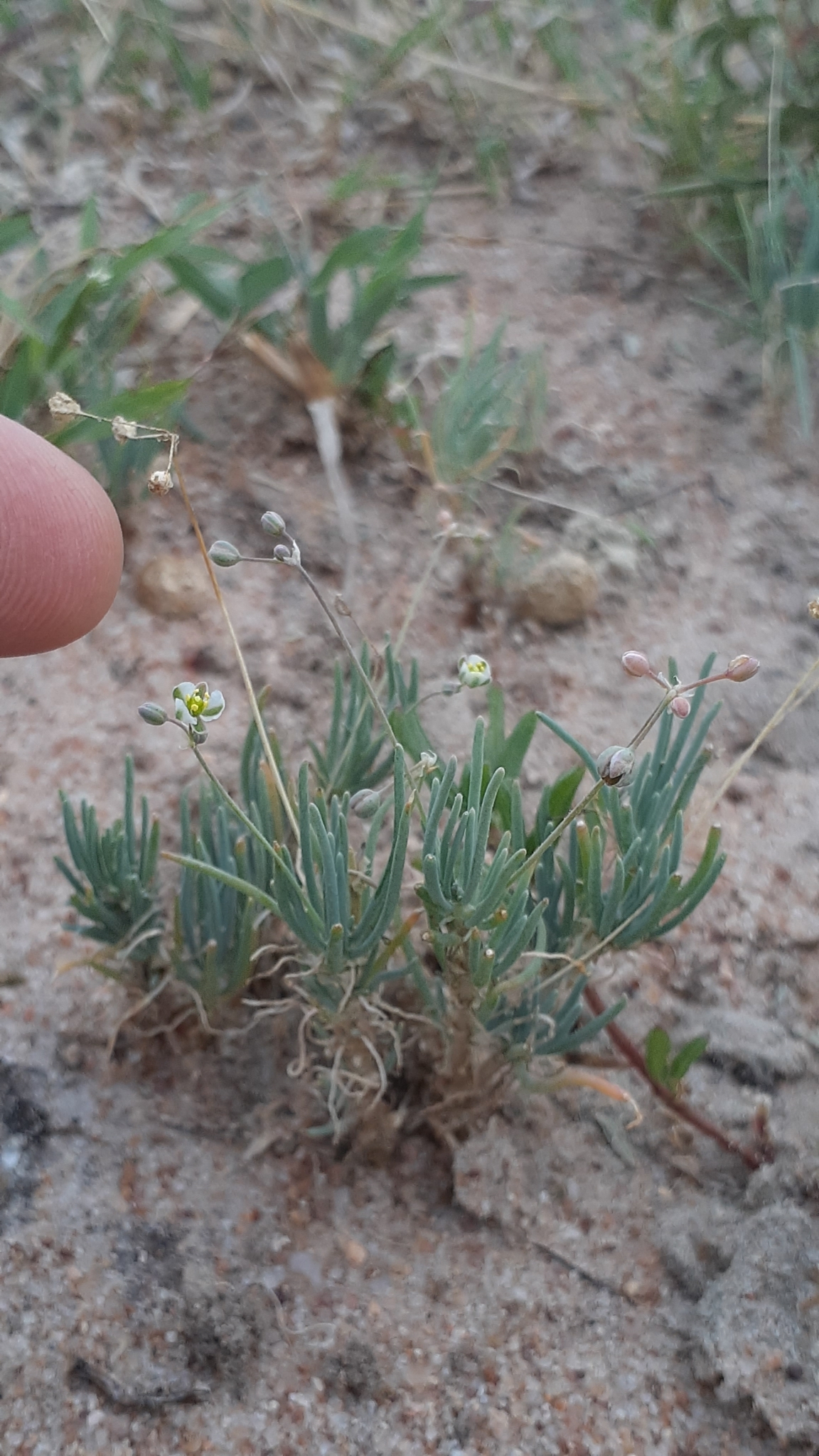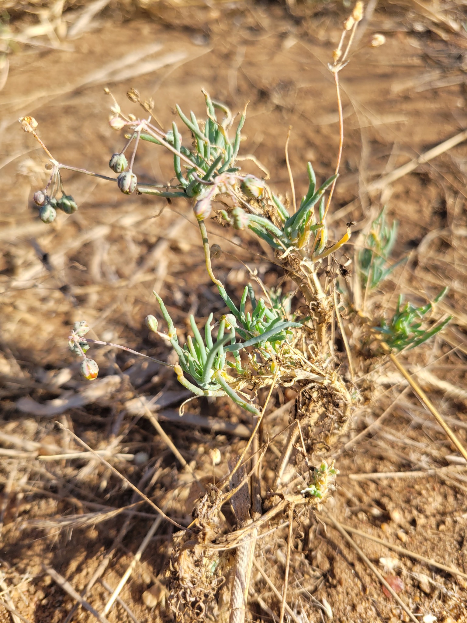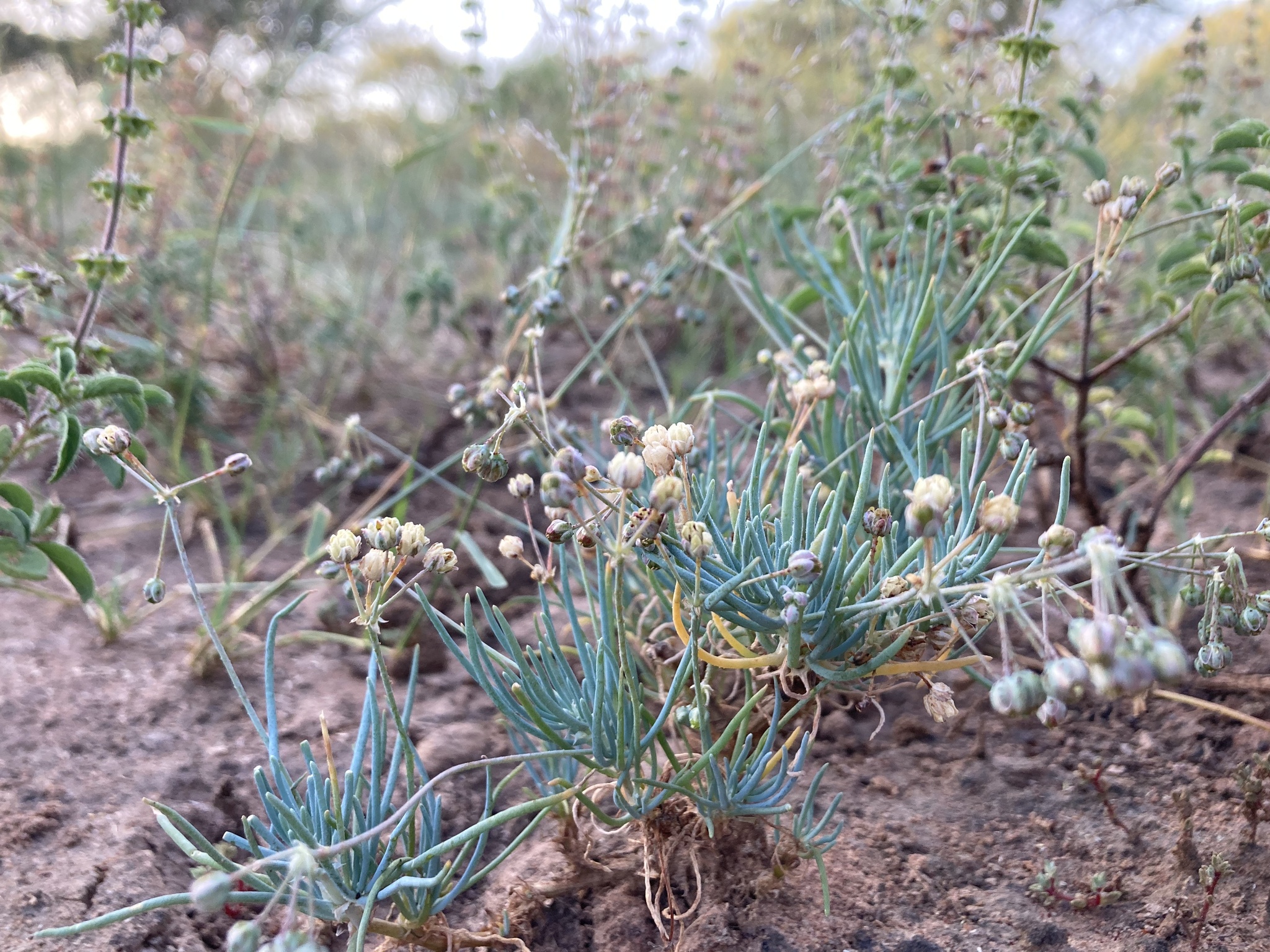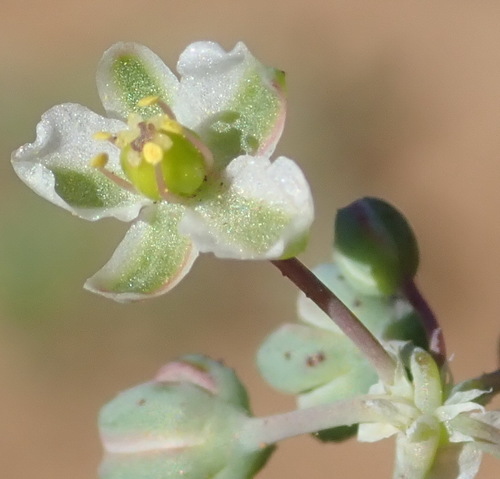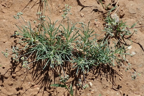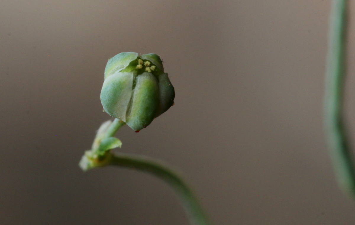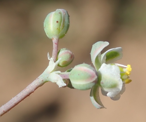 Shrubby, glaucous, creeping herb, 0.01-0.05 m high; branches ascending. Leaves alternate, opposite or crowded into axillary fascicles, linear, subcylindrical, ± fleshy, with wart-like glands; stipules triangular, arising from expanded, membranous margins of leaf bases. Inflorescences axillary, 4-8-flowered umbels; peduncles up to 100 mm long; pedicels up to 20 mm long. Perianth segments 5, the outer 2 or 3 subsucculent, the inner narrower, membranous, greenish or whitish (purple). Staminodes 0. Stamens 5. Stigmas 3-5, short. Flowering time Dec.-Apr. Fruit a membranous, rounded, loculicidal, 3-5-valved capsule. Seeds brown, triangular in outline, smooth, shining. From: Bredenkamp, CL. 2019. Molluginaceae. In: CL Bredenkamp (ed.), A Flora of the Eastern Cape Province. Strelitzia 41(2): 1228-1234. South African National Biodiversity Institute, Pretoria. [CC BY] As: Hypertelis bowkeriana Sond.