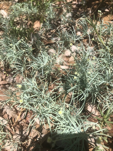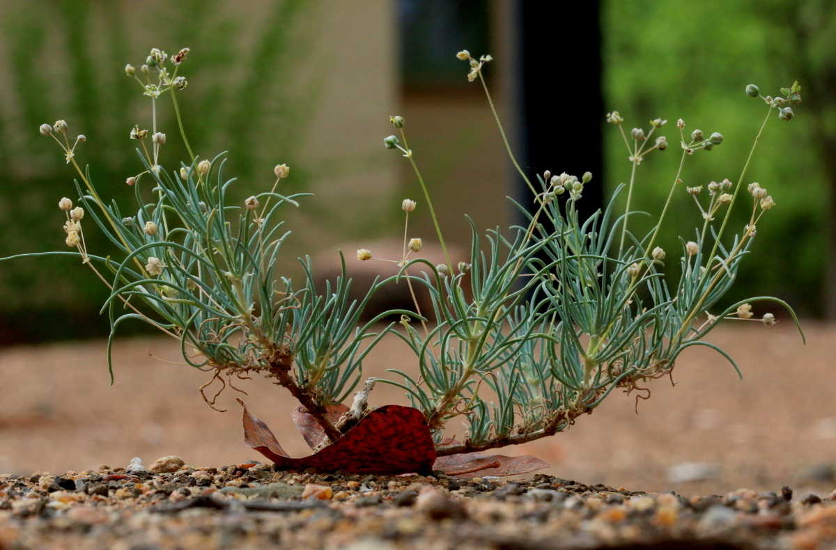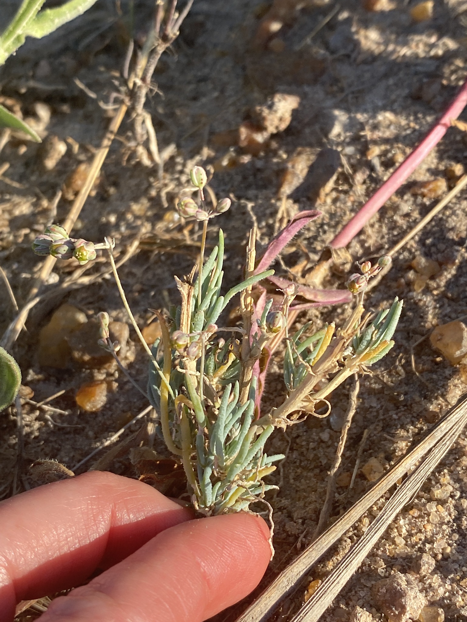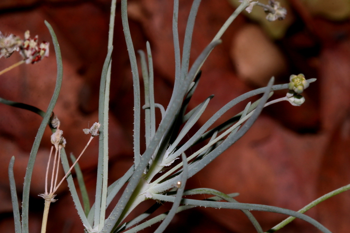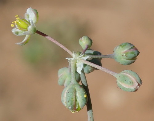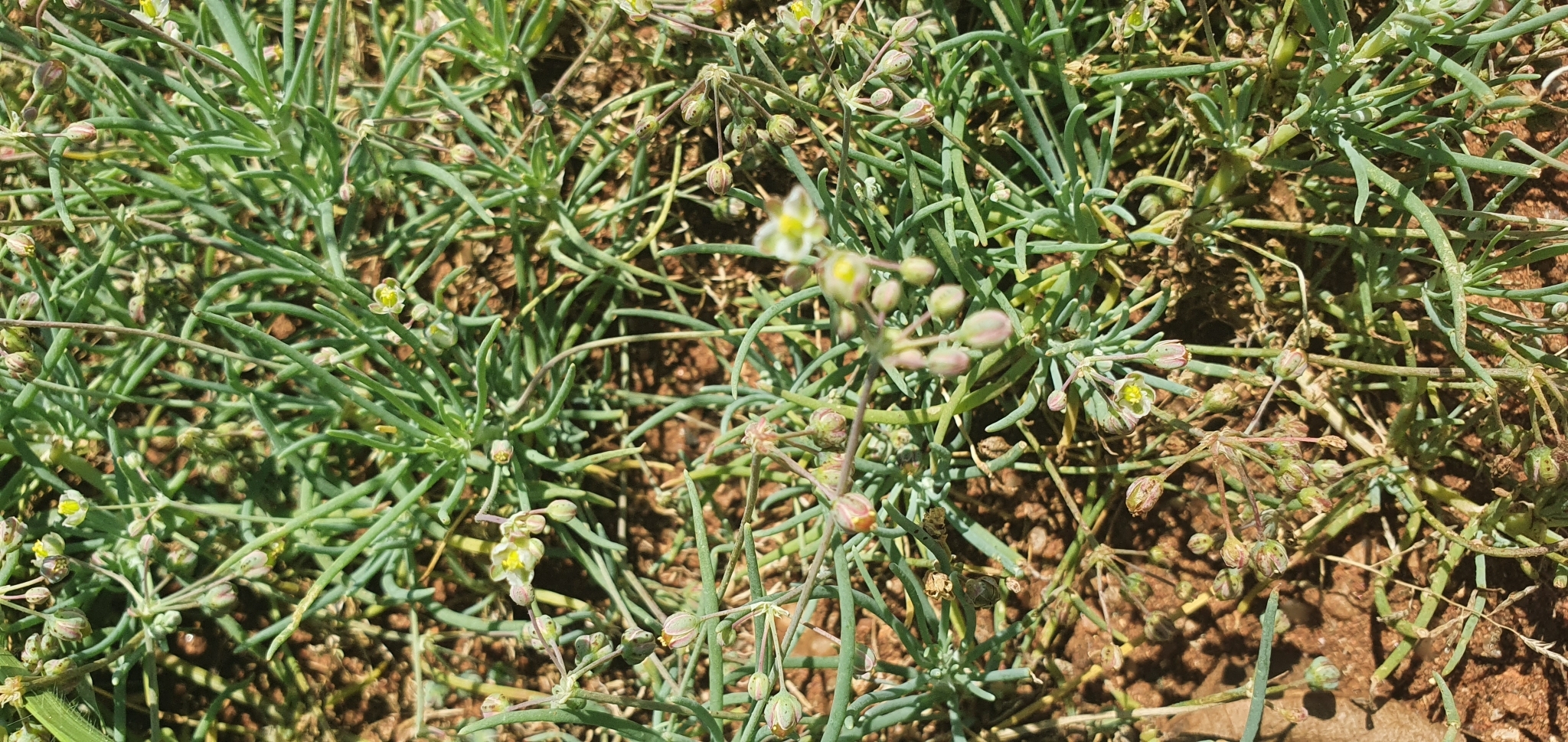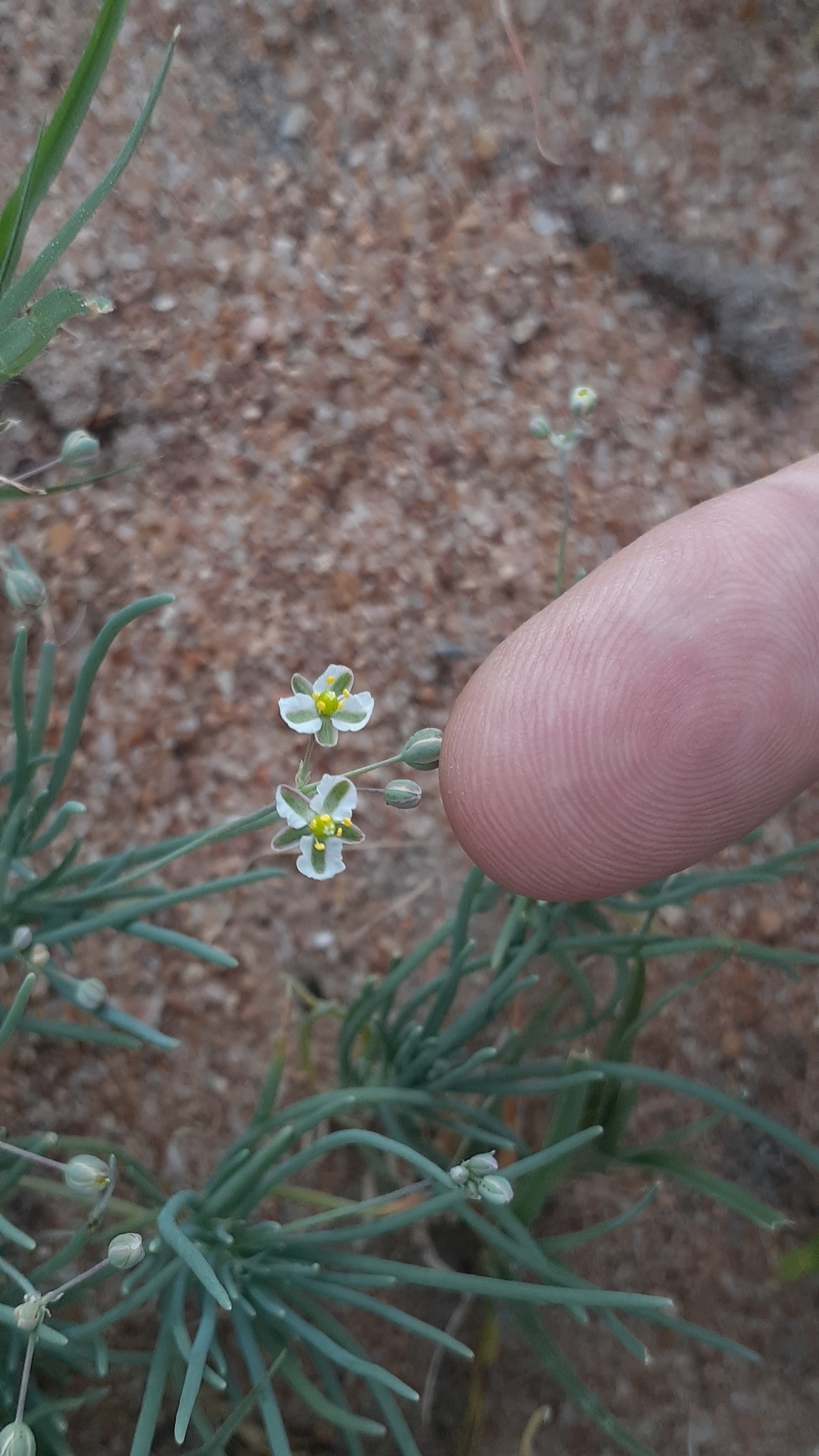 Shrubby, glaucous, creeping herb, 0.01-0.05 m high; branches ascending. Leaves alternate, opposite or crowded into axillary fascicles, linear, subcylindrical, ± fleshy, with wart-like glands; stipules triangular, arising from expanded, membranous margins of leaf bases. Inflorescences axillary, 4-8-flowered umbels; peduncles up to 100 mm long; pedicels up to 20 mm long. Perianth segments 5, the outer 2 or 3 subsucculent, the inner narrower, membranous, greenish or whitish (purple). Staminodes 0. Stamens 5. Stigmas 3-5, short. Flowering time Dec.-Apr. Fruit a membranous, rounded, loculicidal, 3-5-valved capsule. Seeds brown, triangular in outline, smooth, shining. From: Bredenkamp, CL. 2019. Molluginaceae. In: CL Bredenkamp (ed.), A Flora of the Eastern Cape Province. Strelitzia 41(2): 1228-1234. South African National Biodiversity Institute, Pretoria. [CC BY] As: Hypertelis bowkeriana Sond.