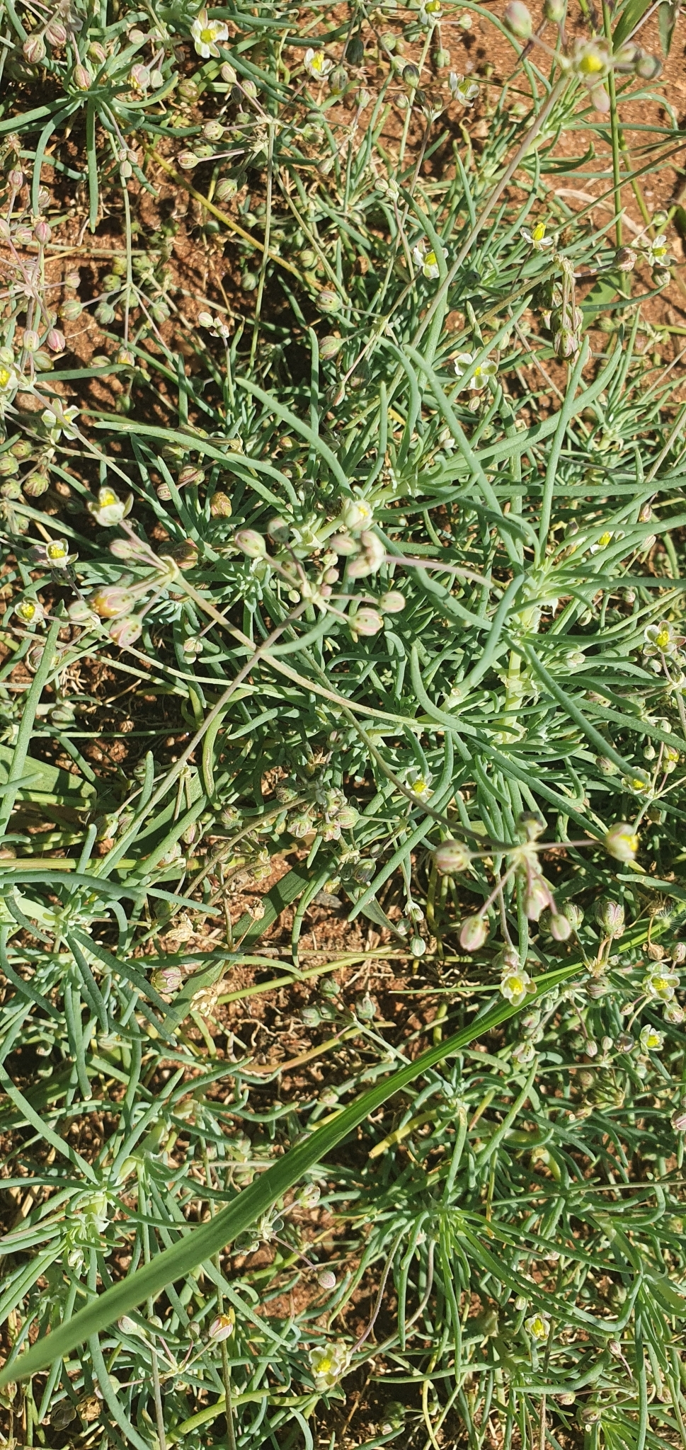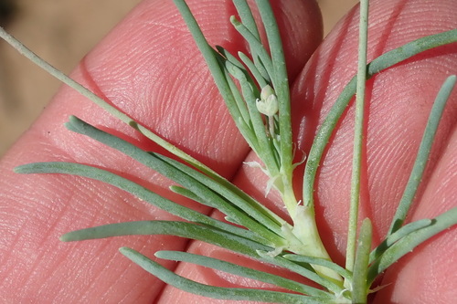 Perennial herb; glaucous, in loose bundles, up to 150 mm high. Stems ascending or decumbent, branched, 30-120 mm long. Leaves alternate, fascicled, fleshy; blade linear, 30-60 mm long, with wart-like glands; stipules persistent. Flowers: peduncles slender, smooth, 50-90 mm long, umbels 4-8-flowered; pedicels smooth; stamens 5; perianth segments without glands, ± 3 mm long, white; Dec.-Apr. From: Retief, E; Meyer, NL. 2017. Molluginaceae. In: E Retief & NL Meyer (eds), Plants of the Free State: Inventory and identification guide. Strelitzia 38: 653-658. South African National Biodiversity Institute, Pretoria. [CC BY] As: Hypertelis bowkeriana Sond.