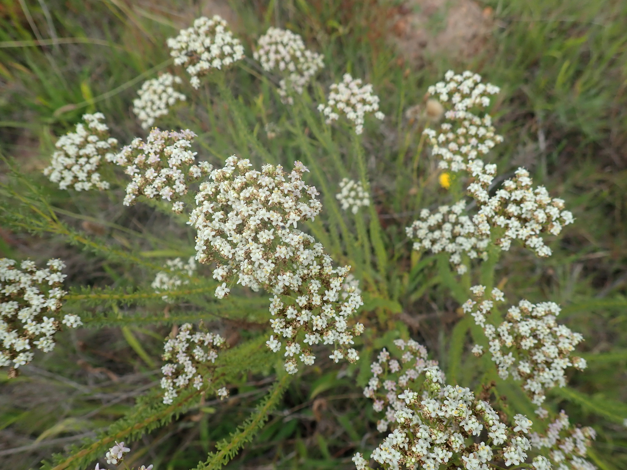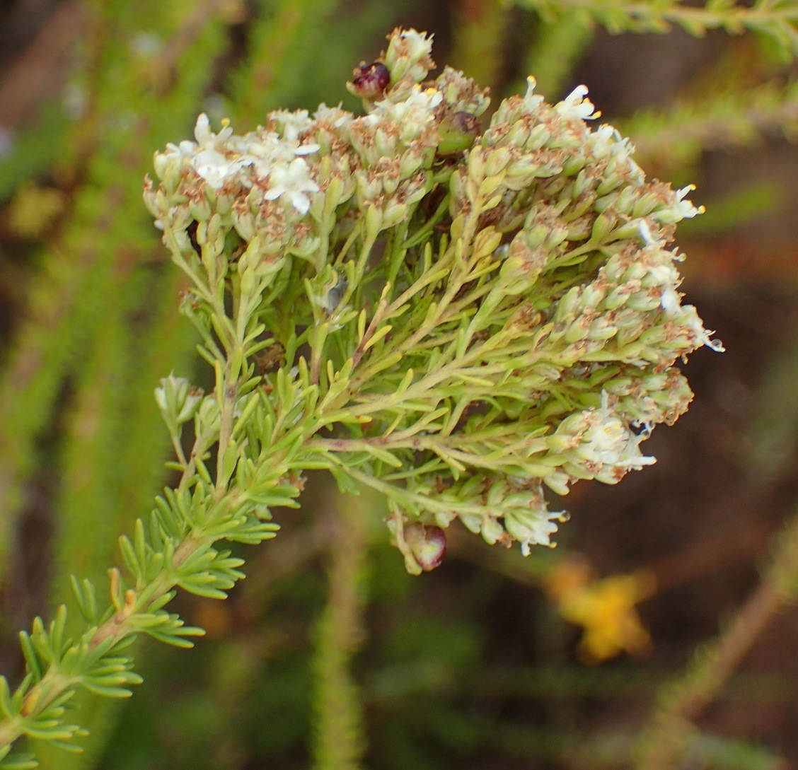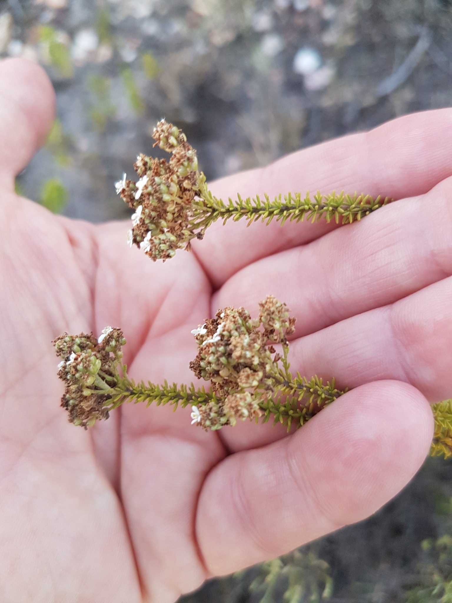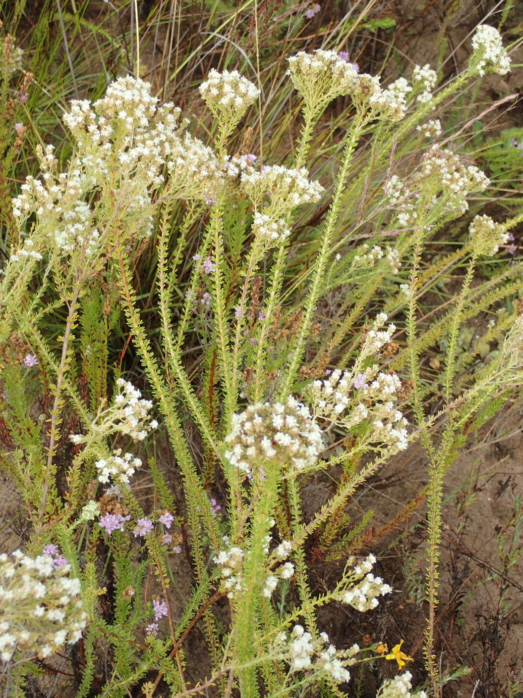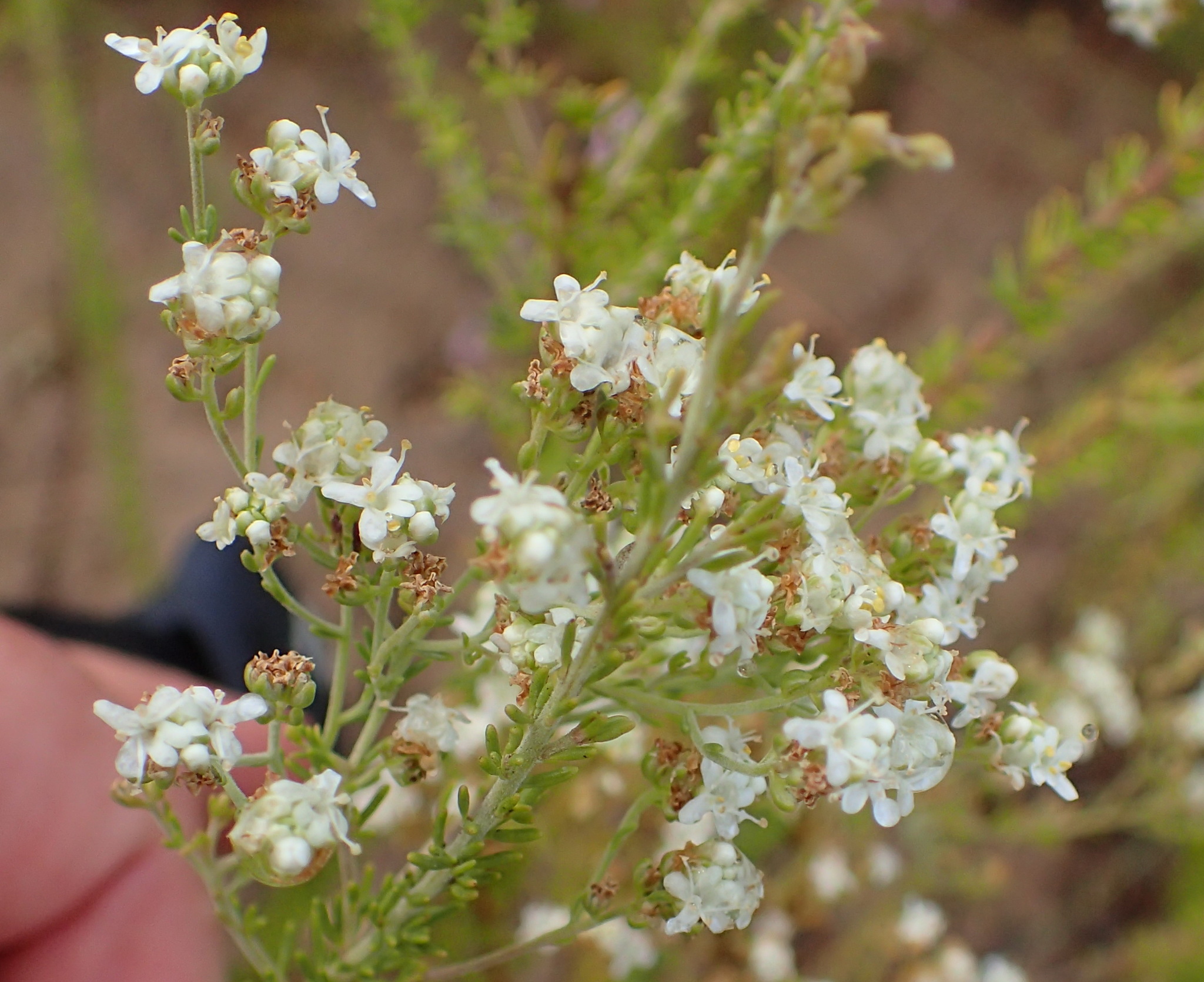 Bushy shrublet 150-600 mm tall, stems pubescent, hairs up 0.1-0.25 mm long, retrorse, closely leafy. Leaves alternate, fascicled, primary leaves 2-7 x 0.5-1.2 mm, ratio lengthy breadth c. 2.5-7:1. linear-oblong to narrowly elliptic, apex obtuse, base scarcely narrowed, margins entire, texture thick, venation invisible, glandular -punctate, sometimes oozing, otherwise glabrous except for a few hairs sometimes on margins at clasping base. Inflorescence a crowded leafy terminal corymb up to c. 60 mm in diam. Bract adnate to pedicel and calyx tube, lowermost 1.8-2.6 x 0.7-1.25 mm, blade elliptic, obtuse, deeply concave, embracing calyx, strongly keeled, margins broad, pale, membranous, glandular - punctate, sometimes oozing, hairs to 0.1 mm on margins. Pedicel (lowermost) 0.1-0.6(-1) mm long. Calyx 1.3-1.8(-2) mm long, campanulate, subequally 5-lobed, lobes 0.4-0.8 mm long, obtuse, minute globular glands scattered all over, few hairs to 0.1 mm on margins. Corolla tube 1.5-1.8(-2) mm long (female flowers not uncommon then much smaller), broadly funnel-shaped, limb 2.5-4.2 mm across lateral lobes, posticous lobes 0.8-1.4 x 0.6-0.8 mm, anticous lobe 1.4-2.3 x 0.7-1 mm, all lobes oblong - elliptic, white (but see comments below). Stamens: posticous filaments 1.2-1.8 mm long; anticous filaments 1.8-2.5 mm, all anthers well exerted. Stigma and style 2-3 mm long, style glabrous. Ovary c. 0.4 x 0.3 mm. Cocci 1.4-1.8 x 0.8-1 mm, brown, rugulose. Flowers have been recorded in all months except August, but the main season is probably November to May. From: Hilliard, OM. 1999. The Tribe Selagineae (Scrophulariaceae). Royal Botanic Garden, Edinburgh. [All rights reserved]