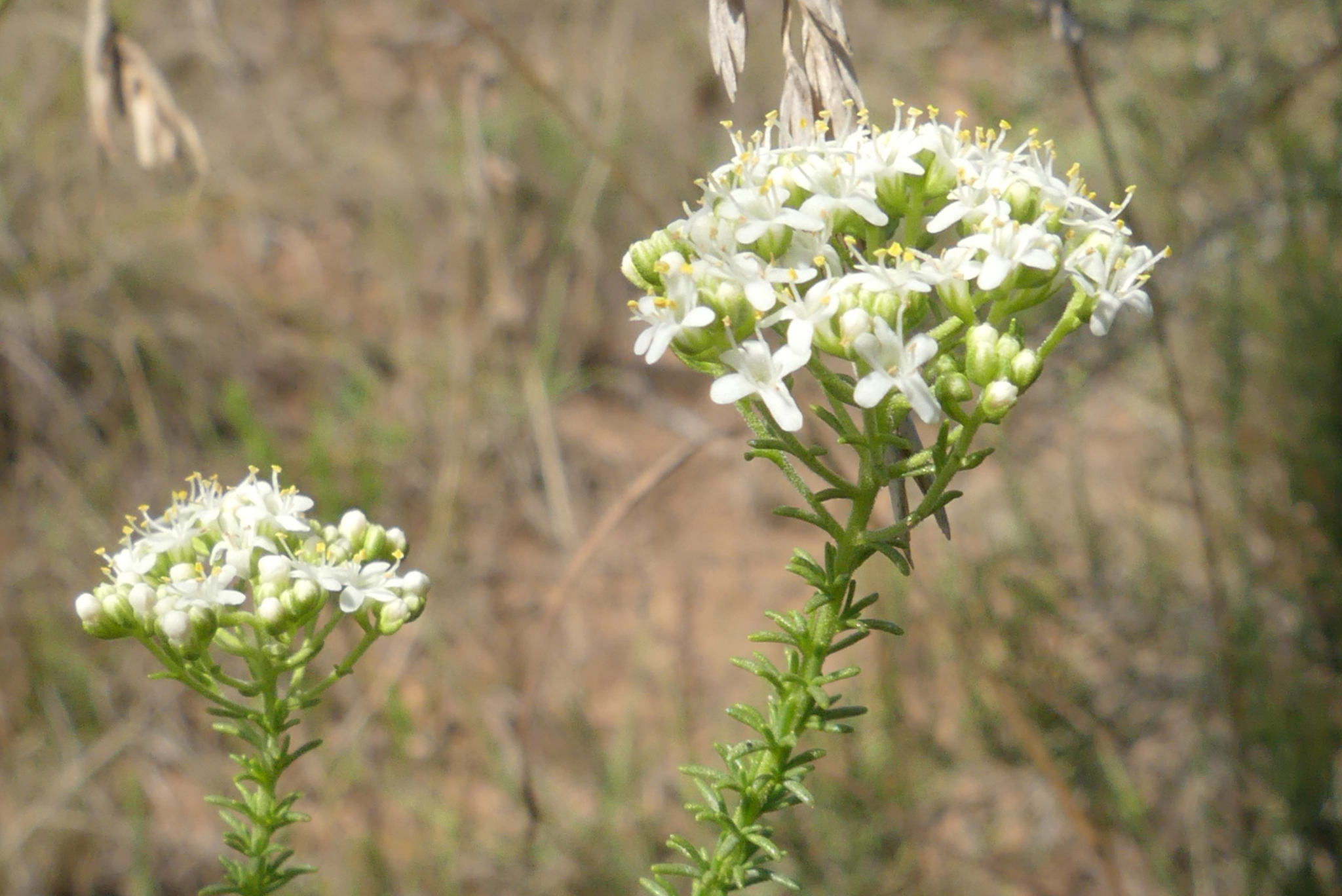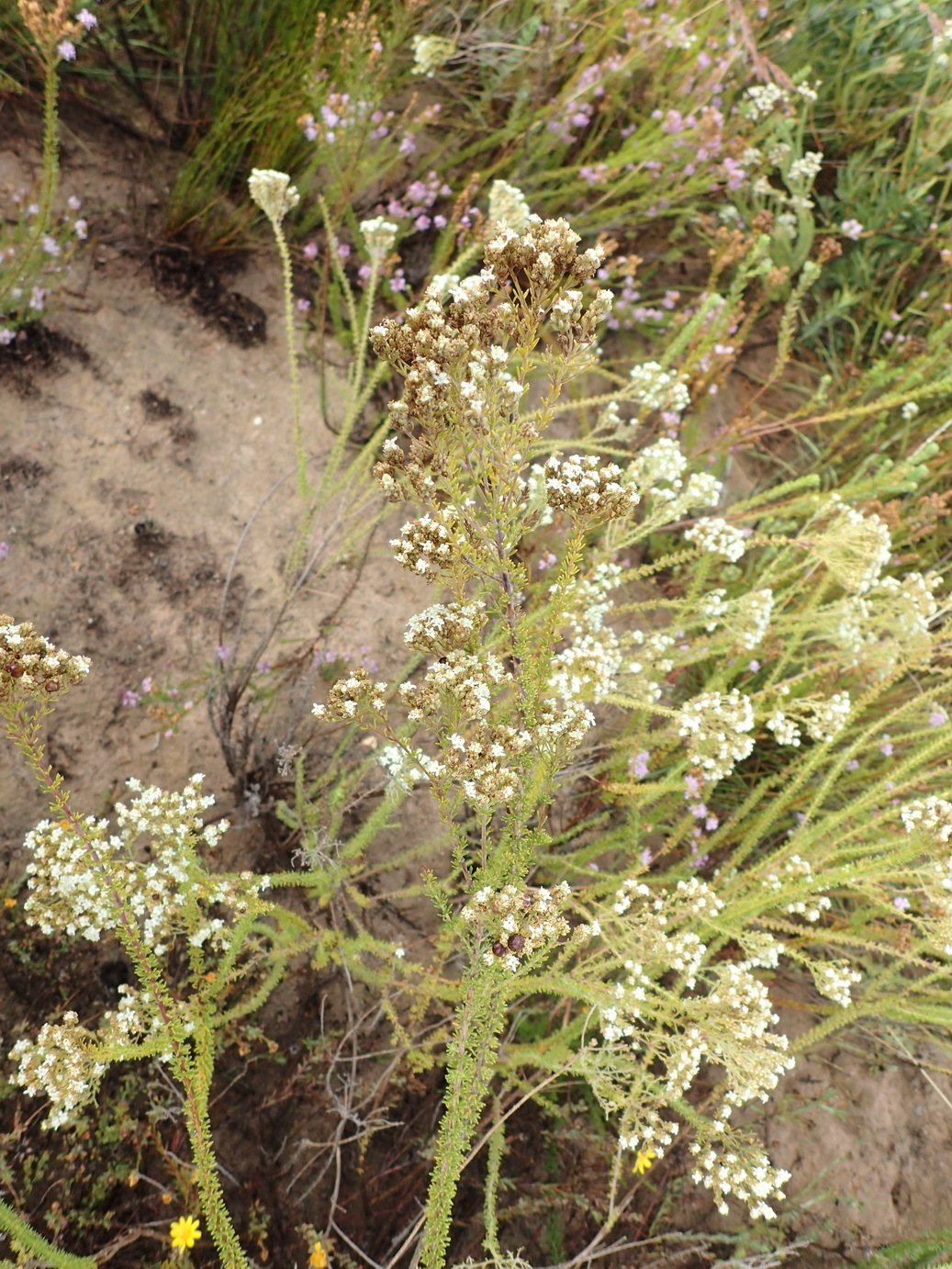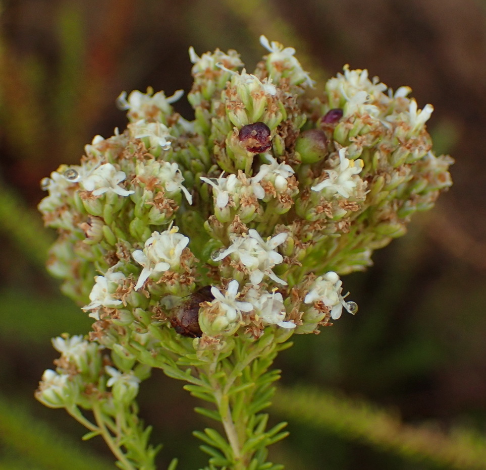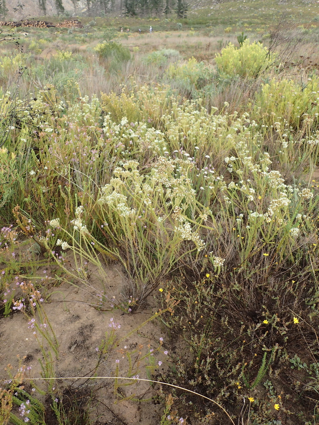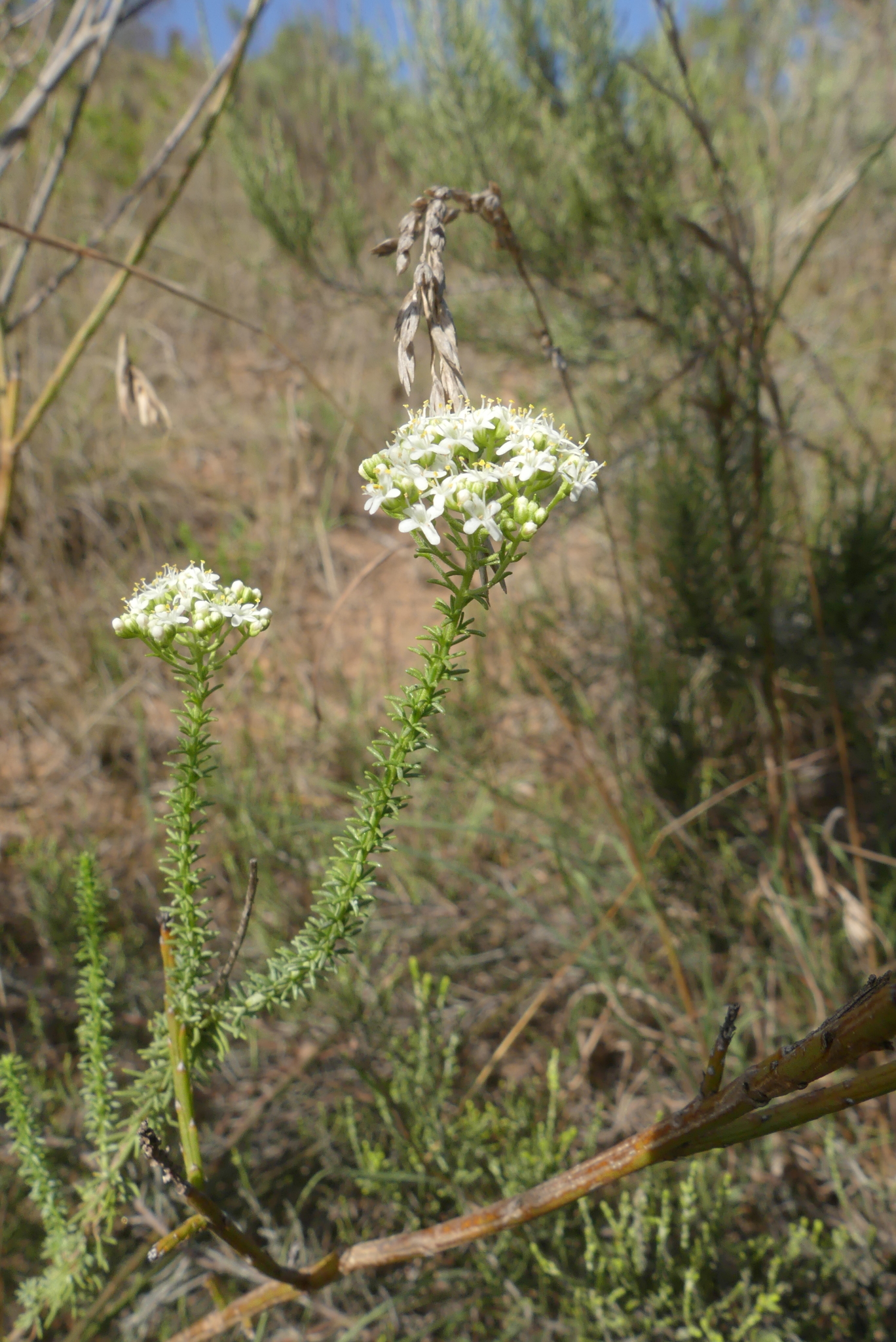 Bushy shrublet 150-600 mm tall, stems pubescent, hairs up 0.1-0.25 mm long, retrorse, closely leafy. Leaves alternate, fascicled, primary leaves 2-7 x 0.5-1.2 mm, ratio lengthy breadth c. 2.5-7:1. linear-oblong to narrowly elliptic, apex obtuse, base scarcely narrowed, margins entire, texture thick, venation invisible, glandular -punctate, sometimes oozing, otherwise glabrous except for a few hairs sometimes on margins at clasping base. Inflorescence a crowded leafy terminal corymb up to c. 60 mm in diam. Bract adnate to pedicel and calyx tube, lowermost 1.8-2.6 x 0.7-1.25 mm, blade elliptic, obtuse, deeply concave, embracing calyx, strongly keeled, margins broad, pale, membranous, glandular - punctate, sometimes oozing, hairs to 0.1 mm on margins. Pedicel (lowermost) 0.1-0.6(-1) mm long. Calyx 1.3-1.8(-2) mm long, campanulate, subequally 5-lobed, lobes 0.4-0.8 mm long, obtuse, minute globular glands scattered all over, few hairs to 0.1 mm on margins. Corolla tube 1.5-1.8(-2) mm long (female flowers not uncommon then much smaller), broadly funnel-shaped, limb 2.5-4.2 mm across lateral lobes, posticous lobes 0.8-1.4 x 0.6-0.8 mm, anticous lobe 1.4-2.3 x 0.7-1 mm, all lobes oblong - elliptic, white (but see comments below). Stamens: posticous filaments 1.2-1.8 mm long; anticous filaments 1.8-2.5 mm, all anthers well exerted. Stigma and style 2-3 mm long, style glabrous. Ovary c. 0.4 x 0.3 mm. Cocci 1.4-1.8 x 0.8-1 mm, brown, rugulose. Flowers have been recorded in all months except August, but the main season is probably November to May. From: Hilliard, OM. 1999. The Tribe Selagineae (Scrophulariaceae). Royal Botanic Garden, Edinburgh. [All rights reserved]