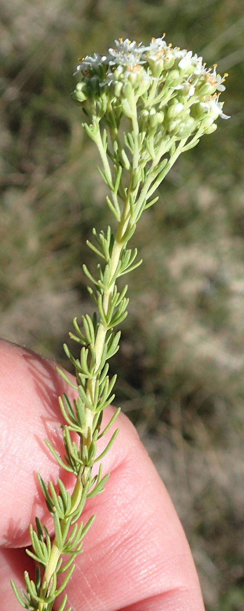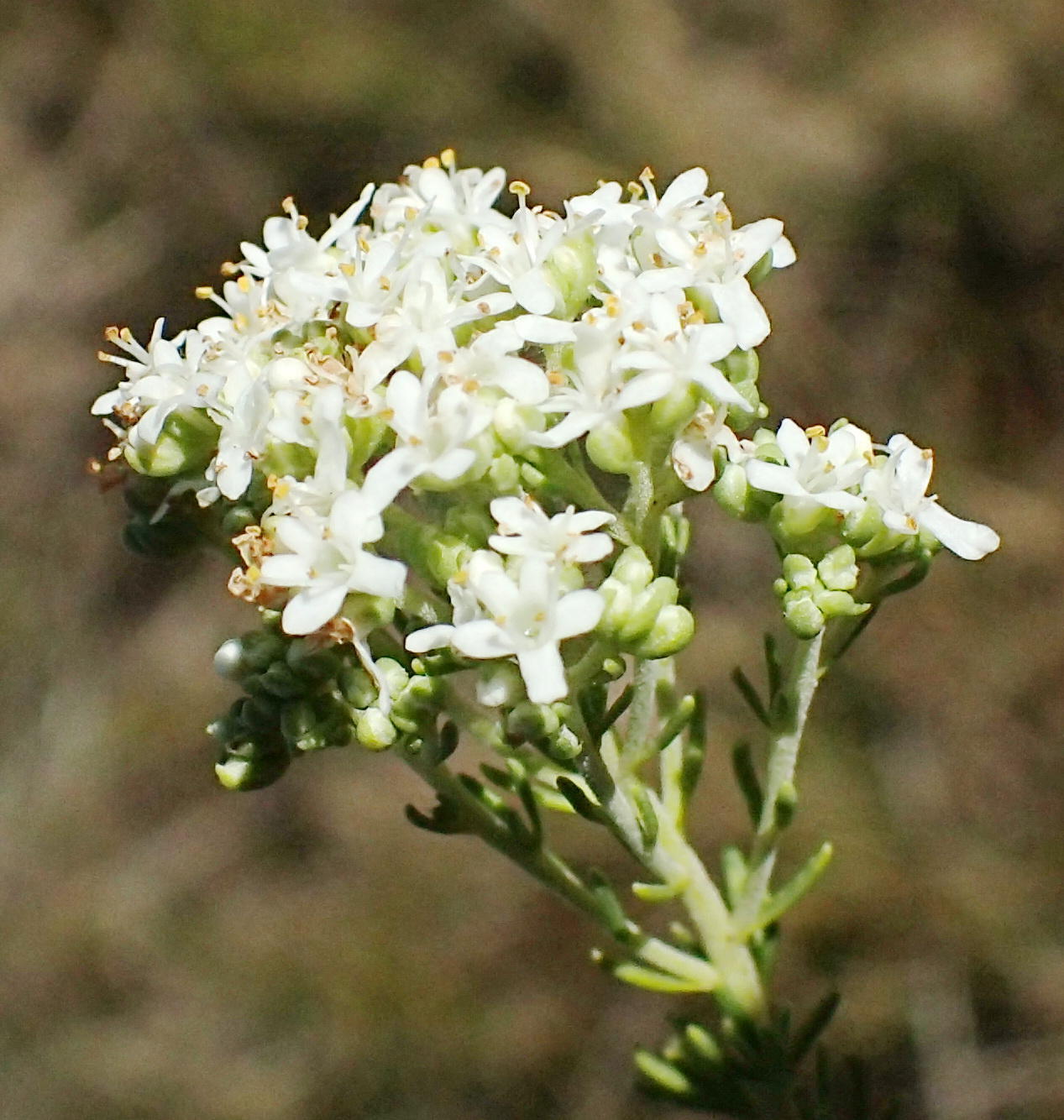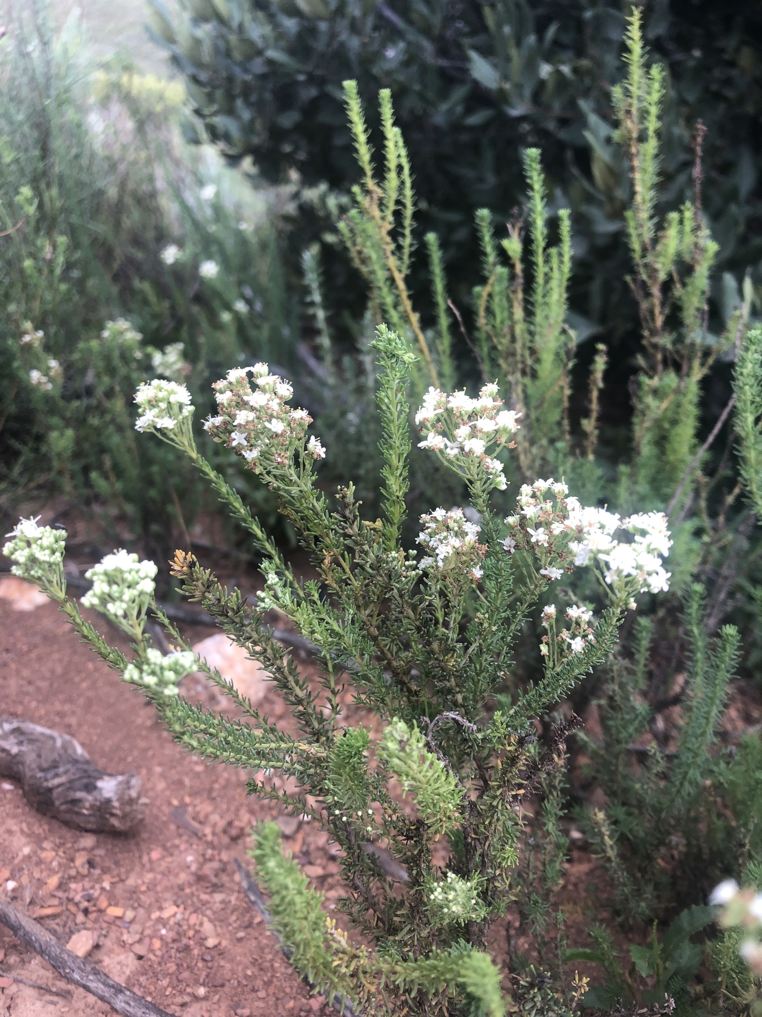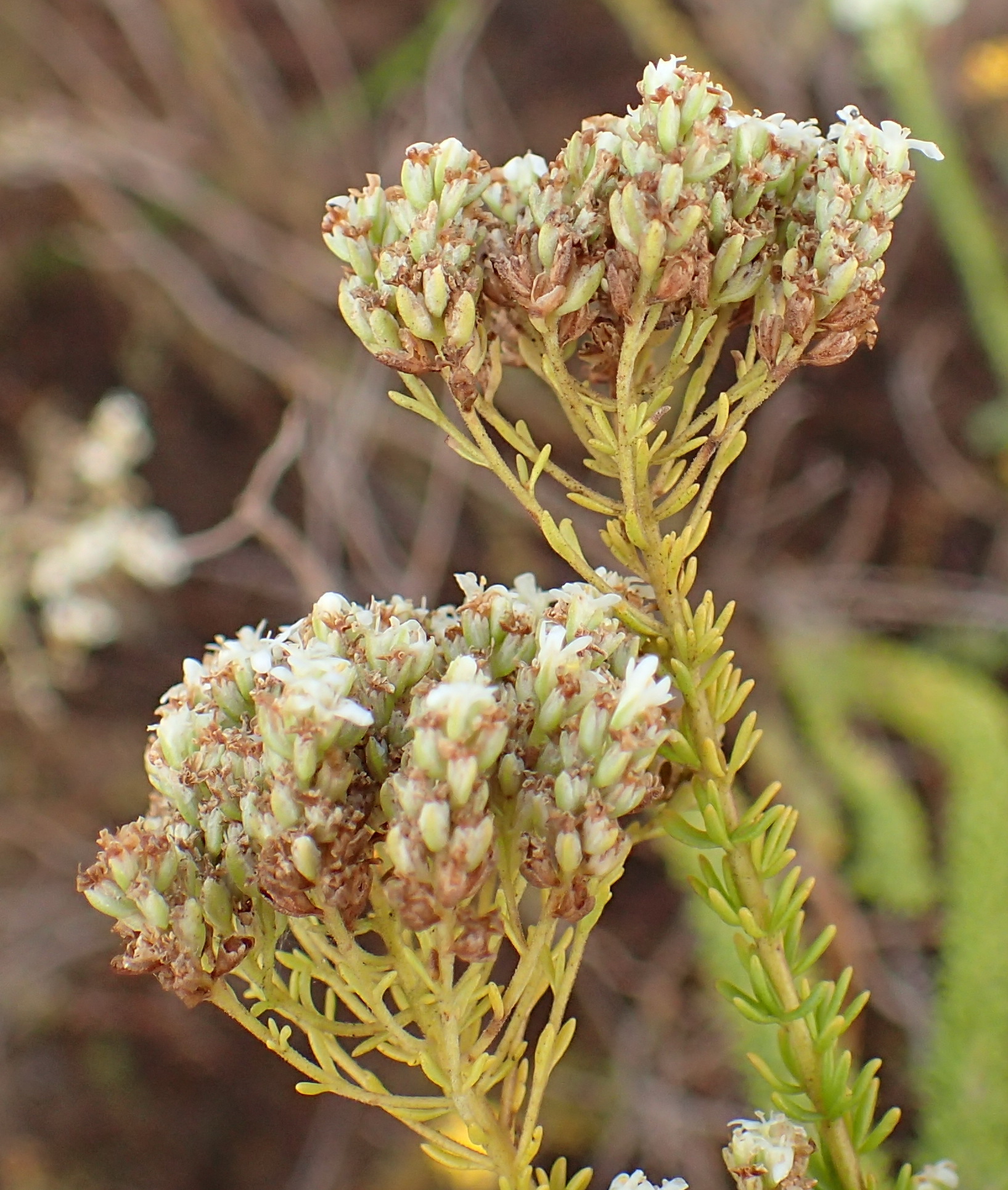 Bushy shrublet 150-600 mm tall, stems pubescent, hairs up 0.1-0.25 mm long, retrorse, closely leafy. Leaves alternate, fascicled, primary leaves 2-7 x 0.5-1.2 mm, ratio lengthy breadth c. 2.5-7:1. linear-oblong to narrowly elliptic, apex obtuse, base scarcely narrowed, margins entire, texture thick, venation invisible, glandular -punctate, sometimes oozing, otherwise glabrous except for a few hairs sometimes on margins at clasping base. Inflorescence a crowded leafy terminal corymb up to c. 60 mm in diam. Bract adnate to pedicel and calyx tube, lowermost 1.8-2.6 x 0.7-1.25 mm, blade elliptic, obtuse, deeply concave, embracing calyx, strongly keeled, margins broad, pale, membranous, glandular - punctate, sometimes oozing, hairs to 0.1 mm on margins. Pedicel (lowermost) 0.1-0.6(-1) mm long. Calyx 1.3-1.8(-2) mm long, campanulate, subequally 5-lobed, lobes 0.4-0.8 mm long, obtuse, minute globular glands scattered all over, few hairs to 0.1 mm on margins. Corolla tube 1.5-1.8(-2) mm long (female flowers not uncommon then much smaller), broadly funnel-shaped, limb 2.5-4.2 mm across lateral lobes, posticous lobes 0.8-1.4 x 0.6-0.8 mm, anticous lobe 1.4-2.3 x 0.7-1 mm, all lobes oblong - elliptic, white (but see comments below). Stamens: posticous filaments 1.2-1.8 mm long; anticous filaments 1.8-2.5 mm, all anthers well exerted. Stigma and style 2-3 mm long, style glabrous. Ovary c. 0.4 x 0.3 mm. Cocci 1.4-1.8 x 0.8-1 mm, brown, rugulose. Flowers have been recorded in all months except August, but the main season is probably November to May. From: Hilliard, OM. 1999. The Tribe Selagineae (Scrophulariaceae). Royal Botanic Garden, Edinburgh. [All rights reserved]
