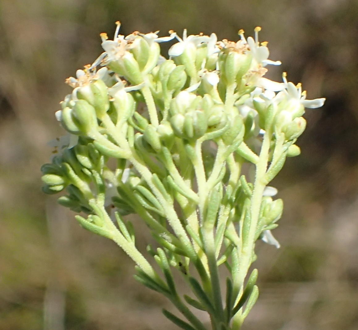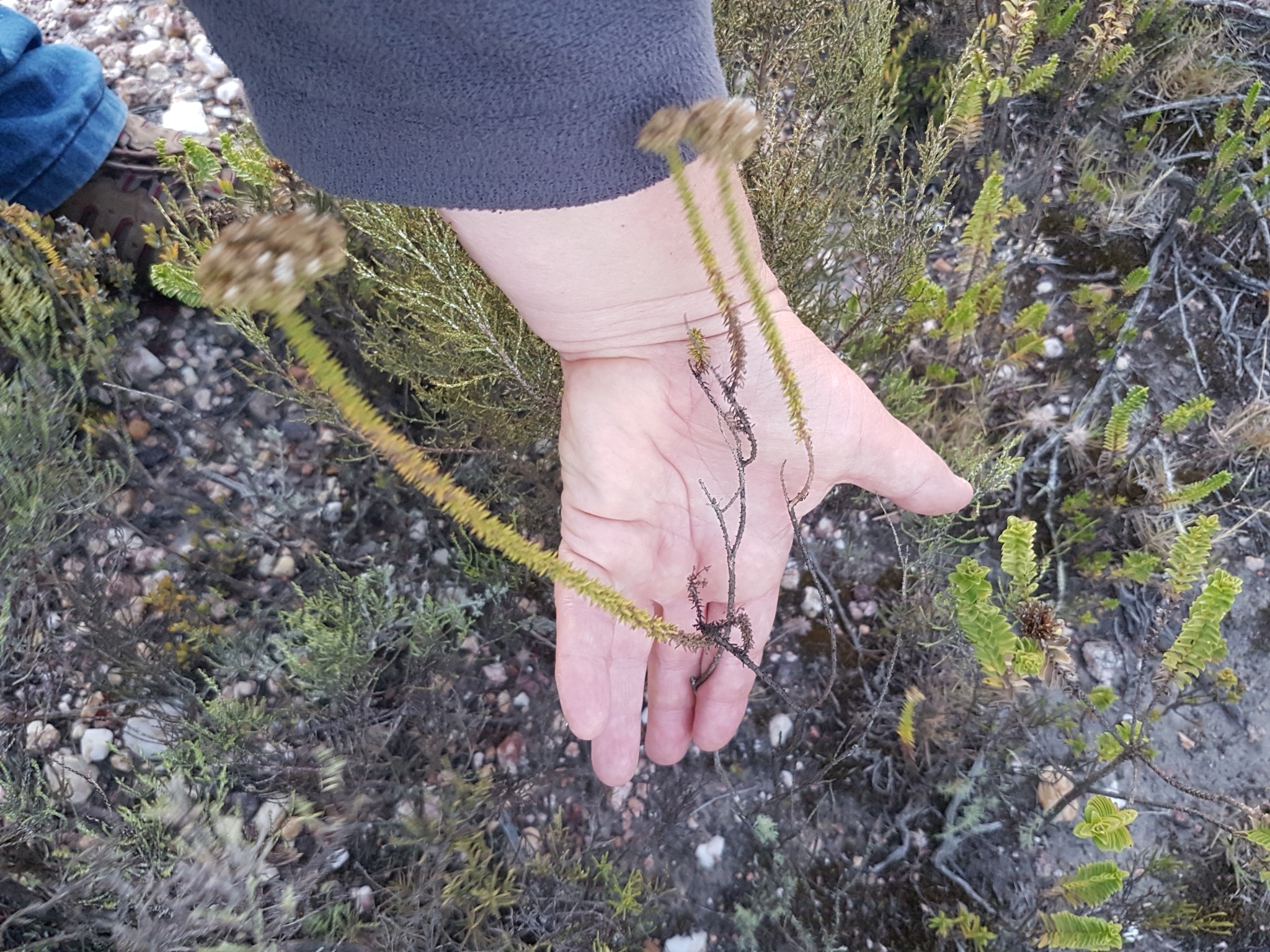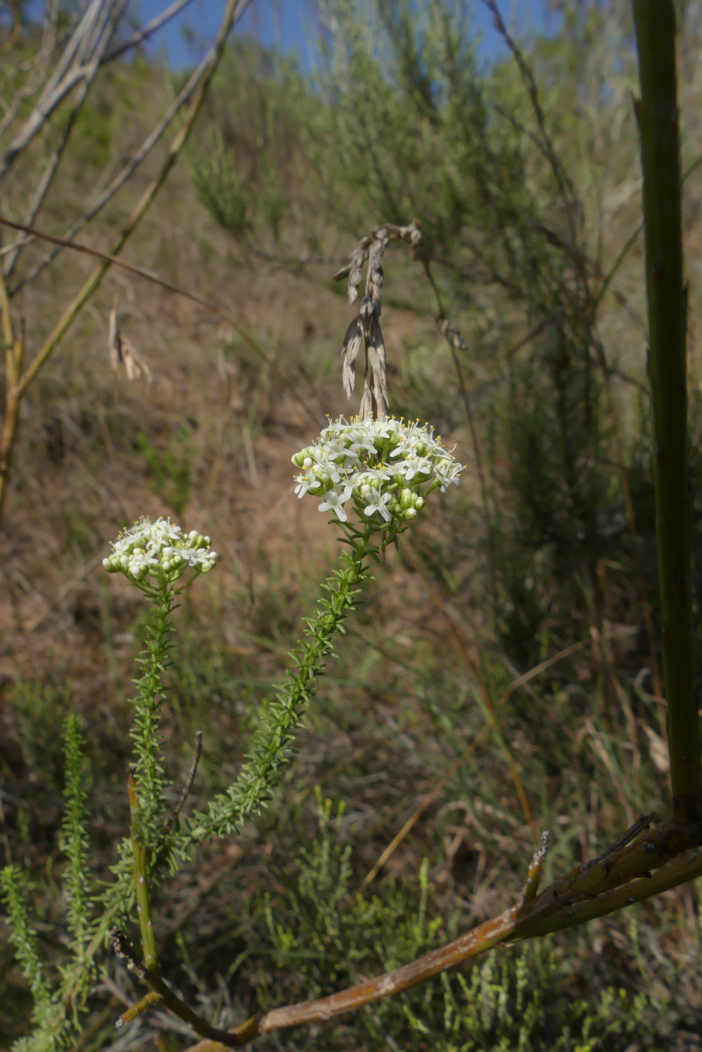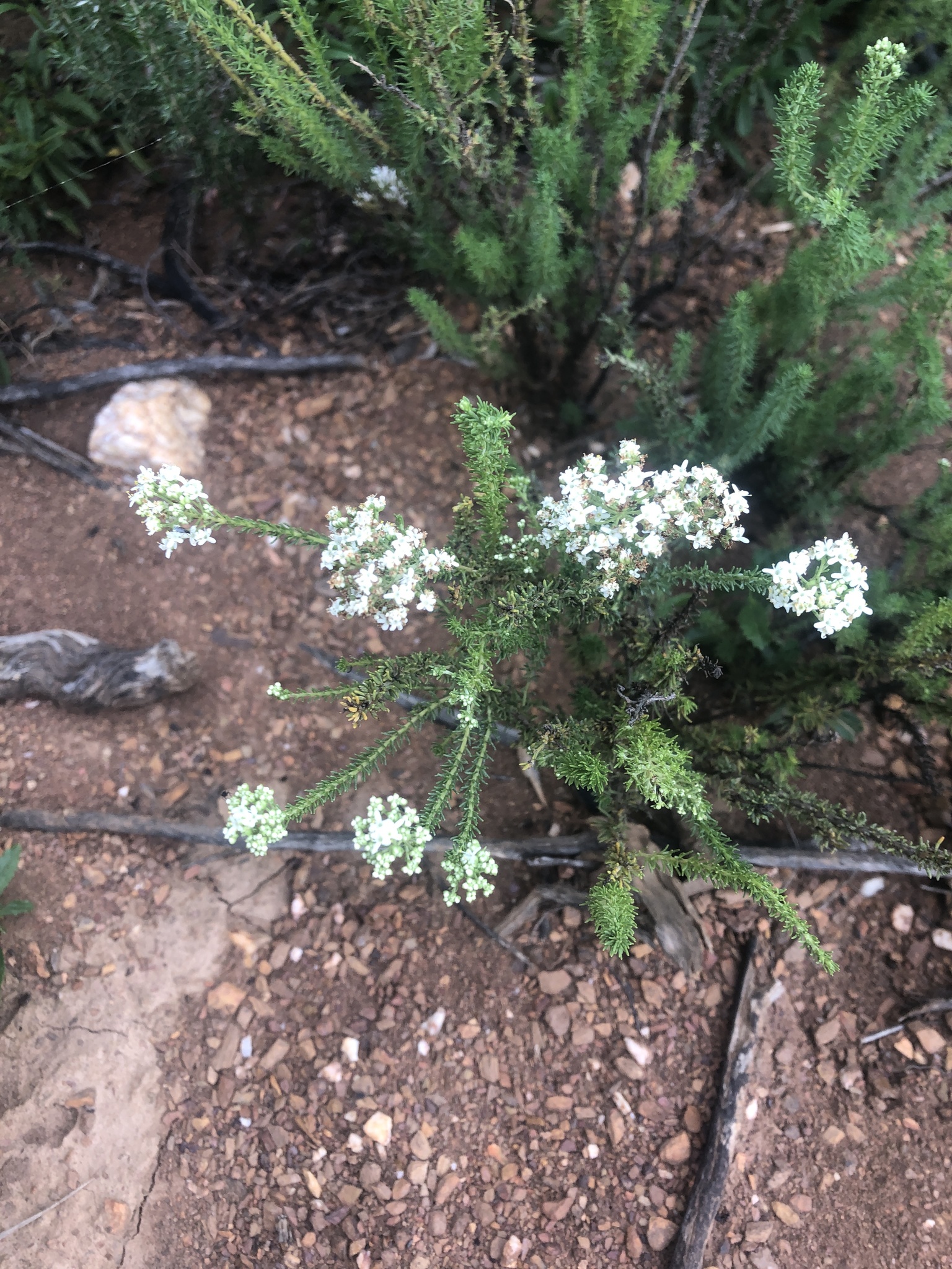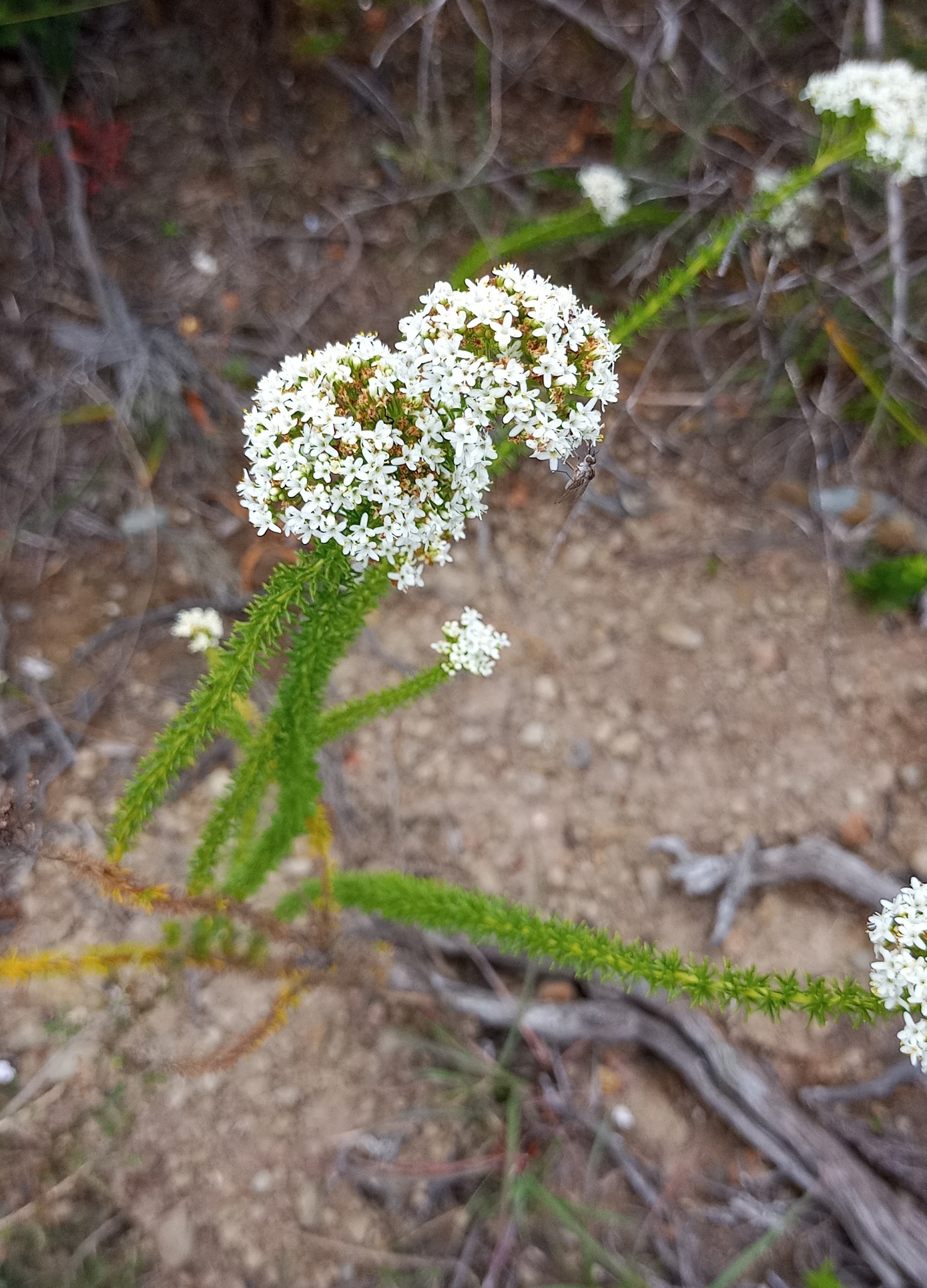 Bushy shrublet 150-600 mm tall, stems pubescent, hairs up 0.1-0.25 mm long, retrorse, closely leafy. Leaves alternate, fascicled, primary leaves 2-7 x 0.5-1.2 mm, ratio lengthy breadth c. 2.5-7:1. linear-oblong to narrowly elliptic, apex obtuse, base scarcely narrowed, margins entire, texture thick, venation invisible, glandular -punctate, sometimes oozing, otherwise glabrous except for a few hairs sometimes on margins at clasping base. Inflorescence a crowded leafy terminal corymb up to c. 60 mm in diam. Bract adnate to pedicel and calyx tube, lowermost 1.8-2.6 x 0.7-1.25 mm, blade elliptic, obtuse, deeply concave, embracing calyx, strongly keeled, margins broad, pale, membranous, glandular - punctate, sometimes oozing, hairs to 0.1 mm on margins. Pedicel (lowermost) 0.1-0.6(-1) mm long. Calyx 1.3-1.8(-2) mm long, campanulate, subequally 5-lobed, lobes 0.4-0.8 mm long, obtuse, minute globular glands scattered all over, few hairs to 0.1 mm on margins. Corolla tube 1.5-1.8(-2) mm long (female flowers not uncommon then much smaller), broadly funnel-shaped, limb 2.5-4.2 mm across lateral lobes, posticous lobes 0.8-1.4 x 0.6-0.8 mm, anticous lobe 1.4-2.3 x 0.7-1 mm, all lobes oblong - elliptic, white (but see comments below). Stamens: posticous filaments 1.2-1.8 mm long; anticous filaments 1.8-2.5 mm, all anthers well exerted. Stigma and style 2-3 mm long, style glabrous. Ovary c. 0.4 x 0.3 mm. Cocci 1.4-1.8 x 0.8-1 mm, brown, rugulose. Flowers have been recorded in all months except August, but the main season is probably November to May. From: Hilliard, OM. 1999. The Tribe Selagineae (Scrophulariaceae). Royal Botanic Garden, Edinburgh. [All rights reserved]