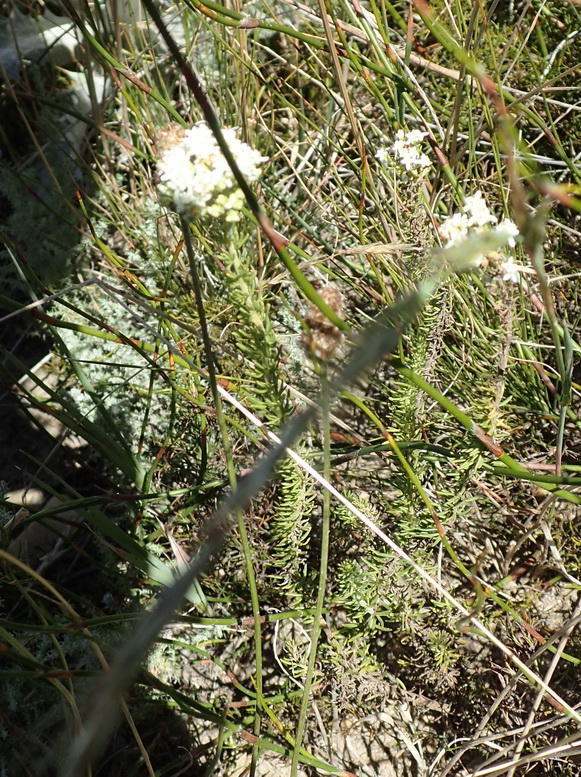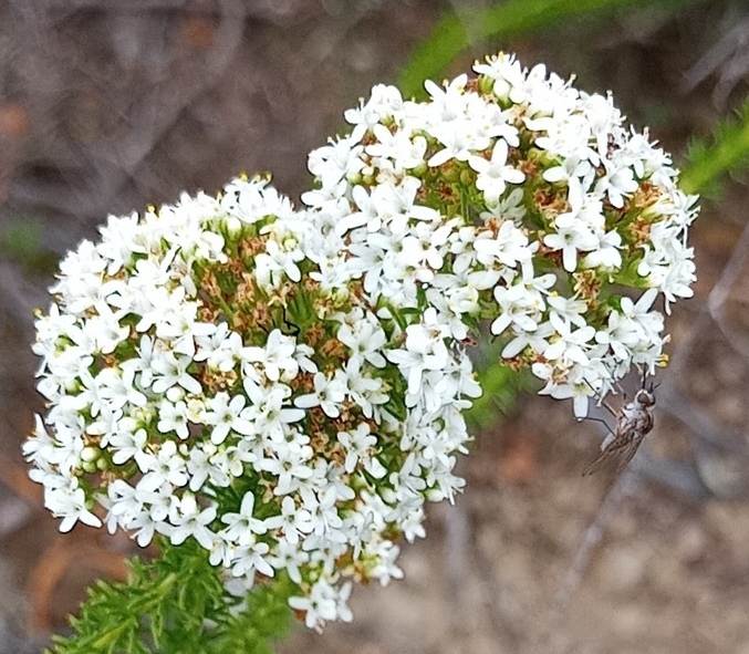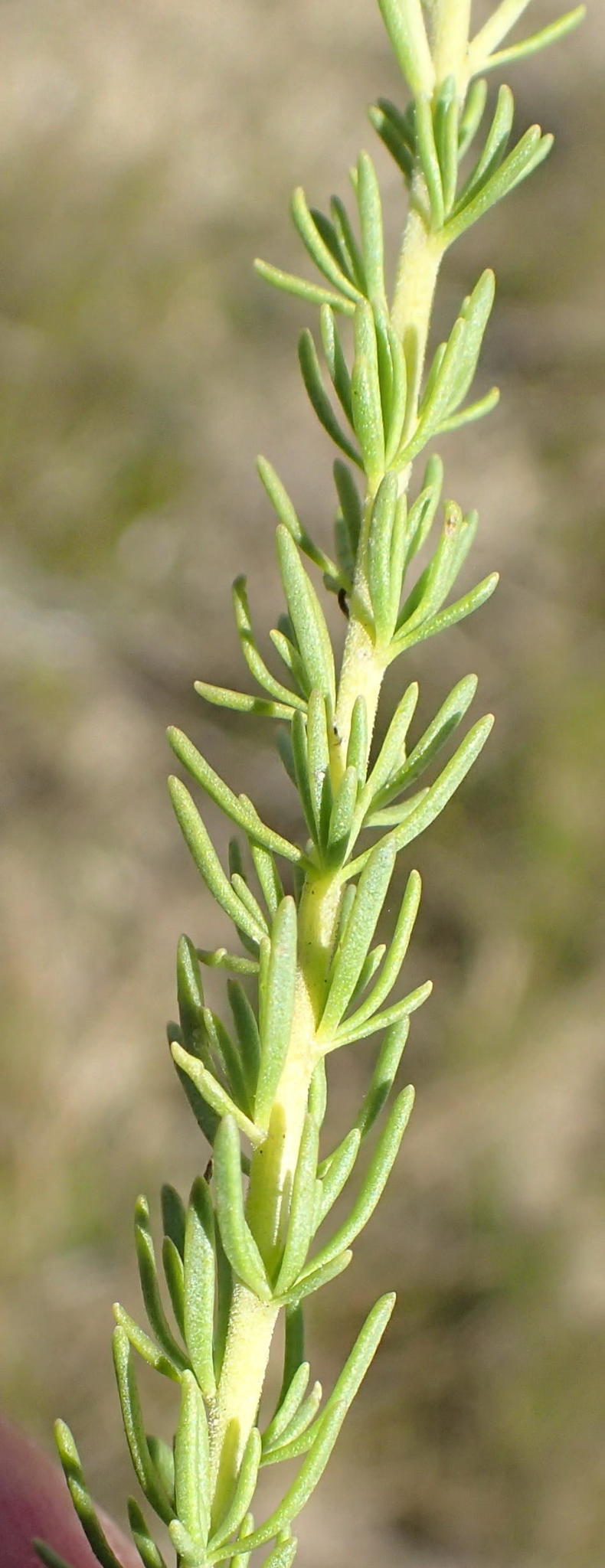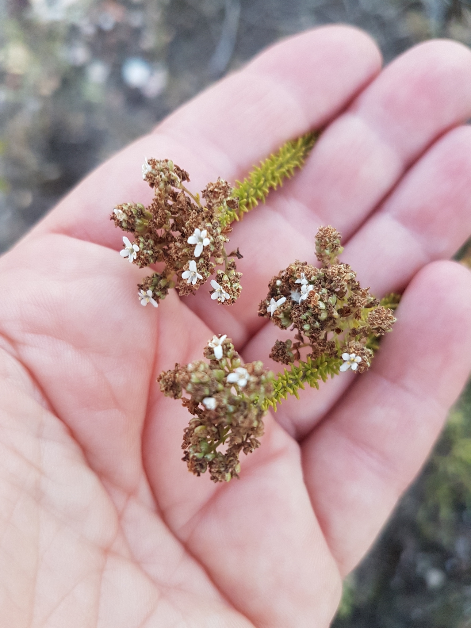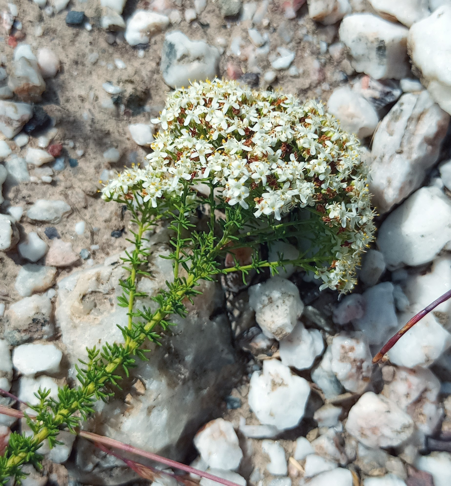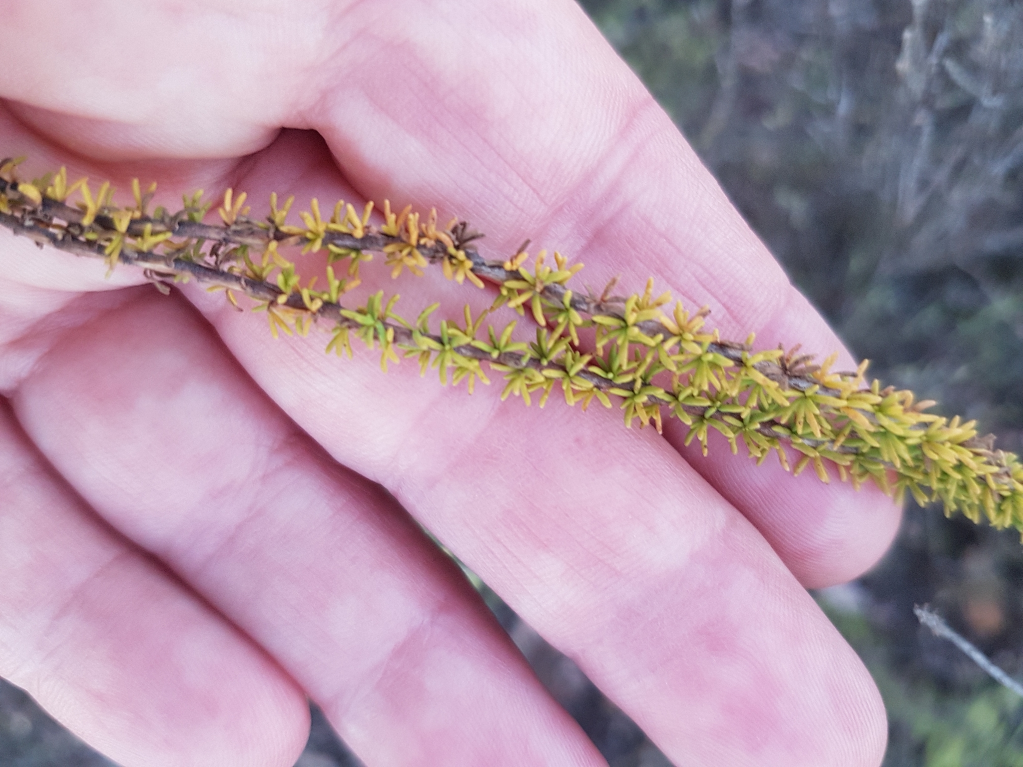 Bushy shrublet 150-600 mm tall, stems pubescent, hairs up 0.1-0.25 mm long, retrorse, closely leafy. Leaves alternate, fascicled, primary leaves 2-7 x 0.5-1.2 mm, ratio lengthy breadth c. 2.5-7:1. linear-oblong to narrowly elliptic, apex obtuse, base scarcely narrowed, margins entire, texture thick, venation invisible, glandular -punctate, sometimes oozing, otherwise glabrous except for a few hairs sometimes on margins at clasping base. Inflorescence a crowded leafy terminal corymb up to c. 60 mm in diam. Bract adnate to pedicel and calyx tube, lowermost 1.8-2.6 x 0.7-1.25 mm, blade elliptic, obtuse, deeply concave, embracing calyx, strongly keeled, margins broad, pale, membranous, glandular - punctate, sometimes oozing, hairs to 0.1 mm on margins. Pedicel (lowermost) 0.1-0.6(-1) mm long. Calyx 1.3-1.8(-2) mm long, campanulate, subequally 5-lobed, lobes 0.4-0.8 mm long, obtuse, minute globular glands scattered all over, few hairs to 0.1 mm on margins. Corolla tube 1.5-1.8(-2) mm long (female flowers not uncommon then much smaller), broadly funnel-shaped, limb 2.5-4.2 mm across lateral lobes, posticous lobes 0.8-1.4 x 0.6-0.8 mm, anticous lobe 1.4-2.3 x 0.7-1 mm, all lobes oblong - elliptic, white (but see comments below). Stamens: posticous filaments 1.2-1.8 mm long; anticous filaments 1.8-2.5 mm, all anthers well exerted. Stigma and style 2-3 mm long, style glabrous. Ovary c. 0.4 x 0.3 mm. Cocci 1.4-1.8 x 0.8-1 mm, brown, rugulose. Flowers have been recorded in all months except August, but the main season is probably November to May. From: Hilliard, OM. 1999. The Tribe Selagineae (Scrophulariaceae). Royal Botanic Garden, Edinburgh. [All rights reserved]