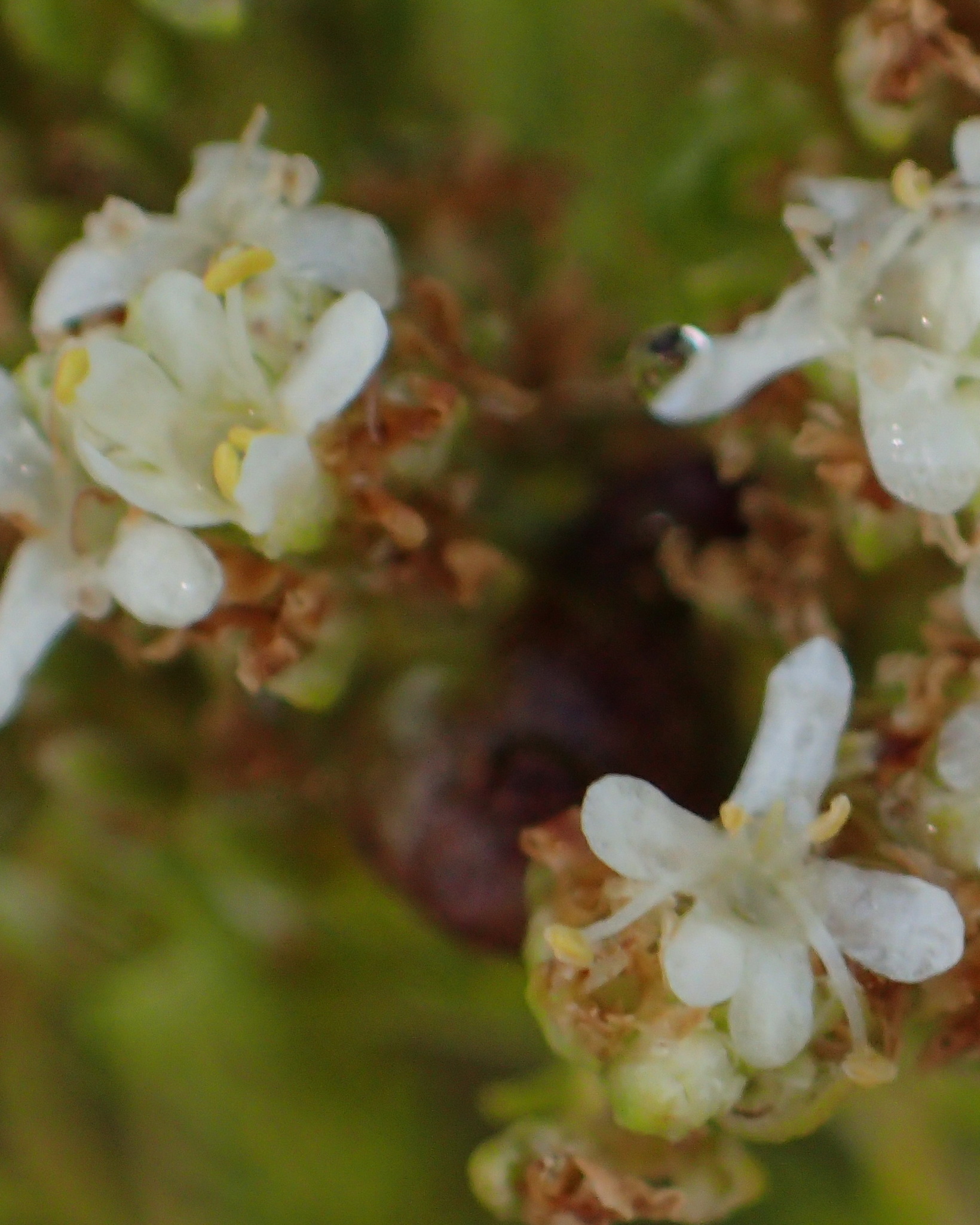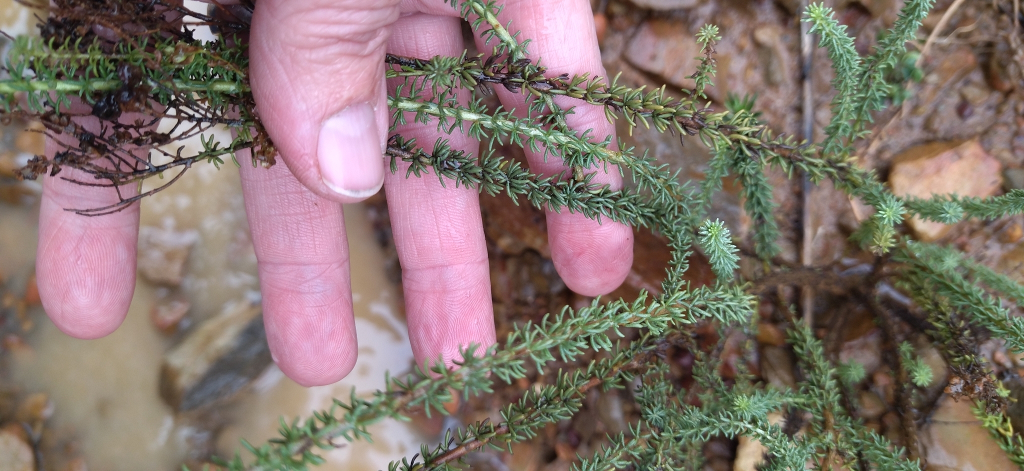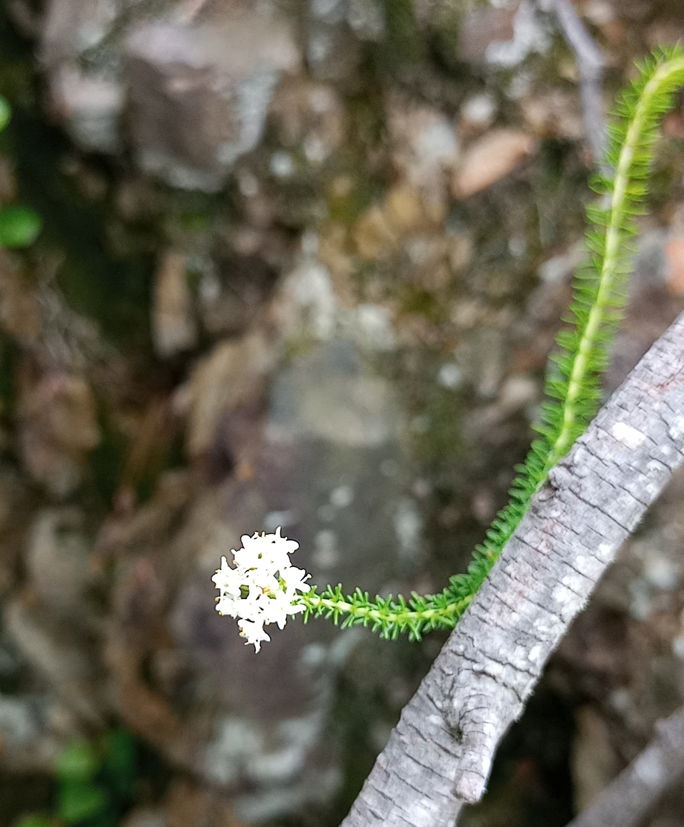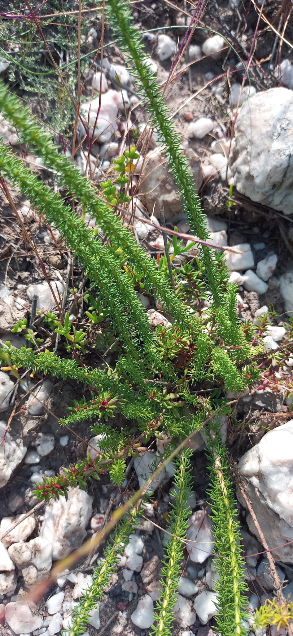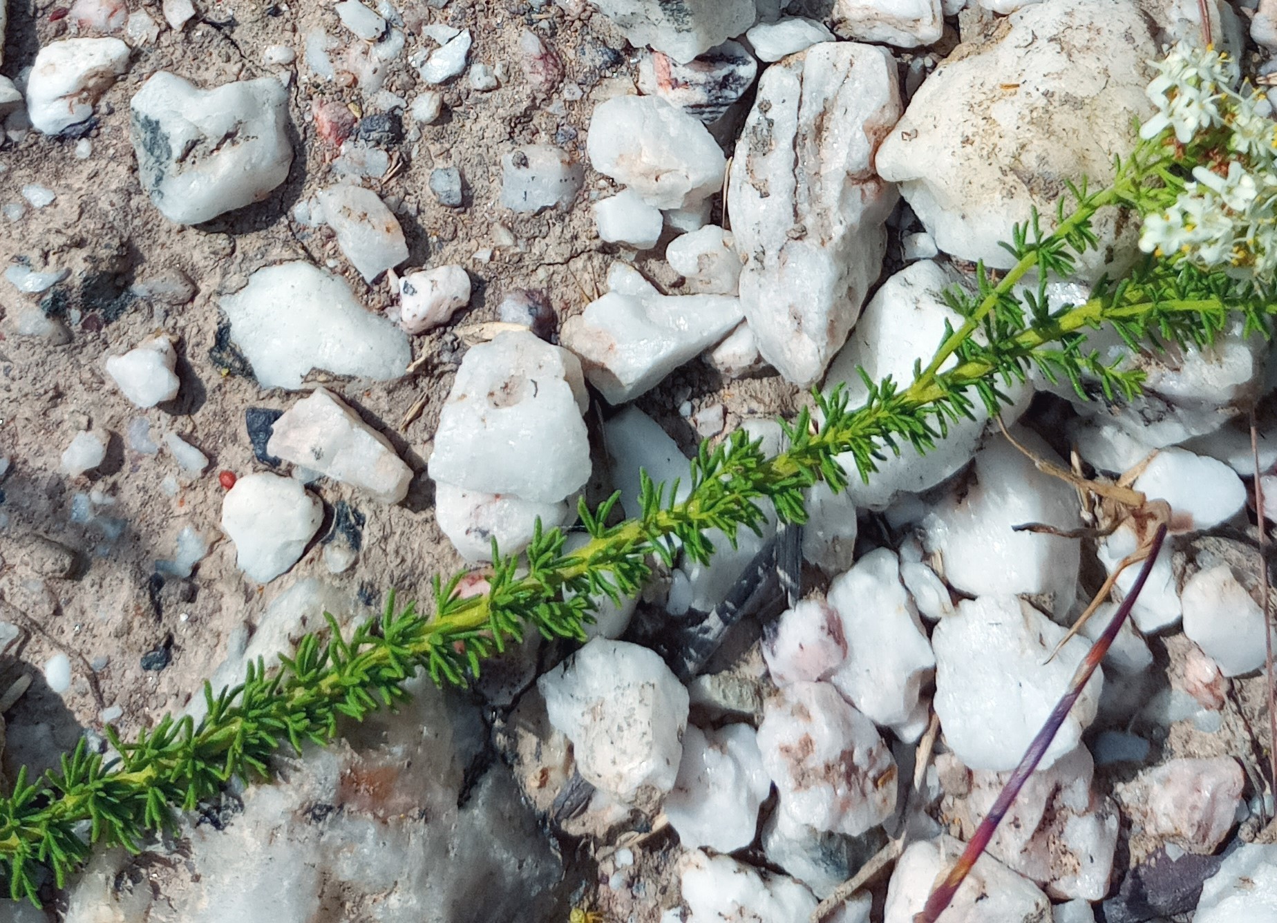 Bushy shrublet 150-600 mm tall, stems pubescent, hairs up 0.1-0.25 mm long, retrorse, closely leafy. Leaves alternate, fascicled, primary leaves 2-7 x 0.5-1.2 mm, ratio lengthy breadth c. 2.5-7:1. linear-oblong to narrowly elliptic, apex obtuse, base scarcely narrowed, margins entire, texture thick, venation invisible, glandular -punctate, sometimes oozing, otherwise glabrous except for a few hairs sometimes on margins at clasping base. Inflorescence a crowded leafy terminal corymb up to c. 60 mm in diam. Bract adnate to pedicel and calyx tube, lowermost 1.8-2.6 x 0.7-1.25 mm, blade elliptic, obtuse, deeply concave, embracing calyx, strongly keeled, margins broad, pale, membranous, glandular - punctate, sometimes oozing, hairs to 0.1 mm on margins. Pedicel (lowermost) 0.1-0.6(-1) mm long. Calyx 1.3-1.8(-2) mm long, campanulate, subequally 5-lobed, lobes 0.4-0.8 mm long, obtuse, minute globular glands scattered all over, few hairs to 0.1 mm on margins. Corolla tube 1.5-1.8(-2) mm long (female flowers not uncommon then much smaller), broadly funnel-shaped, limb 2.5-4.2 mm across lateral lobes, posticous lobes 0.8-1.4 x 0.6-0.8 mm, anticous lobe 1.4-2.3 x 0.7-1 mm, all lobes oblong - elliptic, white (but see comments below). Stamens: posticous filaments 1.2-1.8 mm long; anticous filaments 1.8-2.5 mm, all anthers well exerted. Stigma and style 2-3 mm long, style glabrous. Ovary c. 0.4 x 0.3 mm. Cocci 1.4-1.8 x 0.8-1 mm, brown, rugulose. Flowers have been recorded in all months except August, but the main season is probably November to May. From: Hilliard, OM. 1999. The Tribe Selagineae (Scrophulariaceae). Royal Botanic Garden, Edinburgh. [All rights reserved]