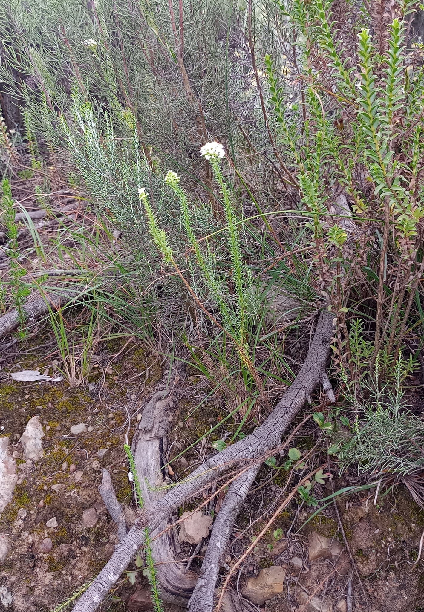 Bushy, dwarf shrub, 150-600 mm high; stems retrorse-pubescent. Leaves: main ones up to 7 x 1.2 mm, linear-oblong to narrowly elliptic, obtuse, margins entire; ± glabrous, secreting glands sometimes present. Flowers crowded in a leafy, terminal corymb up to ± 60 mm in diam. Bracts elliptic, obtuse, margins broad, glandular-punctate with secretion sometimes present, hairs on margins minute. Calyx: lobes obtuse with a few tiny hairs on margins. Corolla white, sometimes blue or mauve. Flowering time Nov.-May. From: Smithies, SJ; Bredenkamp, CL; Magwaza, ZL. 2019. Scrophulariaceae s.l.?. In: CL Bredenkamp (ed.), A Flora of the Eastern Cape Province. Strelitzia 41(2): 1475-1538. South African National Biodiversity Institute, Pretoria. [CC BY]