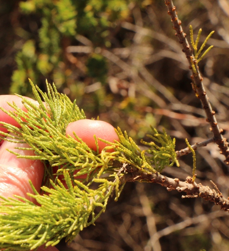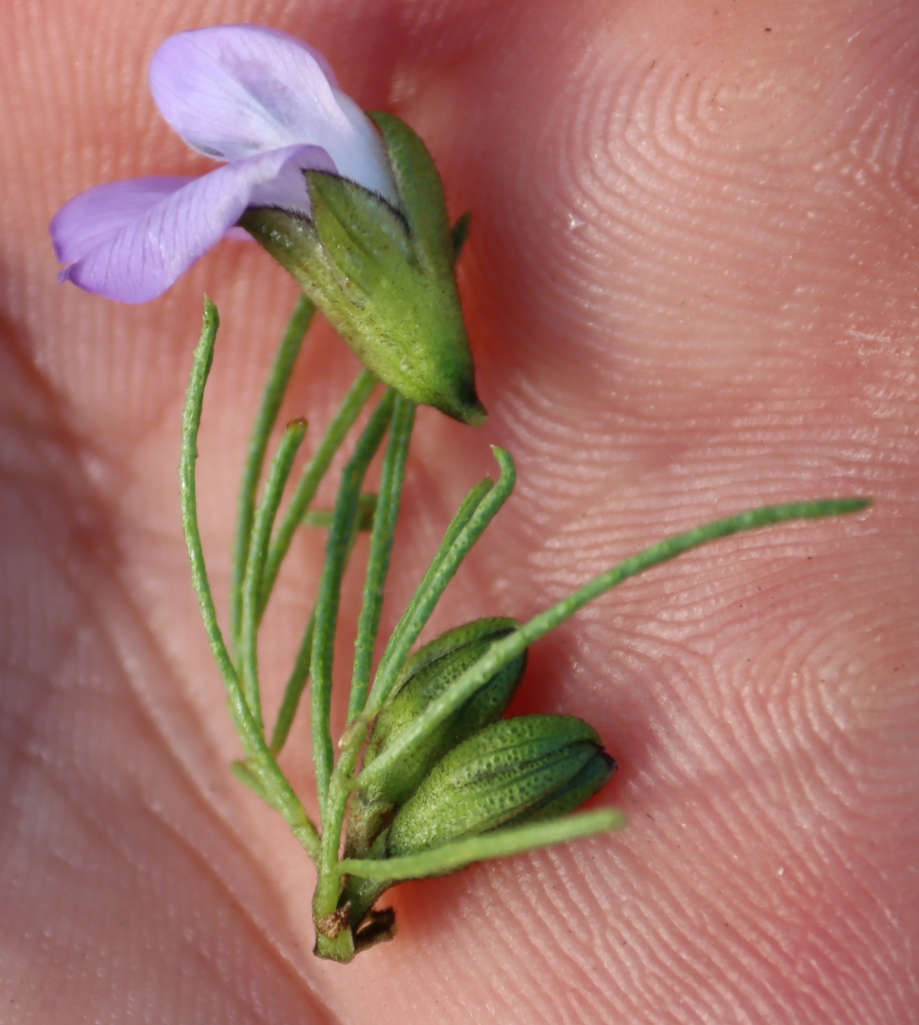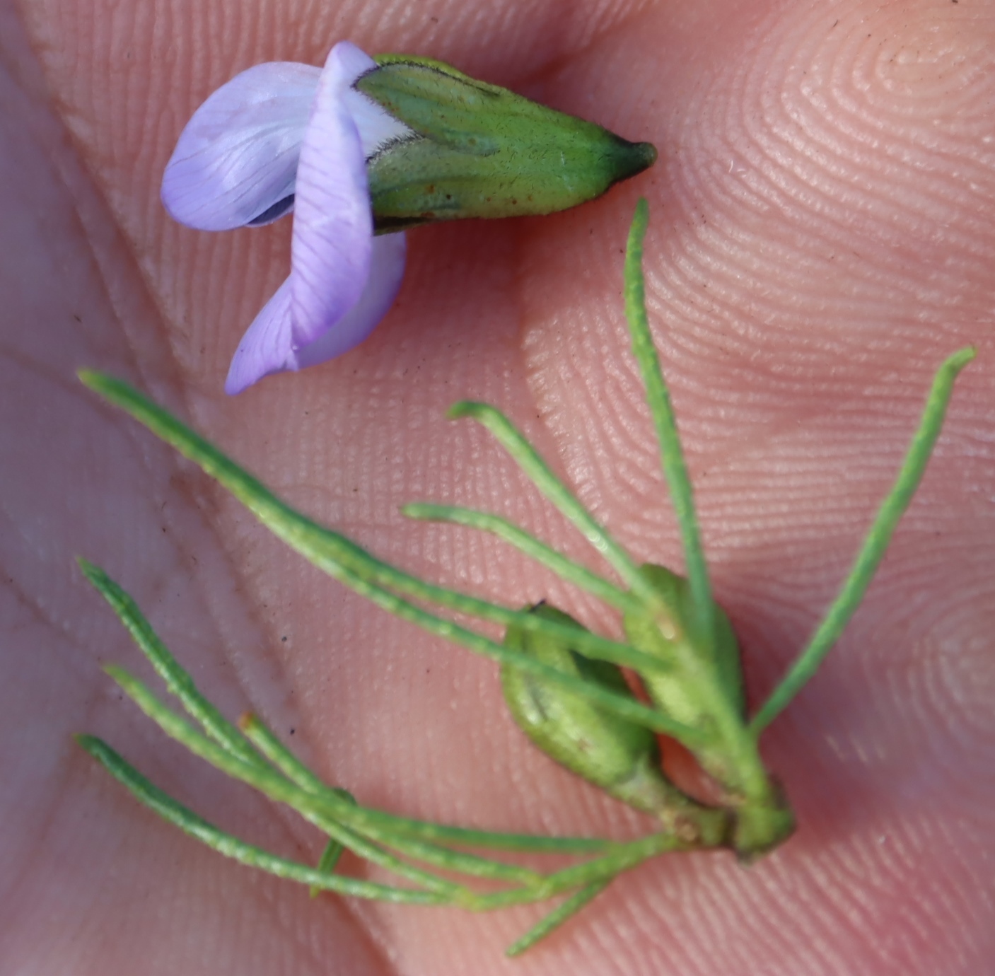 Robust resprouting shrub up to 1.5(2) m tall. Stems many, sub-erect to erect, multi-branched from near the base, rigid, rough, mostly bare except for leafy upper parts, branching at or near the base; young stems green to blackish and finely pubescent, older stems glabrous, grey with dull white storied lenticels giving a striped appearance; stipule scars prominent. Seasonal shoots rough, blackish, hairy. Leaves 5-7-foliolate, crowded at the ends of bare branches, erect, petiolate, with raised glands; leaflets 9-11 x 0.3-0.4 mm, linear lanceolate, glabrous, densely glandular, raised and prominent; terminal leaflet shortest or about the same length as the laterals, basal pair longest, apex of leaflets acute, three uppermost pinnately inserted; petioles 2-3 mm long; rachis 10 mm long; stipules 0.7-2 x 1-1.5 mm, poorly developed but persistent, shorter than the petiole, glabrous. Inflorescences axillary, borne in uppermost 5-9 axils of seasonal shoots, pseudocapitate, congested, 1(2) flowers per axil, pedunculate, pedicels absent; peduncles stout and rigid, 3-4 mm long; cupulum trilobed, glabrous, lobes poorly developed. Flowers 12-14 mm long, mauve. Calyx 5-7 mm long, tube 3-4 x 3.5 mm; lobes equally developed, shorter than the calyx tube, oblong-ovate, sub-acute or rounded at the apex, margins ciliate; glabrous, with dense glands, variable in size, equally distributed across the tube and lobes; ribs present, distinctly thickened. Standard petal 10 x 9 mm, sub-orbicular, pale to dark mauve with purplish veins and a small central violet nectar guide, auricles well-developed, apex emarginate; claw 2-3 mm long. Wing petals 10-14 x 4 mm, cultrate, mauve; auricles well developed, sculpturing present, upper basal and upper left central comprised of 7-9 transcostal lamellae; claw 3-4 mm long. Keel 11-12 x 3-4 mm; claw 5-7 mm long. Androecium 10 mm long, tenth stamen slightly attached, fenestrate. Pistil 11 mm long, ovary 2 mm long, glabrous but with a few small stalked glands; style 6 mm long, straight, then upcurved, swollen beyond point of flexure, height of curvature 3 mm long. Fruits 4-5 x 2.5-3.0 mm, oblong, coarsely reticulate, membranous, black. Seeds 2-4 x 2 mm, blackish grey. From: Bello, A; Stirton, CH; Chimphango, SBM; Muasya, AM. 2017. Taxonomic revision of African Psoralea pinnata species complex (Psoraleeae, Leguminosae). S. African J. Bot. 112: 128-179. [Copyright held by the South African Association of Botanists (2017); http://www.sciencedirect.com/science/journal/02546299] [CC BY]