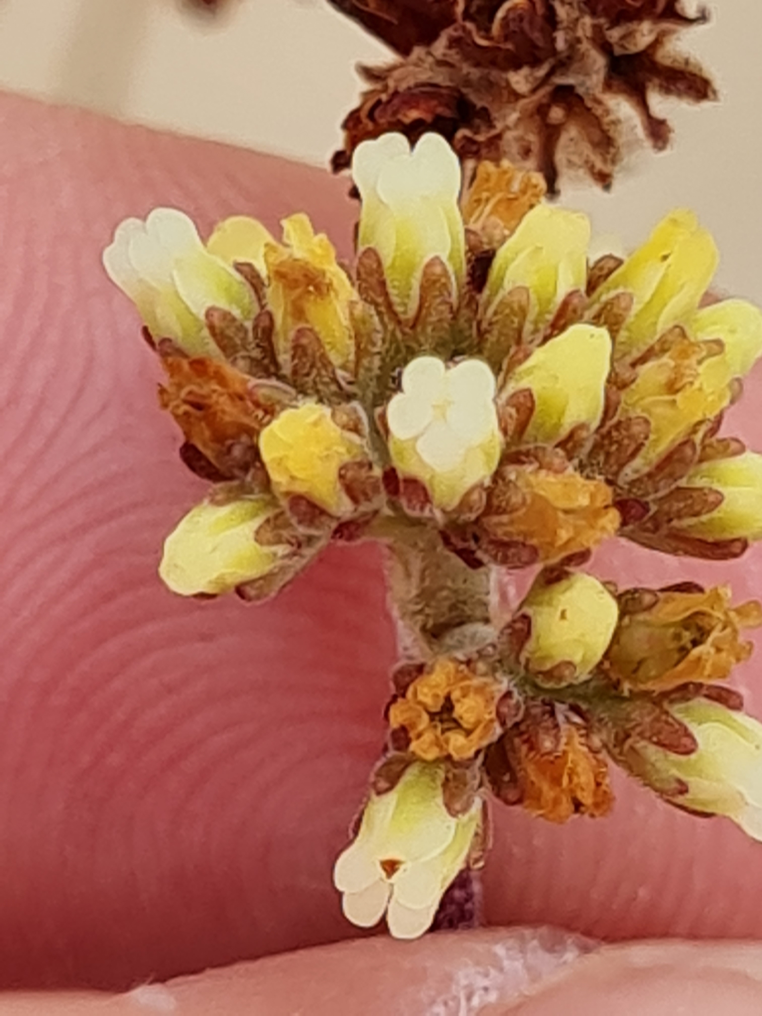 Plants more or less erect but with lateral branches decumbent and rooting where touching ground, with internodes 2-5(-10) mm long and visible between leaves. Leaves oblanceolate, (6-)10-25(-30) x 2-5 mm, glabrous or puberulous. Inflorescence a rounded to flat-topped thyrse (i.e. part-inflorescences are produced by 1 or 2 nodes on central axis) and peduncle with 3-5(-7) bracts without flowers in their axils. Corolla: lobes with dorsal appendage ovoid to almost spherical, 0.4-0.6 mm long and about as long as broad. From: Toelken, HR. 1985. Crassulaceae. Fl. S. Africa 14: 1-229. [CC BY]