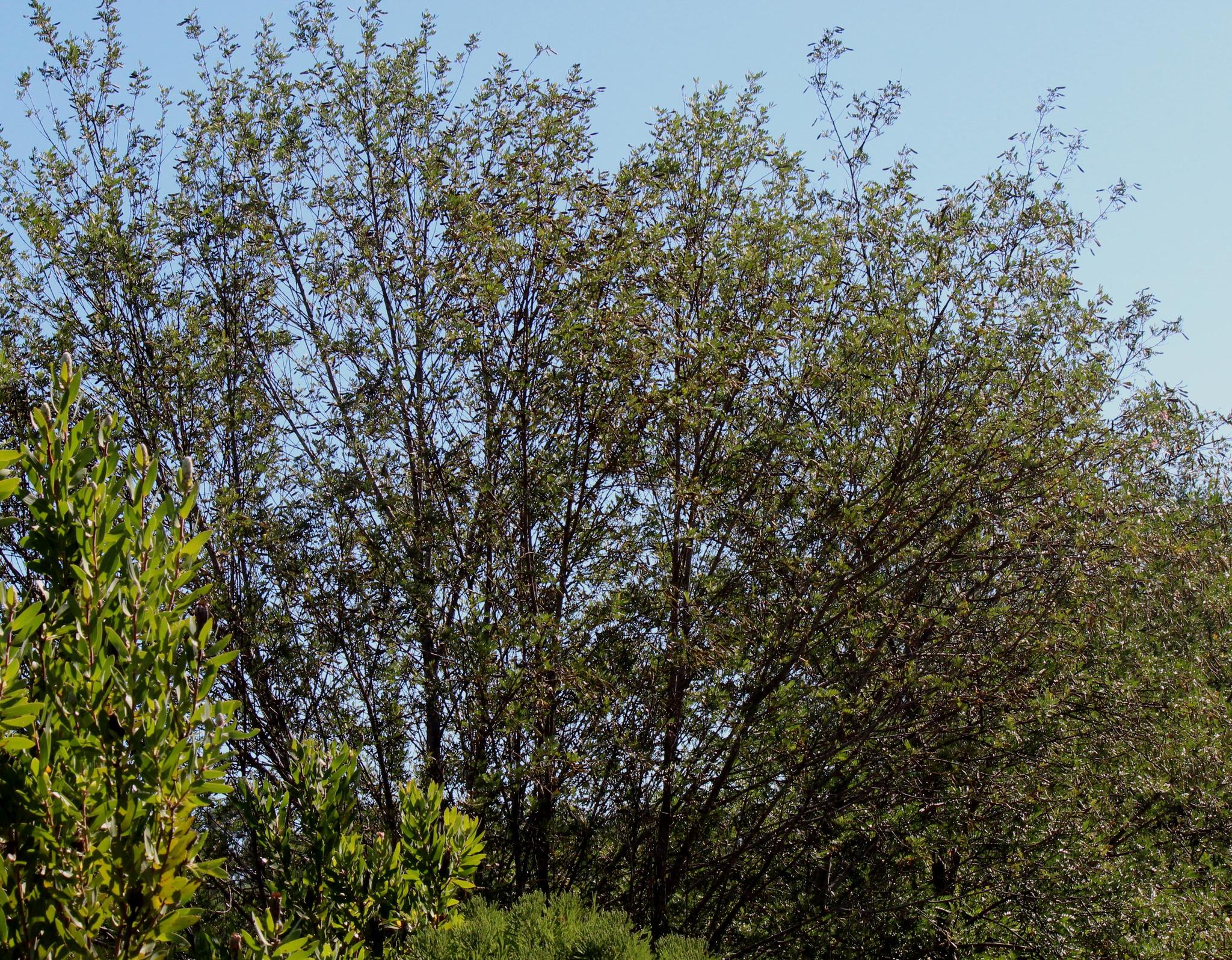 Small tree, 4-8(-16) m tall, basal diameter of trunk up to 0.6 m. Bark smooth. Young parts glabrescent. Pinnae in (2-)7-9(-16) pairs, linear to narrowly ovate; glabrescent at maturity or pubescent along the abaxial midrib only; apex rounded, truncate or emarginate; mucro very small, up to 1 mm long. Stipules (2-)4-6(-10) mm long, (0.5-)1(-2) mm wide. Inflorescence a raceme, often congested and umbel-like, all flowers opening ± simultaneously. Bracts small, acicular, linear or lanceolate, 2-5 x 0.5-3 mm, falling before buds are 5 mm long. Flowers rose-violet or violet-purple (rarely pale pink but then the beak dark purple); pedicels (4-)8-12(-21) mm long, velvety, bracteoles inconspicuous or absent. Nectar guide at base of vexillum prominent. Pollen guide on beak dark purple. Pods up to 12 mm wide. Seeds small, (30-)35-45(-55) mg each. Flowering period - August to January, with a peak in October. From: Van Wyk, AE. 1986. A revision of the genus Virgilia (Fabaceae). S. African J. Bot. 52: 347-356. [Copyright held by the South African Association of Botanists (1986); http://www.sciencedirect.com/science/journal/02546299] [CC BY]