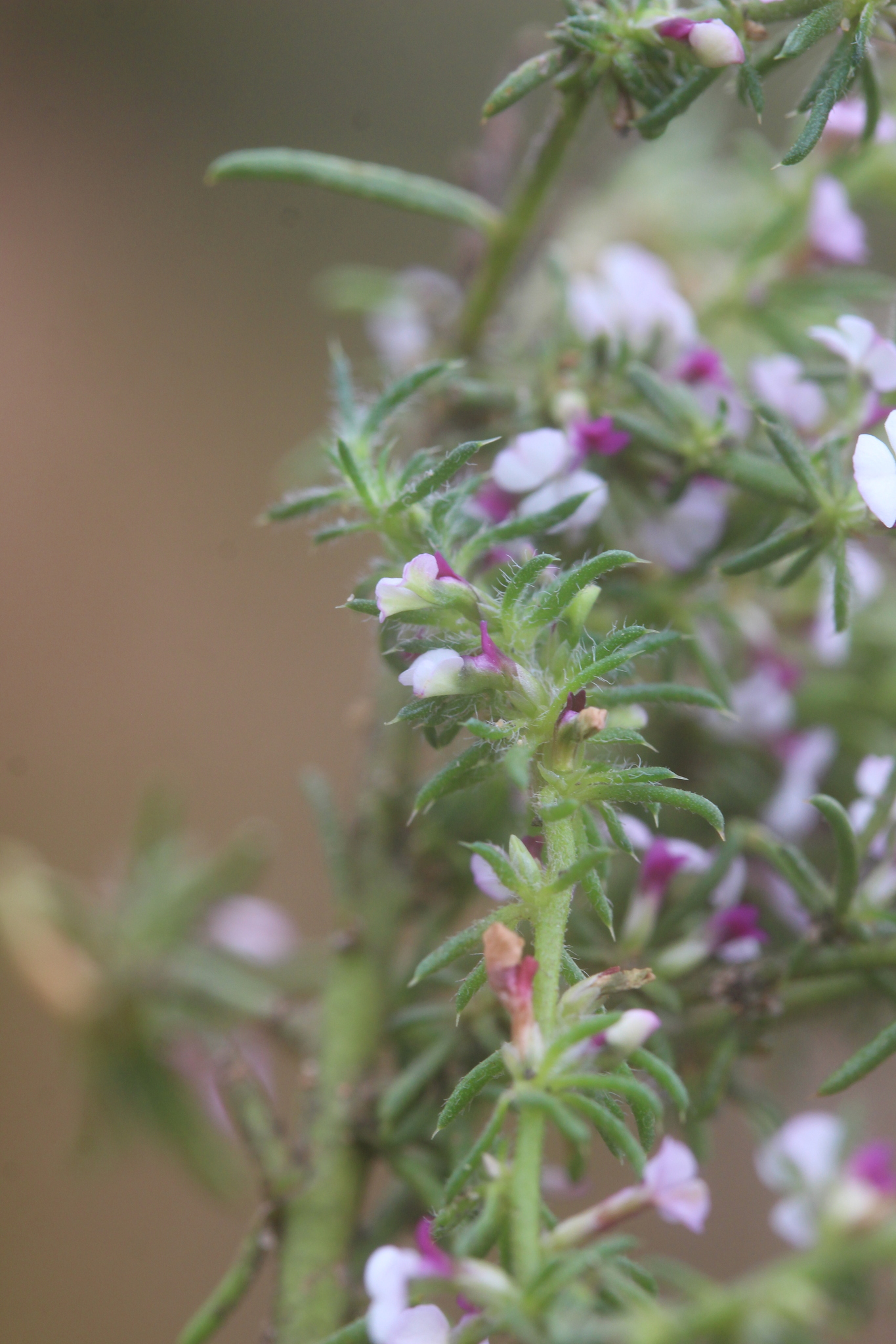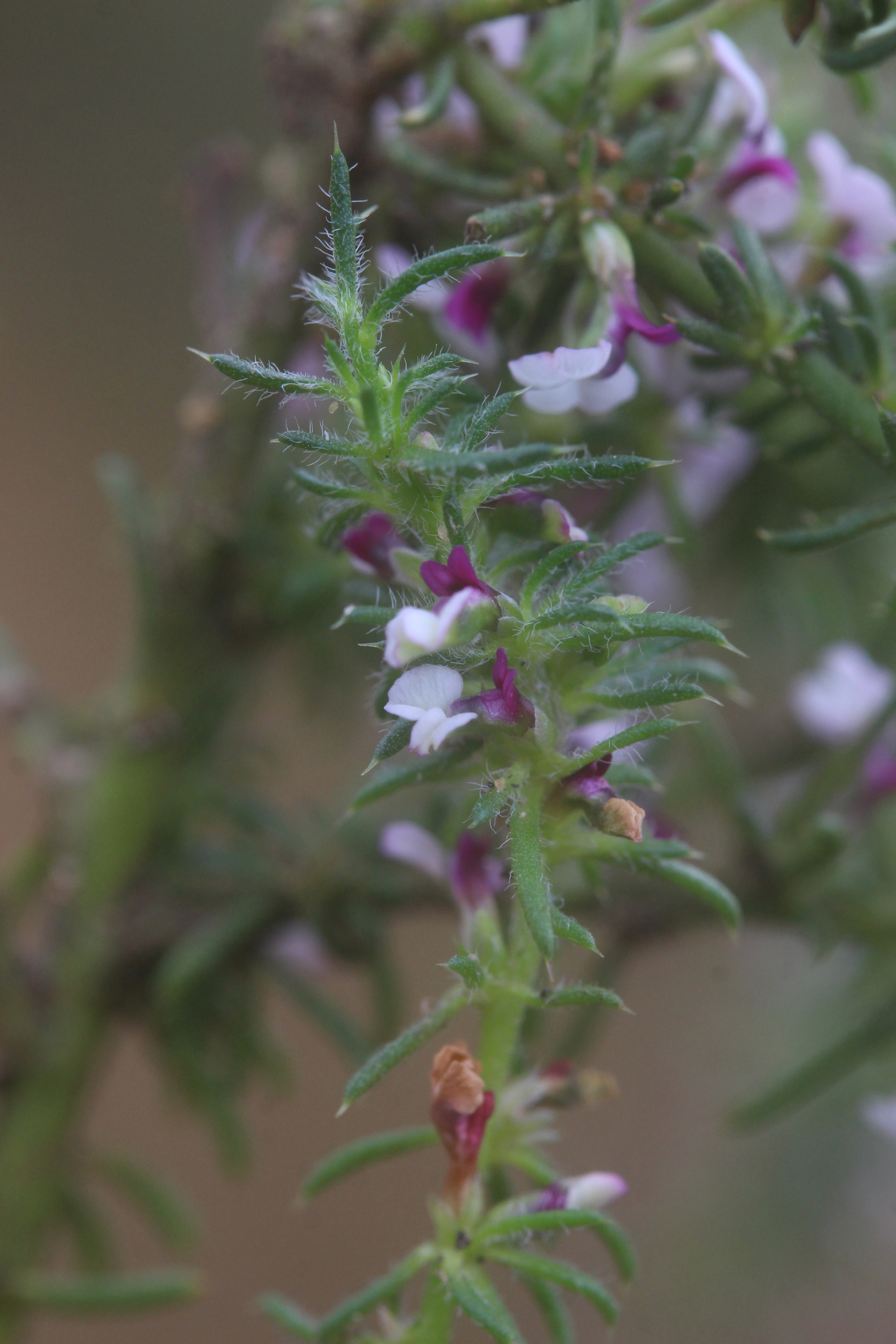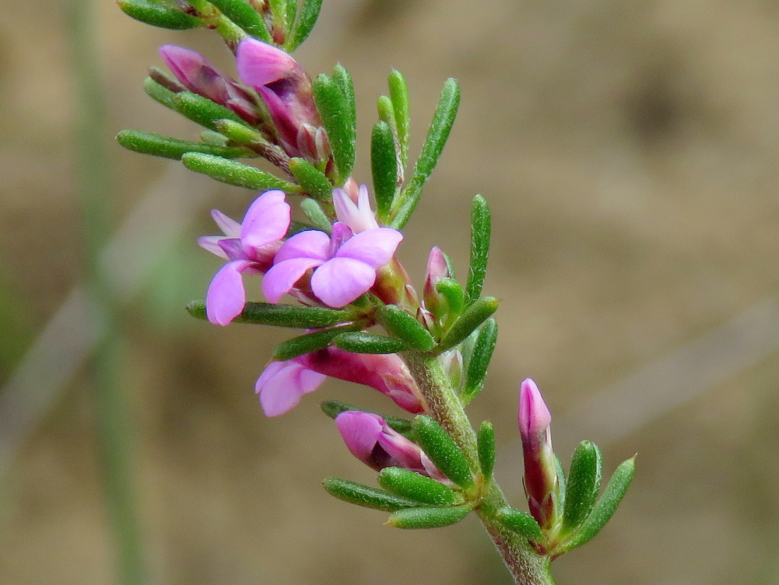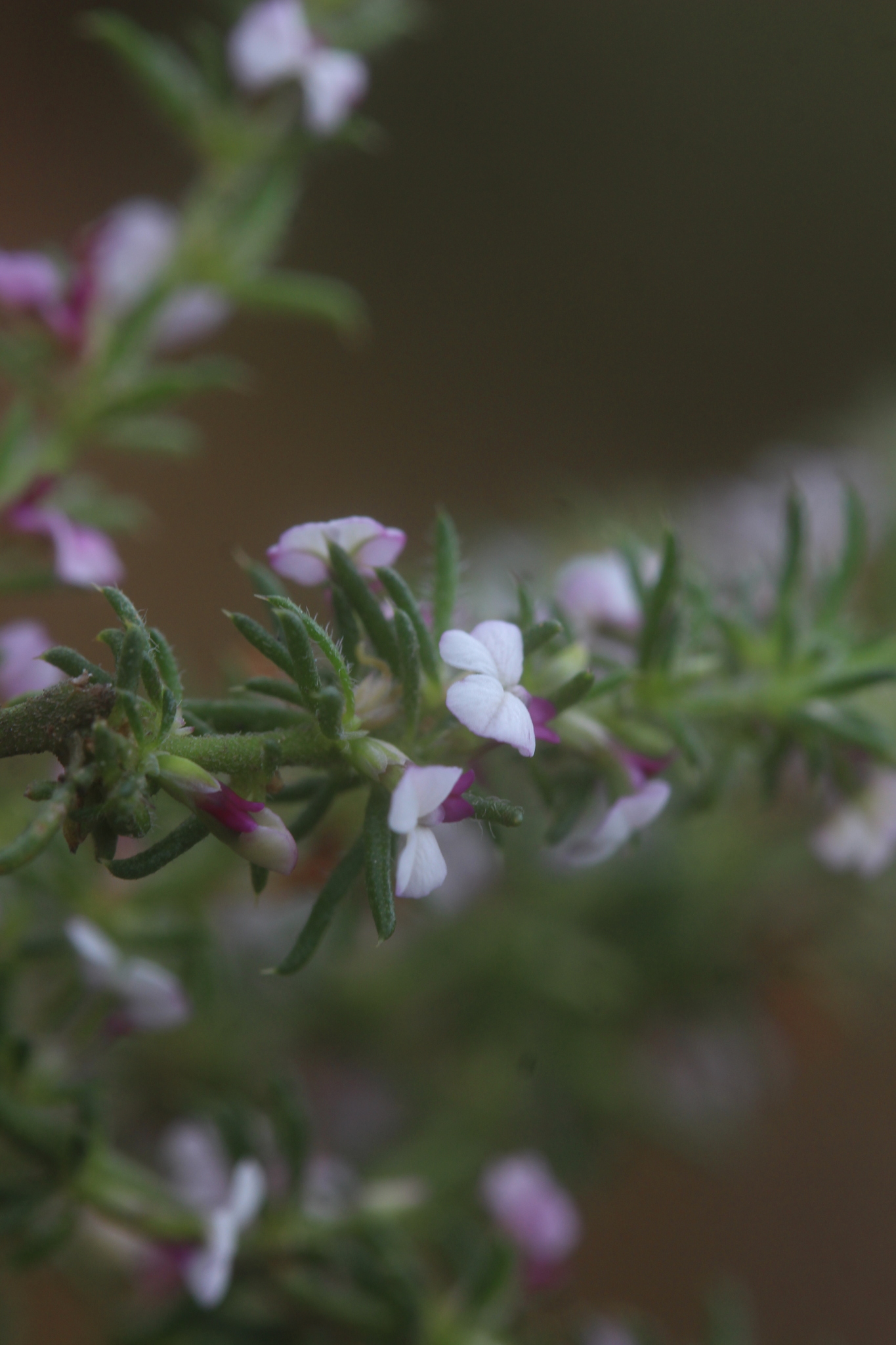 A somewhat decumbent undershrub up to 25 cm high. Young stems hirsute or tomentose, becoming rough later. Leaves acicular, shortly hairy or scabrous below, almost glabrous above, spine-tipped, the spine straight or reflexed, fasciculate: the primary 5.0-7.0 mm long, about the same width throughout: the secondary similar but more slender and narrowed at the base. Bracts 0.6-0.8 mm long, ovate, acute or obtuse, concave, ciliate. Flowers 4.0-5.0 mm long, pink, sessile. Sepals acute or acuminate, ciliate, glabrous or slightly rough outside: the outer concave, ovate: the inner slightly longer, almost flat, lanceolate, half to two-thirds the length of the side petals. Side petals narrow, broadest below the middle, turning upwards and outwards, appearing obliquely truncate when flattened, shorter than the carina. Claw of the carina a little shorter than or as long as the limb: the line of attachment of the crest short, the width of the crest not much less than the length of the carina, the upper and lower lobes more or less equal in size. Ovary with very short hairs on the horns: the anterior style branch minute or lacking, the posterior at right angles to the style, the stigma oblique. Capsule unknown. Very short hairs on the horns: the anterior style branch minute or lacking, the posterior at right angles to the style, the stigma oblique. Capsule unknown. From: Levyns, MRB. 1954. The genus Muraltia. J. S. African Bot.: 1-247. [CC BY]