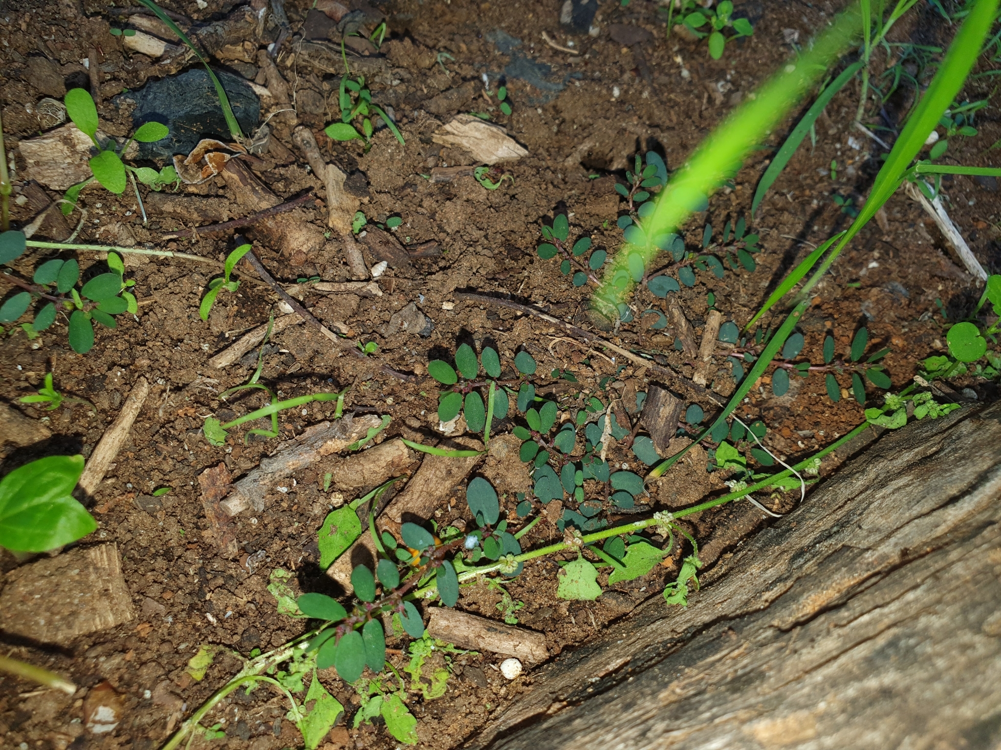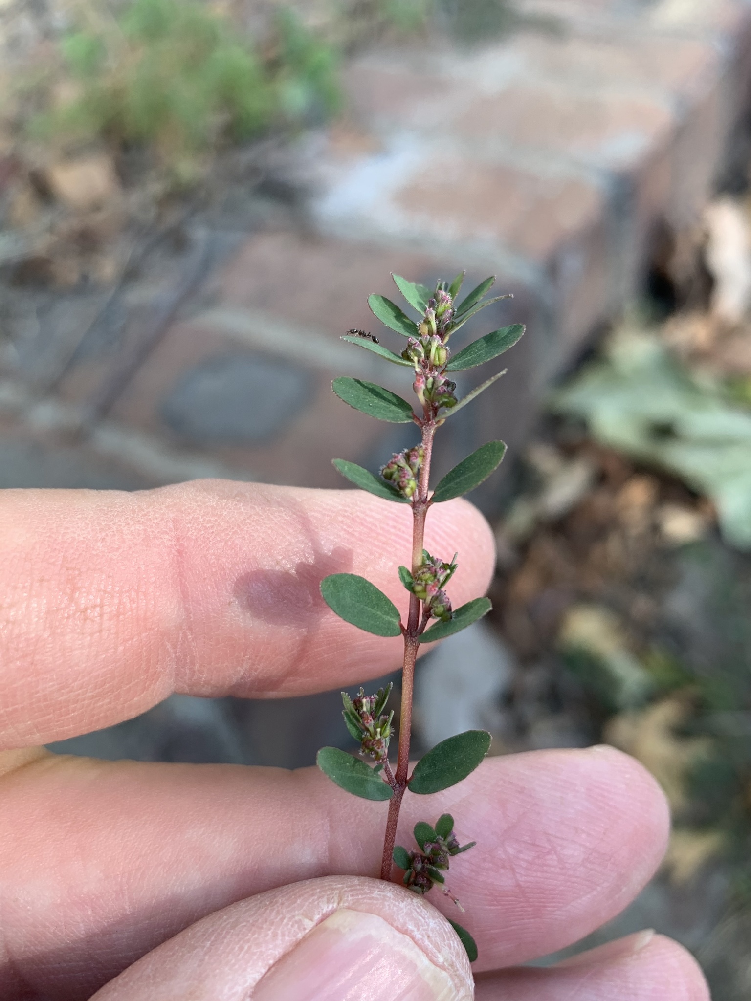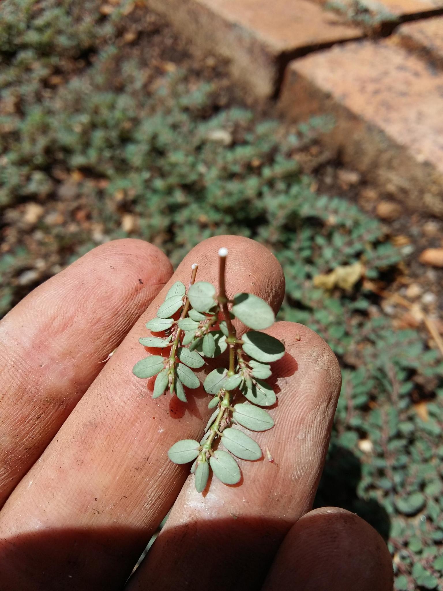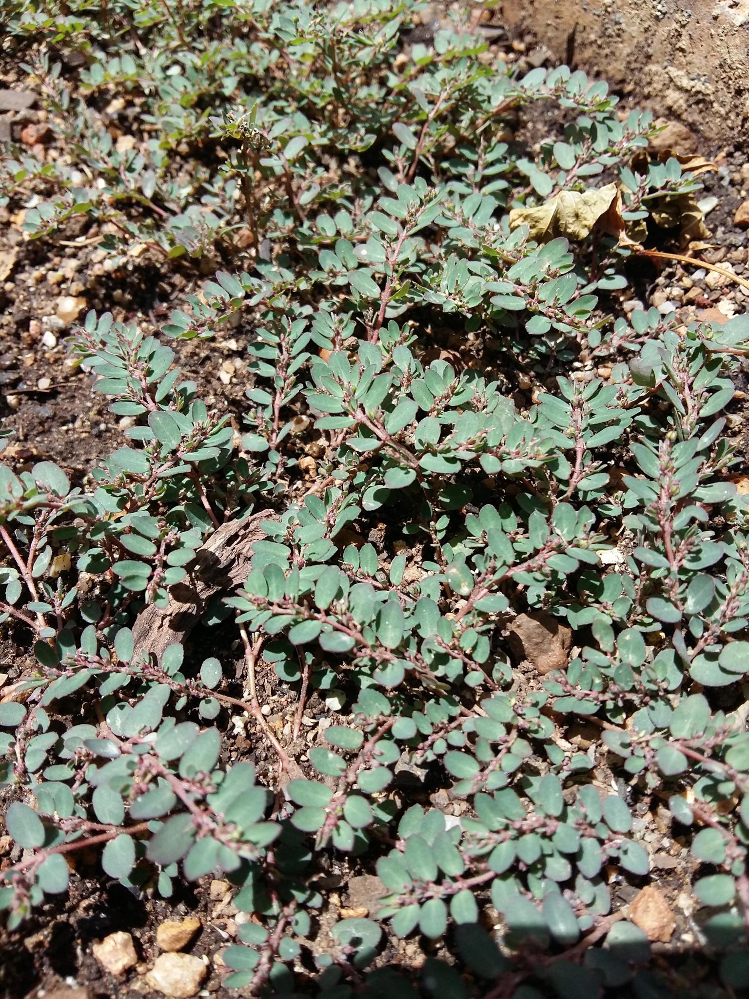 Prostrate, annual herb, glabrous on underside, pilose above, often tinged purplish. Leaves ovate, up to 8 x 5 mm. Capsule with a row of hairs along each suture. Flowers green. From: Retief, E; Herman, PPJ. 1997. Plants of the northern provinces of South Africa: Keys and diagnostic characters. Strelitzia 6: 1-681. National Botanical Institute, Pretoria. [CC BY] As: Chamaesyce prostrata (Aiton) Small