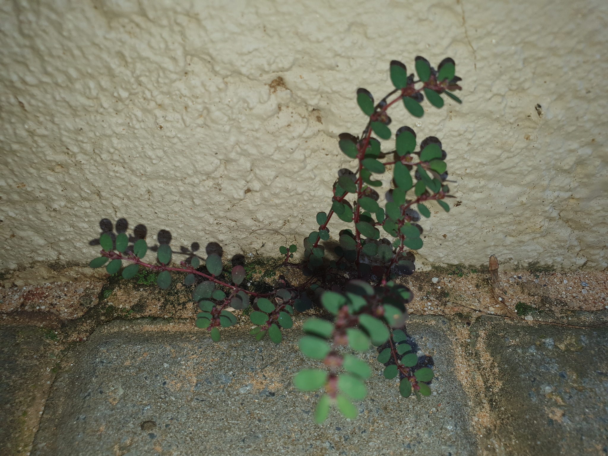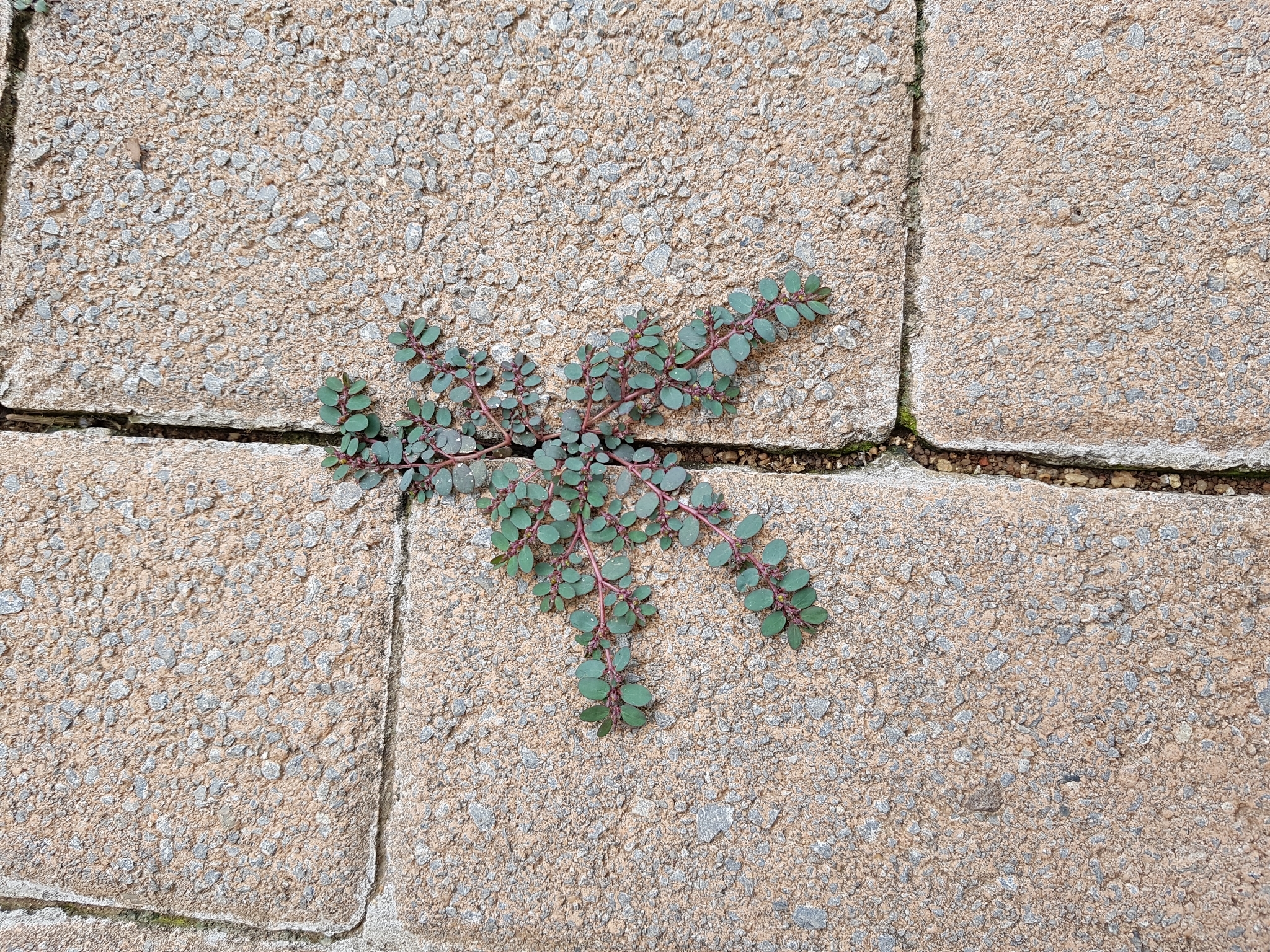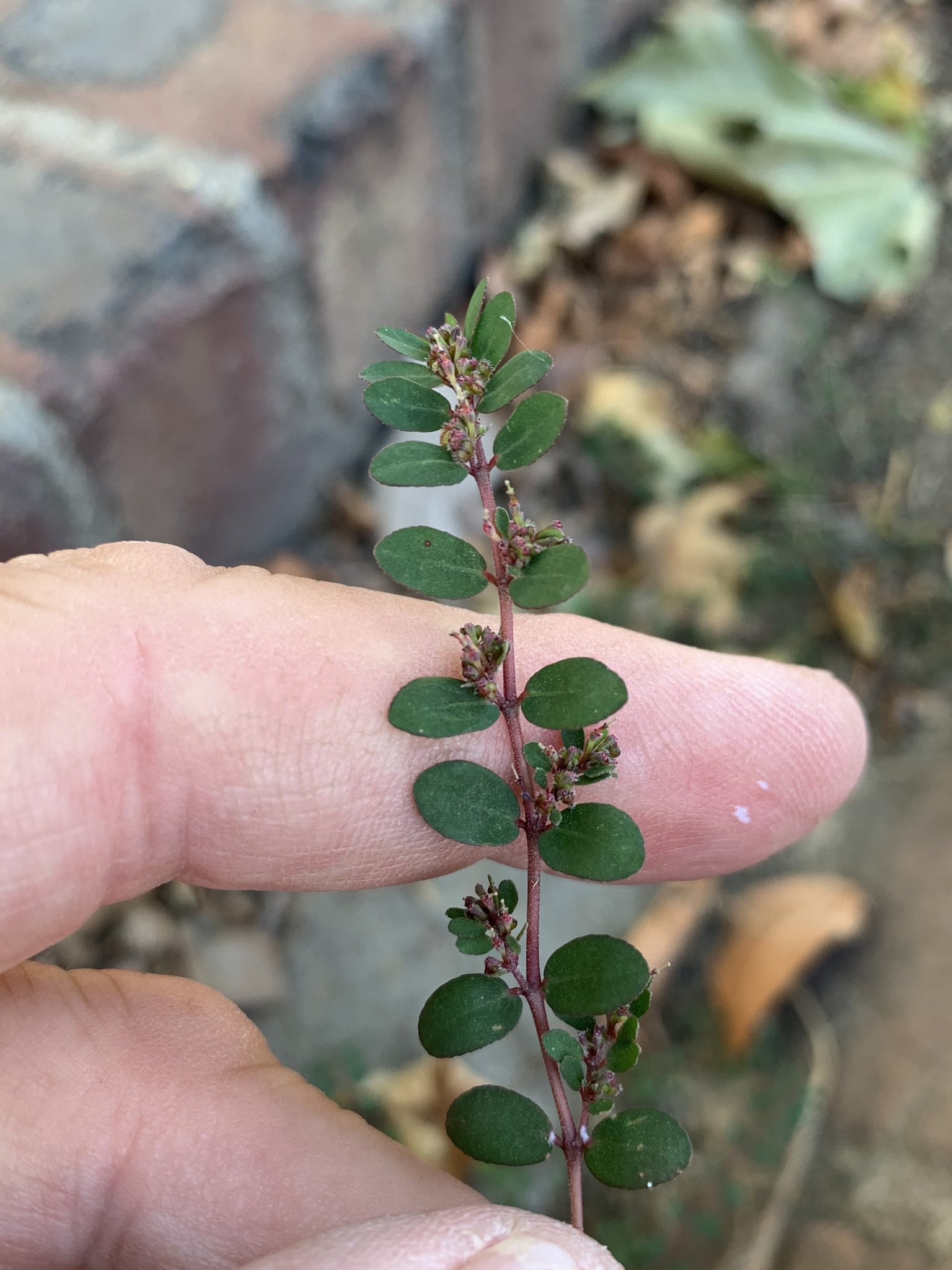 Prostrate, annual herb, glabrous on underside, pilose above, often tinged purplish. Leaves ovate, up to 8 x 5 mm. Capsule with a row of hairs along each suture. Flowers green. From: Retief, E; Herman, PPJ. 1997. Plants of the northern provinces of South Africa: Keys and diagnostic characters. Strelitzia 6: 1-681. National Botanical Institute, Pretoria. [CC BY] As: Chamaesyce prostrata (Aiton) Small