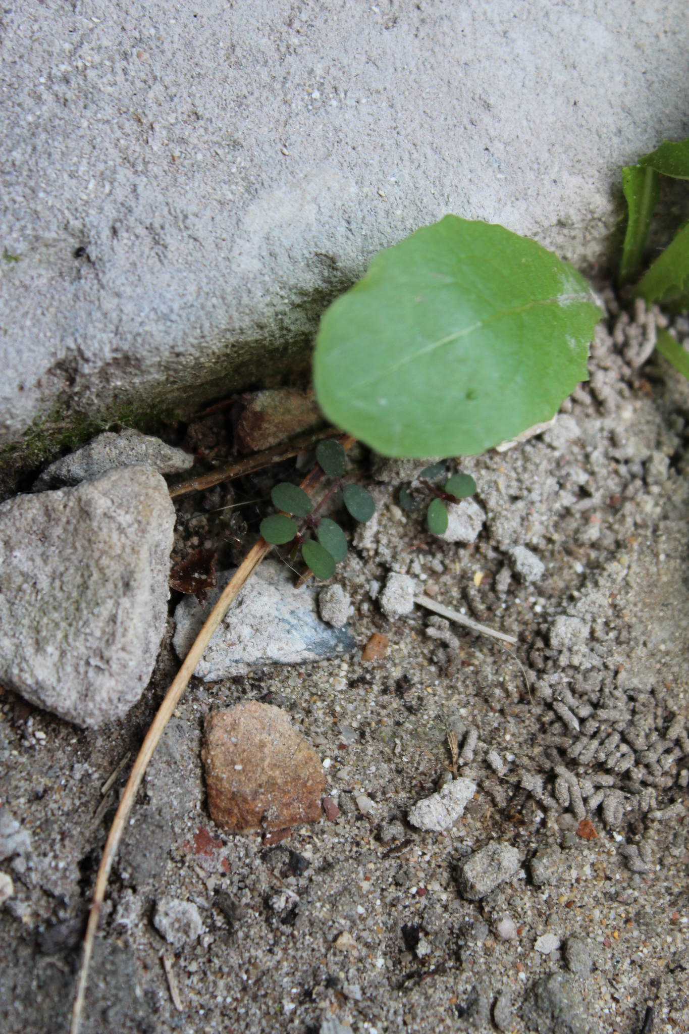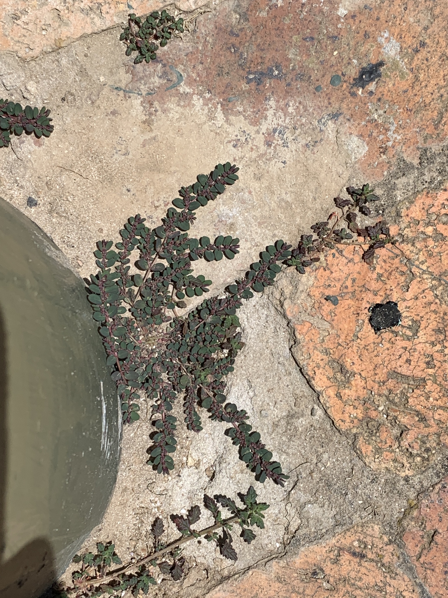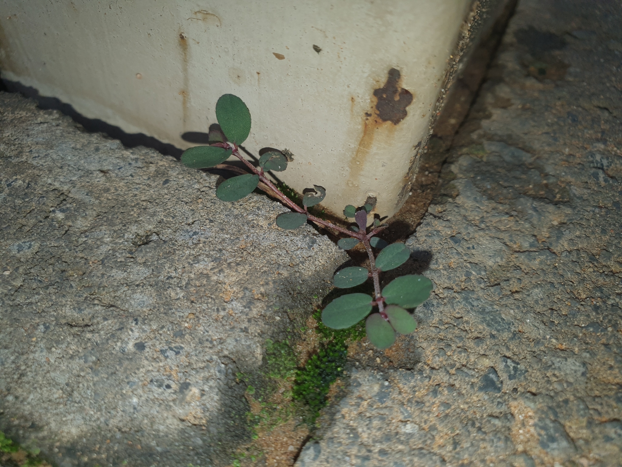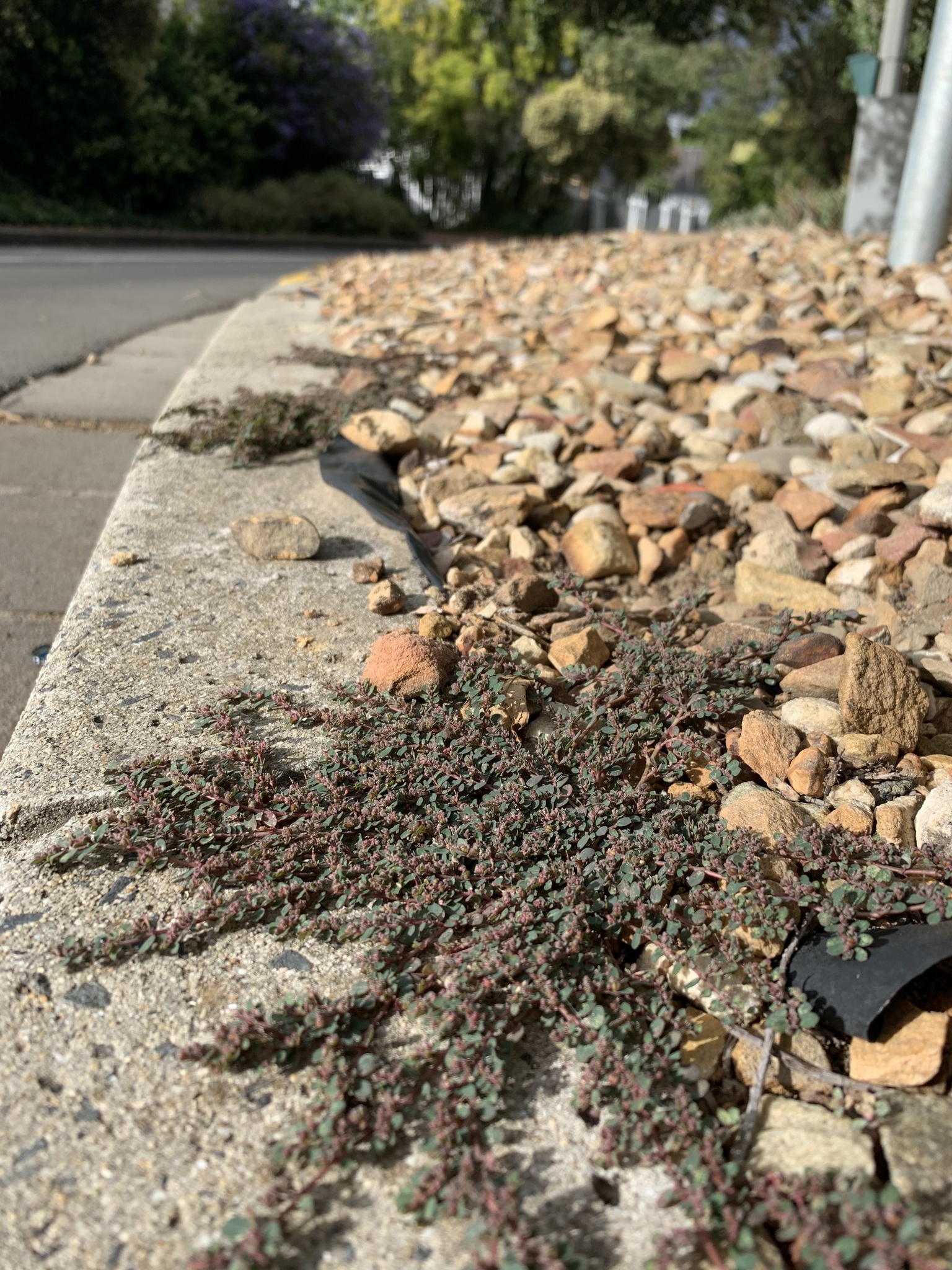 Prostrate, annual herb, glabrous on underside, pilose above, often tinged purplish. Leaves ovate, up to 8 x 5 mm. Capsule with a row of hairs along each suture. Flowers green. From: Retief, E; Herman, PPJ. 1997. Plants of the northern provinces of South Africa: Keys and diagnostic characters. Strelitzia 6: 1-681. National Botanical Institute, Pretoria. [CC BY] As: Chamaesyce prostrata (Aiton) Small