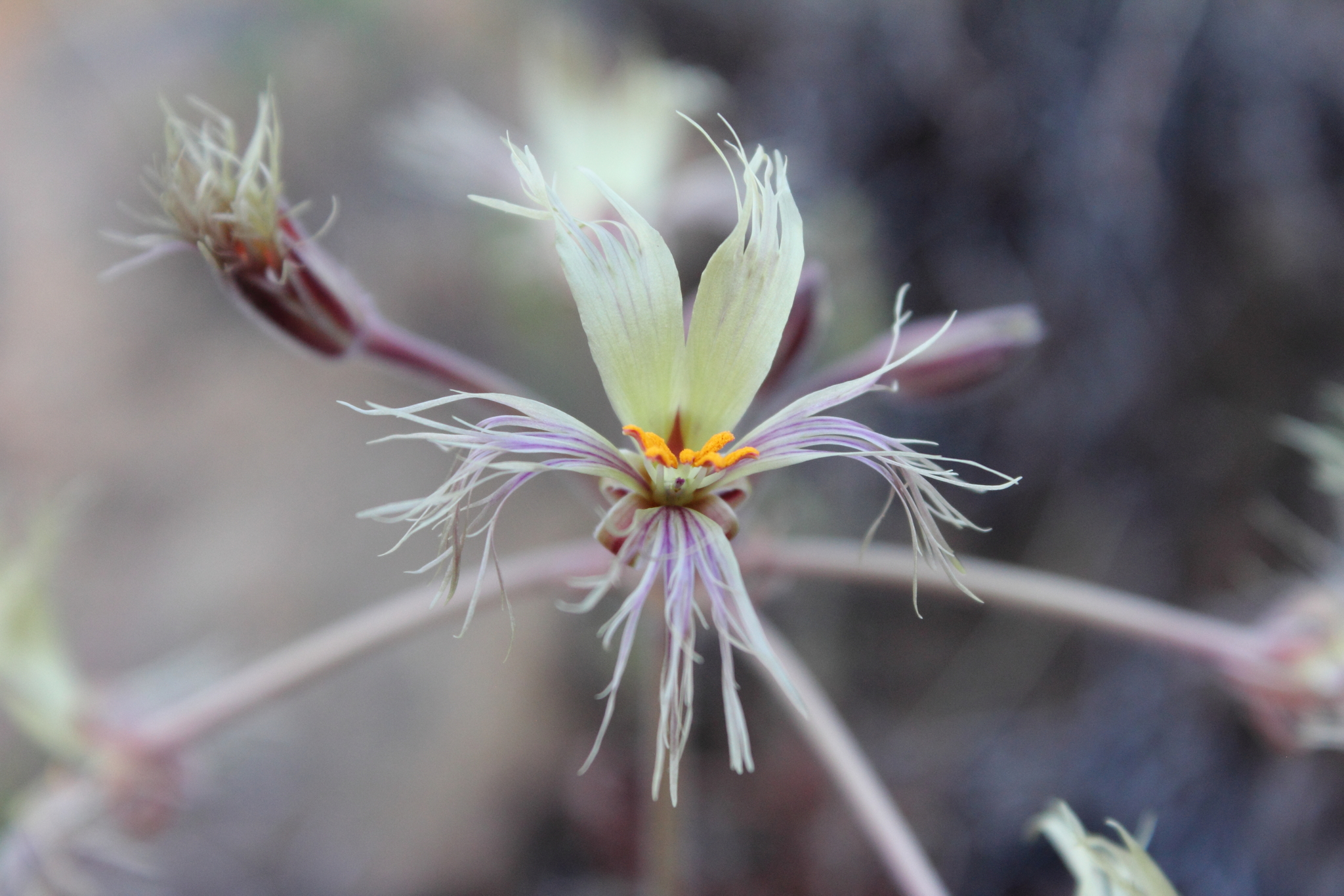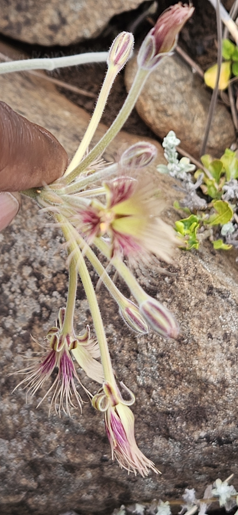 Tuft-like geophyte, 0.2-0.4 m high; subterranean tuber, aerial parts deciduous. Leaves erect, lamina narrowly ovate, up to 250 x 50(-70) mm, segments linear, tripinnately compound; pubescent to pilose, sessile glands interspersed; petioles up to 200 mm long. Stipules narrowly triangular, membranous. Inflorescence an erect, unbranched scape, up to 350 mm long, bearing a 4-12-flowered pseudo-umbel; pedicels 4-16 mm long. Petals 5, light yellowish green, fan-shaped, fimbriate for 1/2-2/3 their length; posterior two 29 x 23 mm, veins light purple; anterior three up to 29 x 25 mm, veins dark purple. Fertile stamens 7; pollen yellow to orange. Flowering time Sept.-Nov. From: Bredenkamp, CL; Retief, E; Masupa, TT. 2019. Geraniaceae. In: CL Bredenkamp (ed.), A Flora of the Eastern Cape Province. Strelitzia 41(2): 1079-1108. South African National Biodiversity Institute, Pretoria. [CC BY]