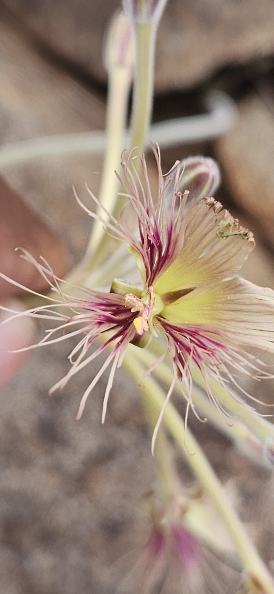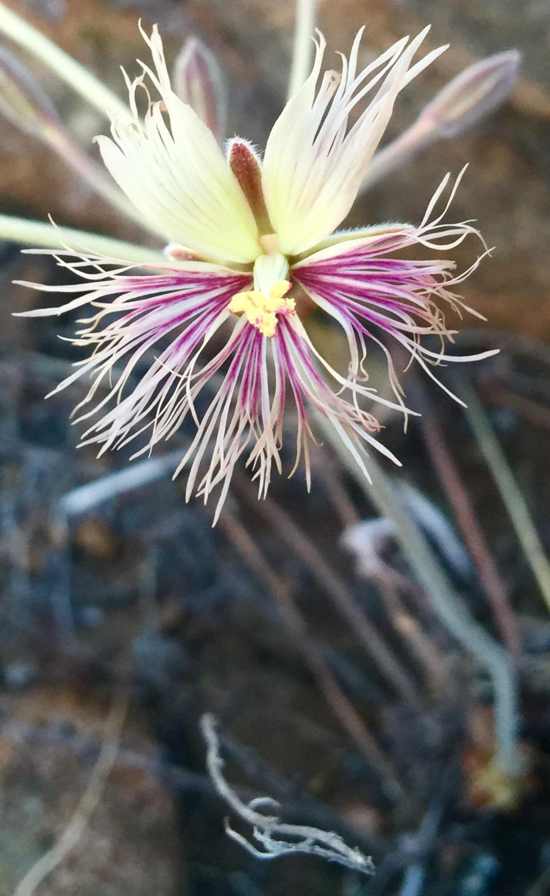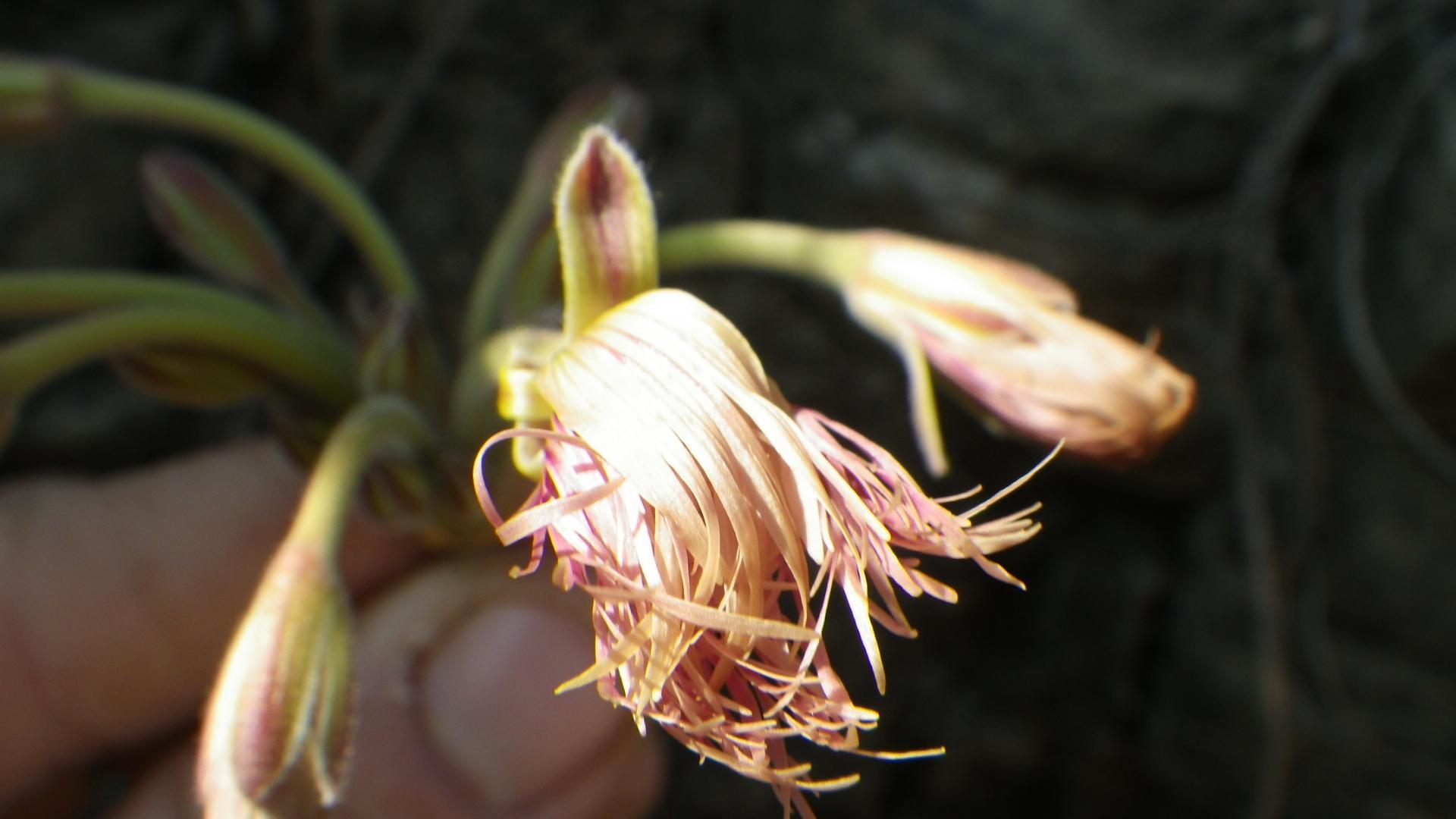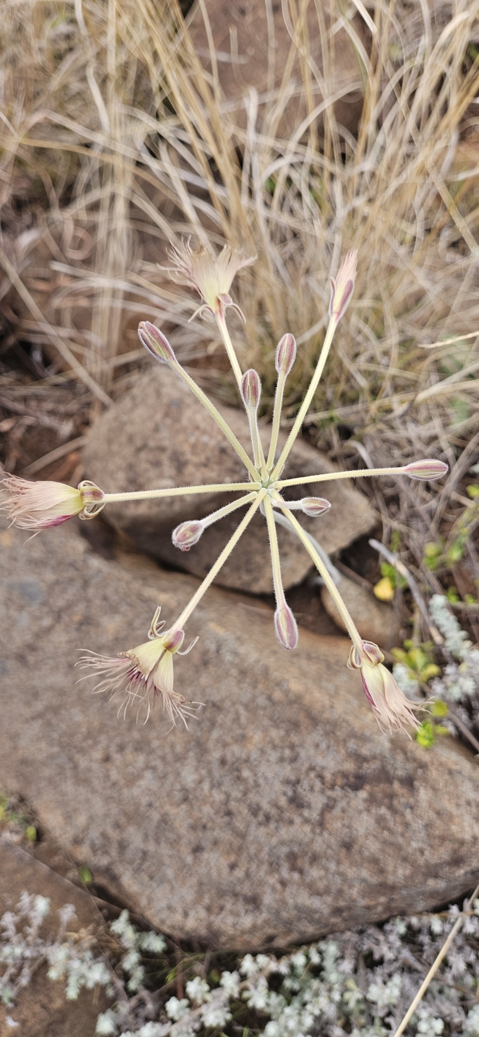 General notes: Grassland, dry sandy soil, Molteno. Full sun, south eastern aspect, steep slope, burnt, very rocky. Herb, 0,4 m high. Flowers green and maroon; petals 'shreded'. No leaves. Occasional.