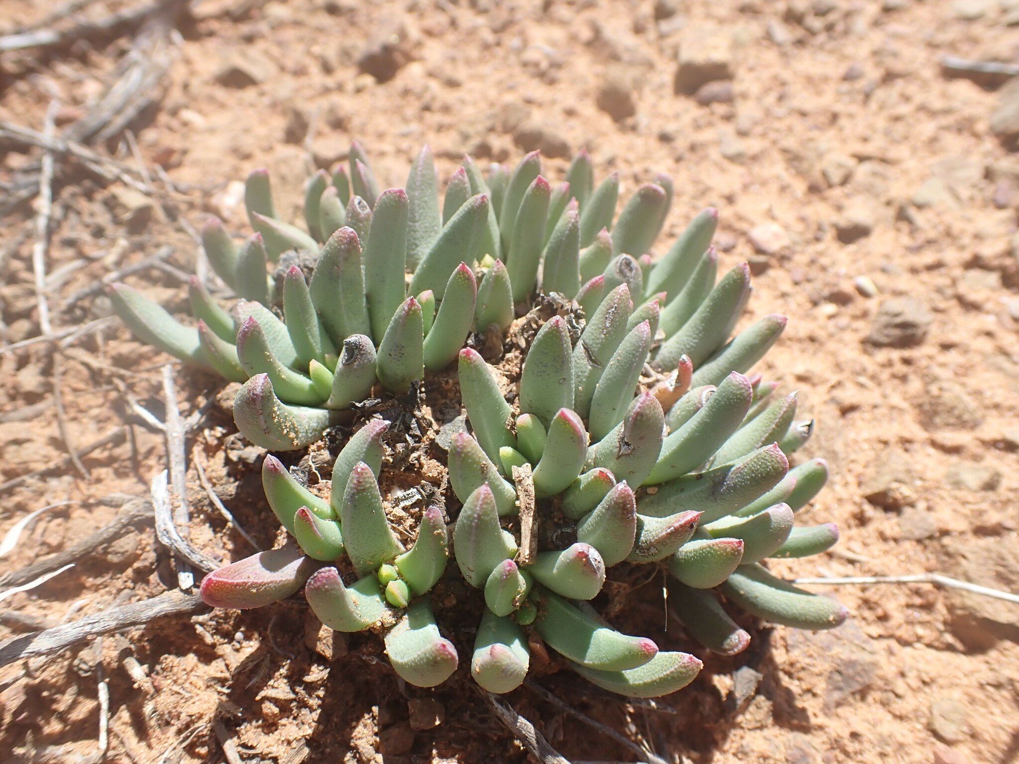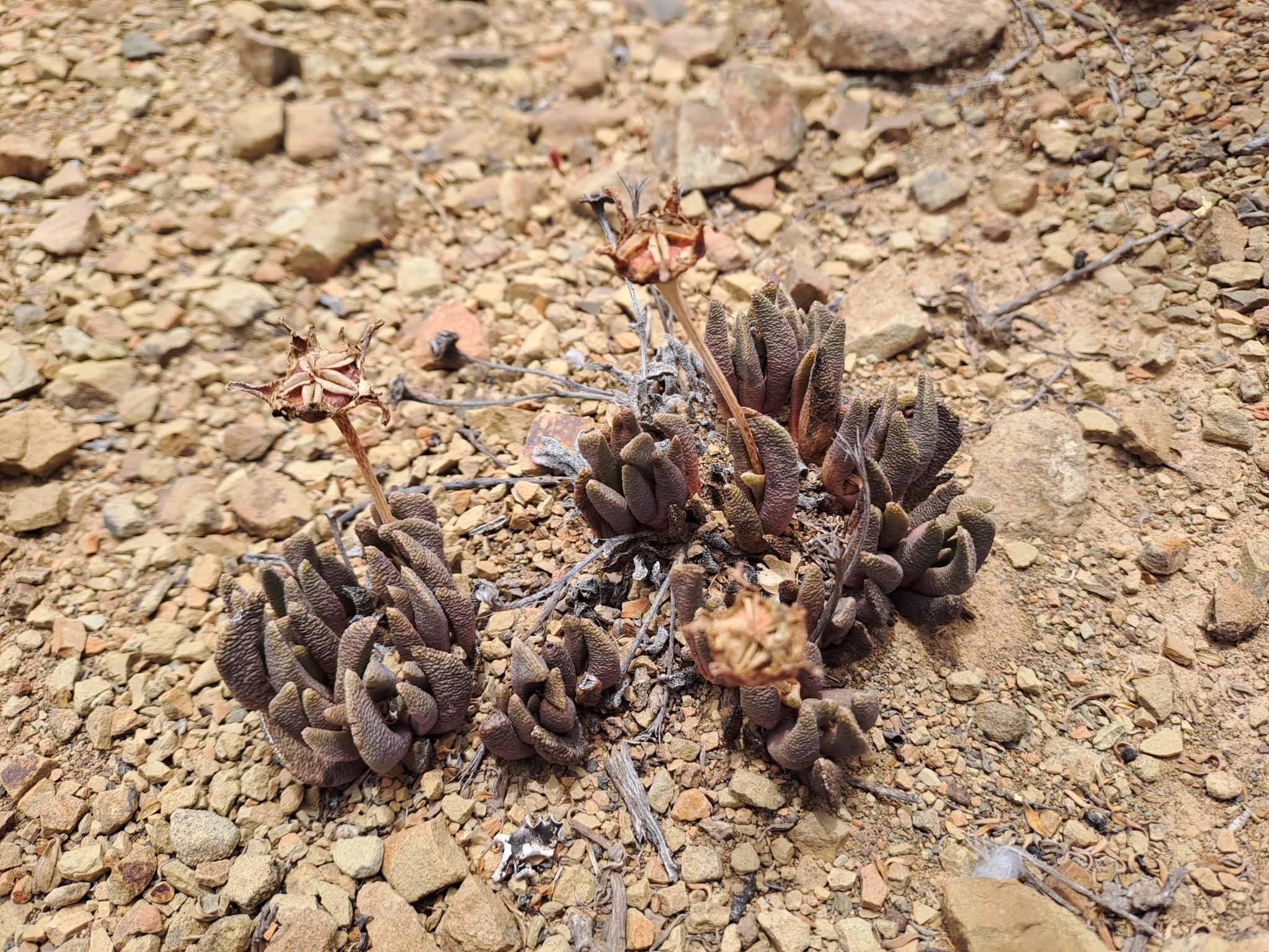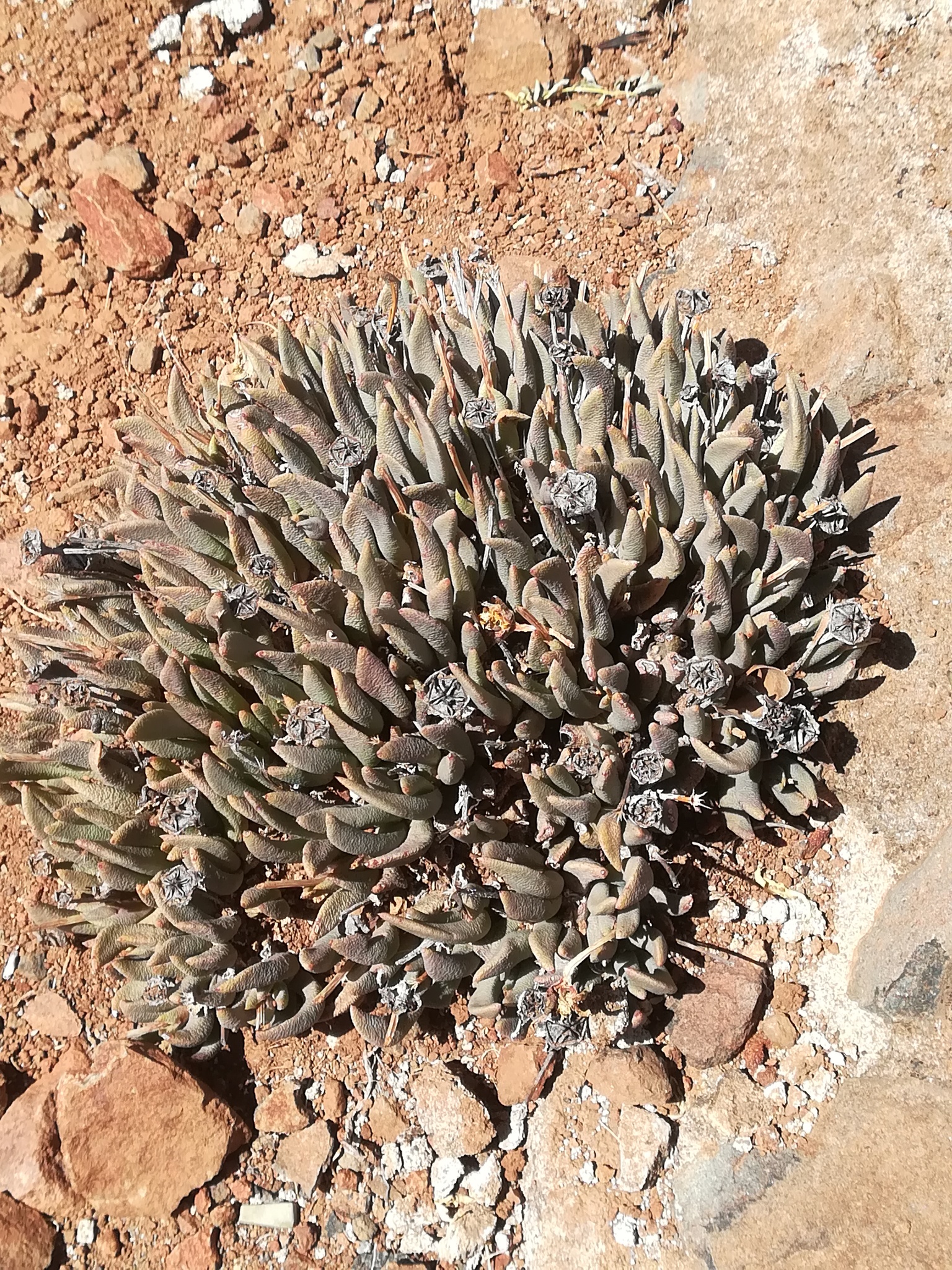 Perennial, caespitose, dwarf shrublet, up to 0.05 m high, stems reduced, forming small dense clumps, roots succulent. Leaves subfalcate to incurved, epidermis rough, cells of keel and margins almost denticulate. Flowers pedicellate, solitary, yellow. Flowering time winter and spring. Capsules 5-locular, dark brown, woody. From: Burgoyne, PM; Bredenkamp, CL. 2019. Aizoaceae: Hereroa (Schwantes) Dinter & Schwantes. In: CL Bredenkamp (ed.), A Flora of the Eastern Cape Province. Strelitzia 41(1): 230-231. South African National Biodiversity Institute, Pretoria. [CC BY]