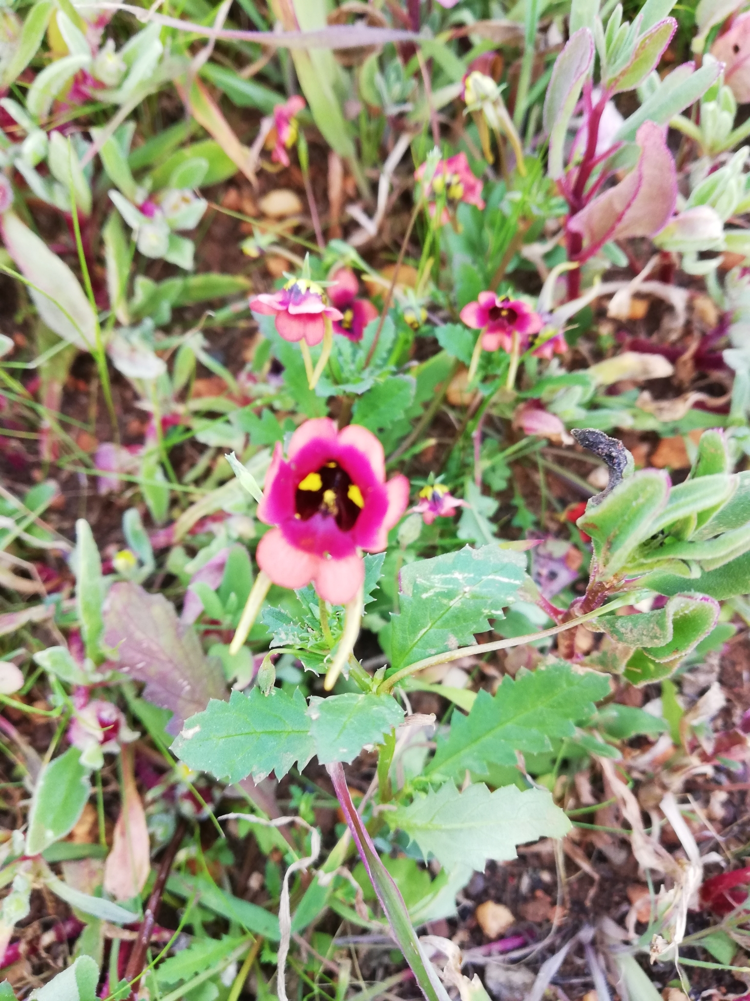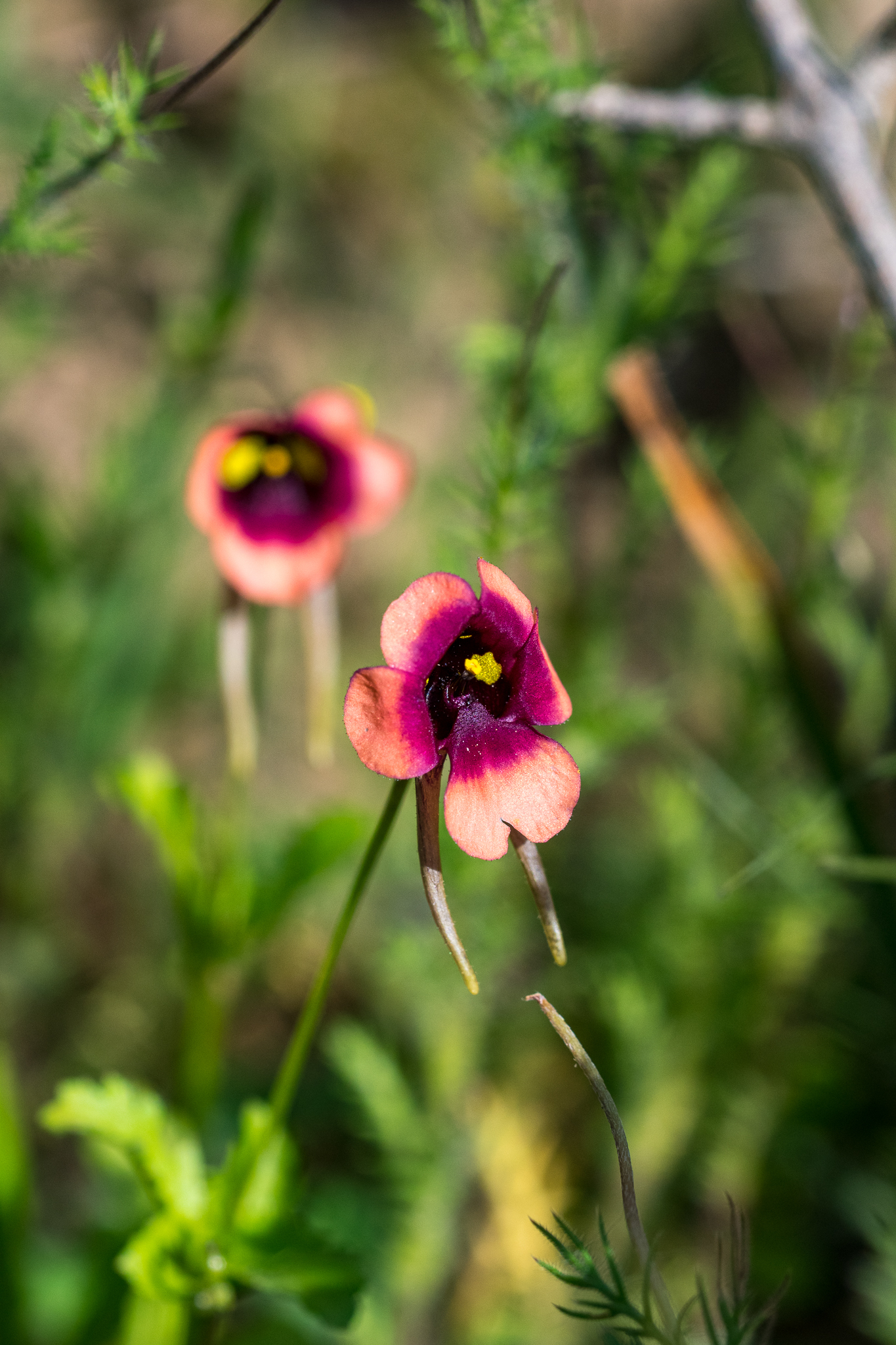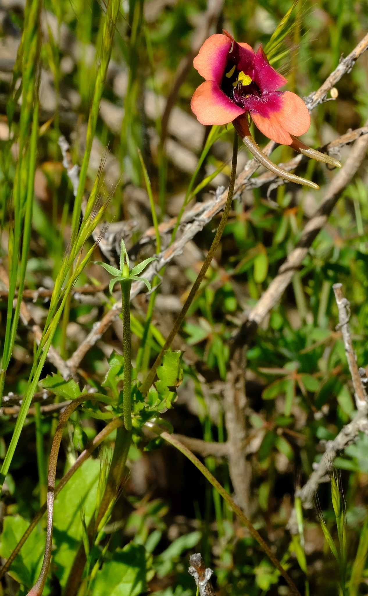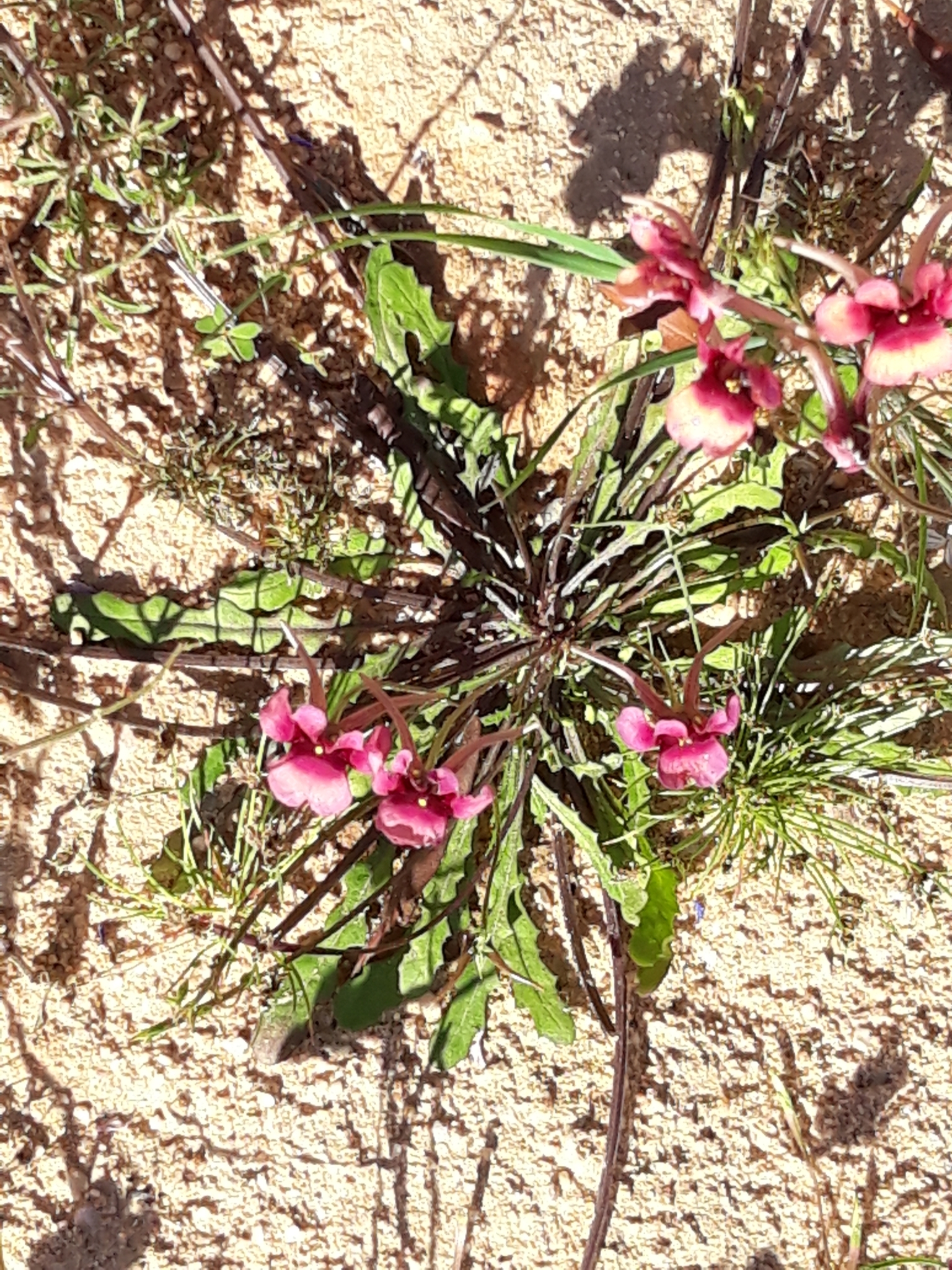 Annual to 32 cm. Leaves obovate to elliptic, sinuate to pinnatisect. Flowers axillary, 2-spurred, reddish or white with deep magenta centre and a large and small, yellow spot below each upper lobe, limb 9-19 mm long, spurs turned upwards or projecting downwards, short or long, 4-18 mm. Capsules linear to lanceolate and falcate, 8-10 x 1.5-2.0 mm. From: Steiner, KE. 2012. Scrophulariaceae: Diascia Link & Otto. In: J Manning & P Goldblatt (eds), Plants of the Greater Cape Floristic Region 1: The Core Cape flora. Strelitzia 29: 736-739. South African National Biodiversity Institute, Pretoria. [CC BY]