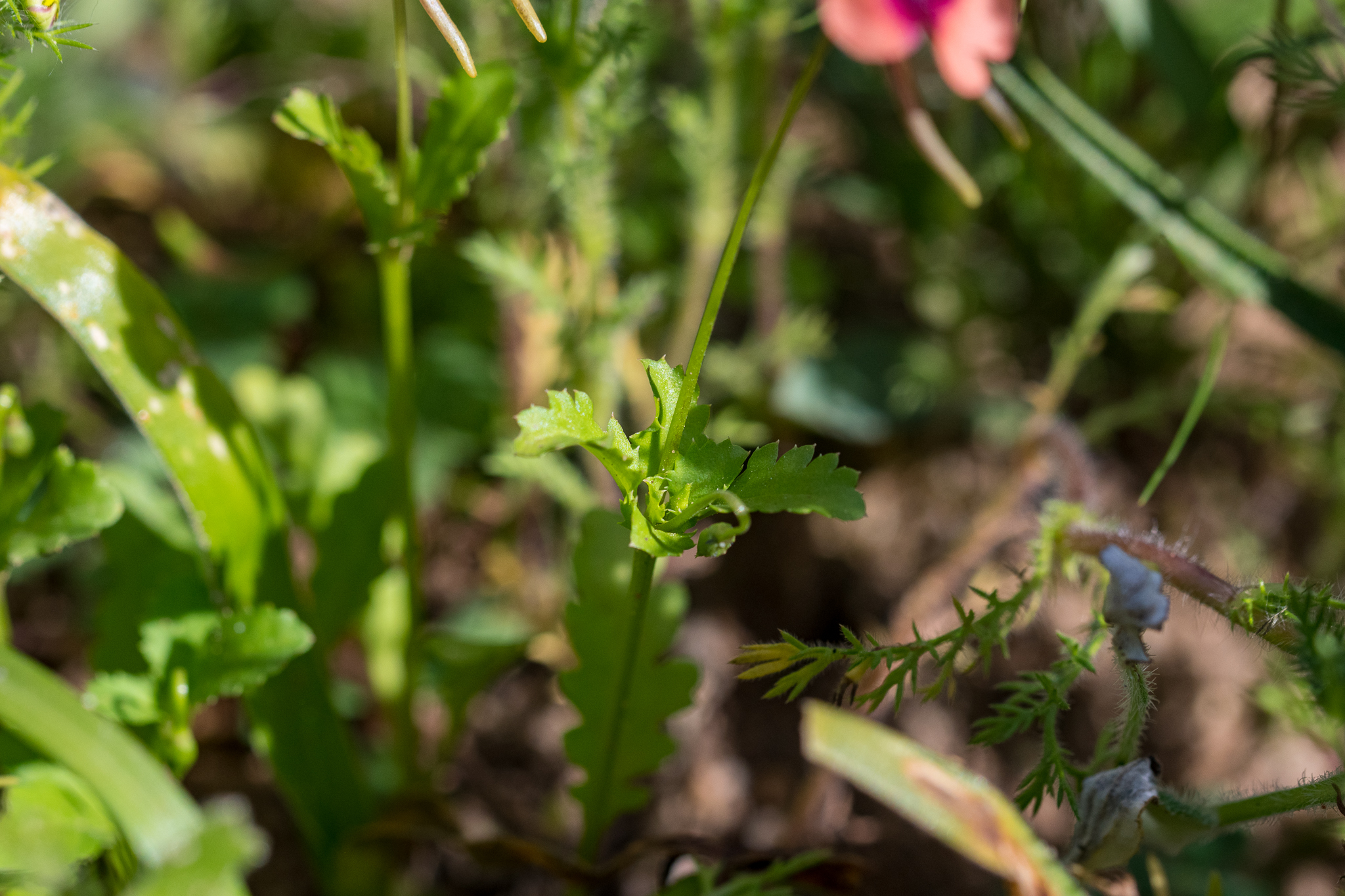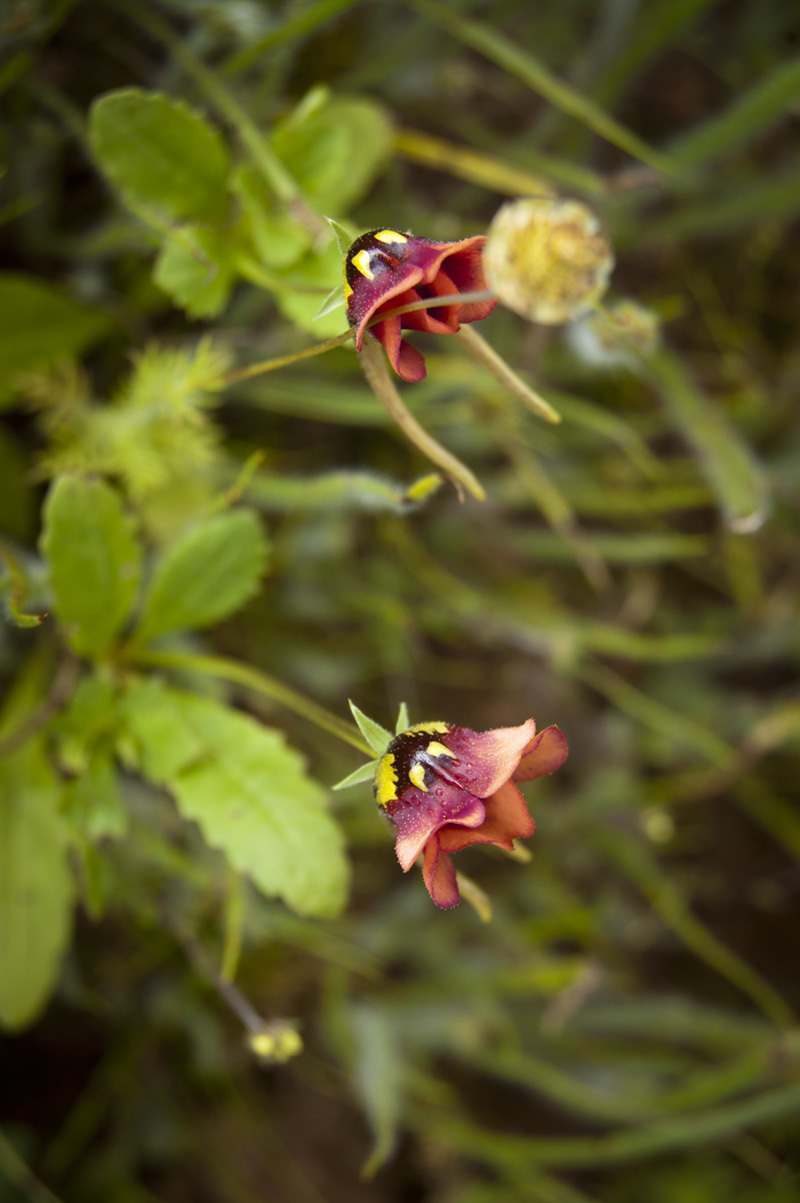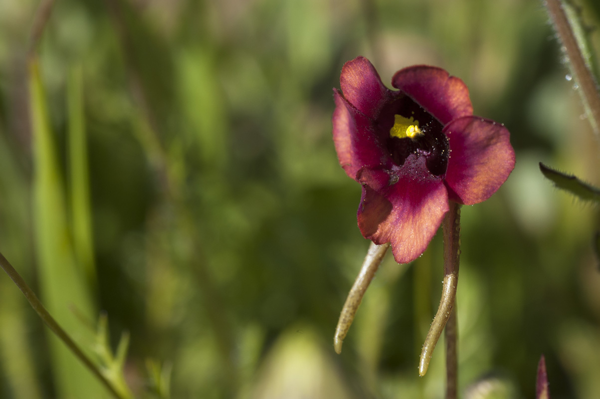 General notes: Alt. 149 m. Plain. Well-drained, sandy clay soil. Shale. Full sun. Disturbed. Renosterveld. Annual plant height 15 cm. Flowers orange, purple.