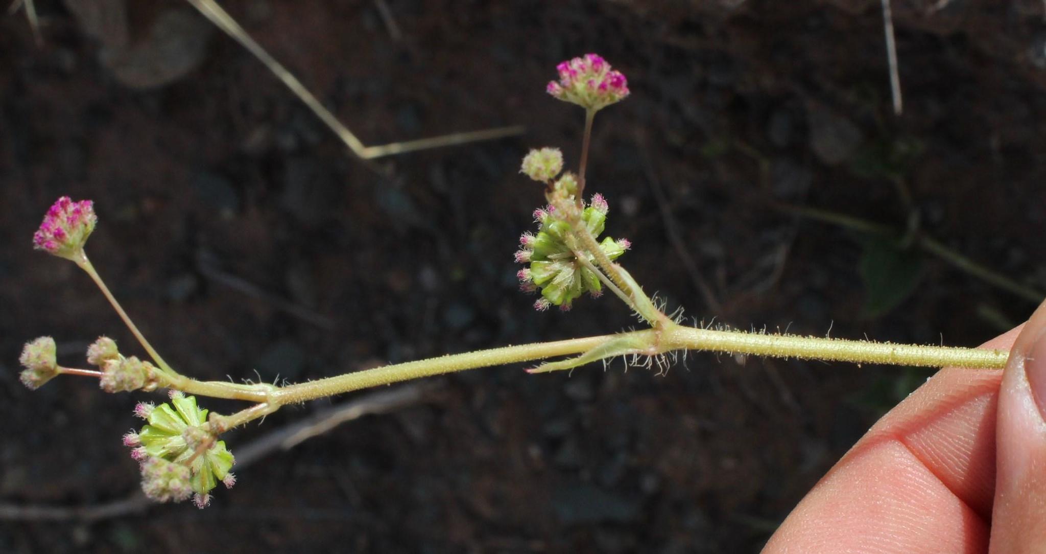 Stems decumbent or prostrate, puberulent, with scattered long septate hairs. Leaves with petioles (3-)5-19(-25) mm long; lamina deltoid, oblong, lanceolate, elliptic or ovate, (14-)15-42(-47) x (8-)9-32(-34) mm; apex obtuse, acute, acuminate or apiculate; base obbtuse or truncate; margins entire, sometimes undulate; glabrous, with long septate hairs along veins and margins. Inflorescence with primary peduncles 60-130 mm long, secondary peduncles 20-35 mm long; 5-many flowers per cluster; pedicels 1 mm long. Flowers 3 mm long; lower part of perianth 1-1.5 mm long, clavate, 3- or 4-ribbed with apex of ribs expanded, glabrous; upper part of perianth 1.5-2 mm long, purple or pink. Stamens 2 or 3, Ovary ellipsoid, stipitate; style filiform, exserted. Anthocarp 3-4 x 2-3 mm, clavate, 3- or 4-winged, broadly truncate-apiculate, glabrous. From: Struwig, M; Siebert, SJ. 2013. A taxonomic revision of Boerhavia (Nyctaginaceae) in southern Africa. S. African J. Bot. 86: 116-134. [Copyright held by the South African Association of Botanists (2013); http://www.sciencedirect.com/science/journal/02546299] [CC BY]