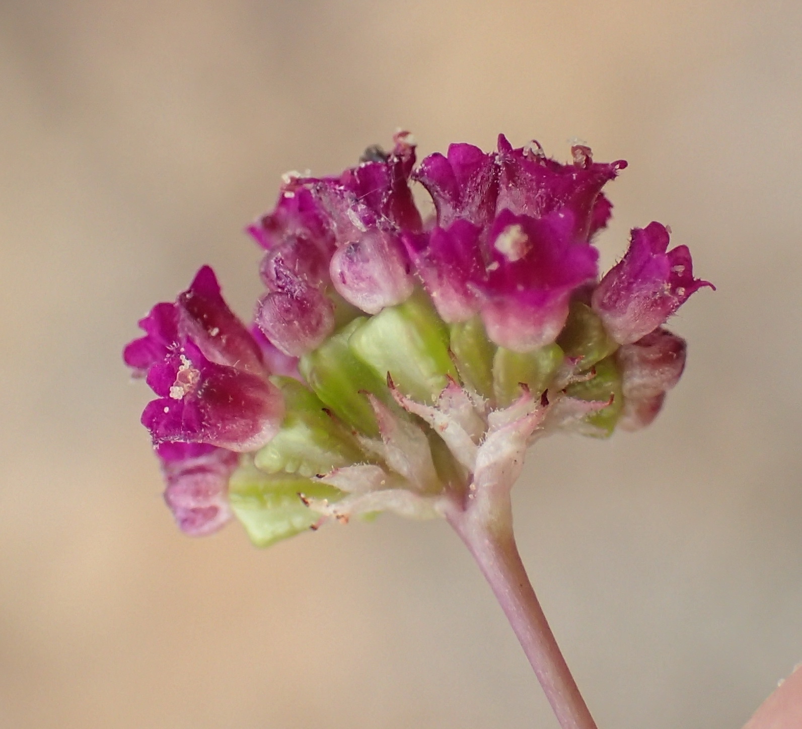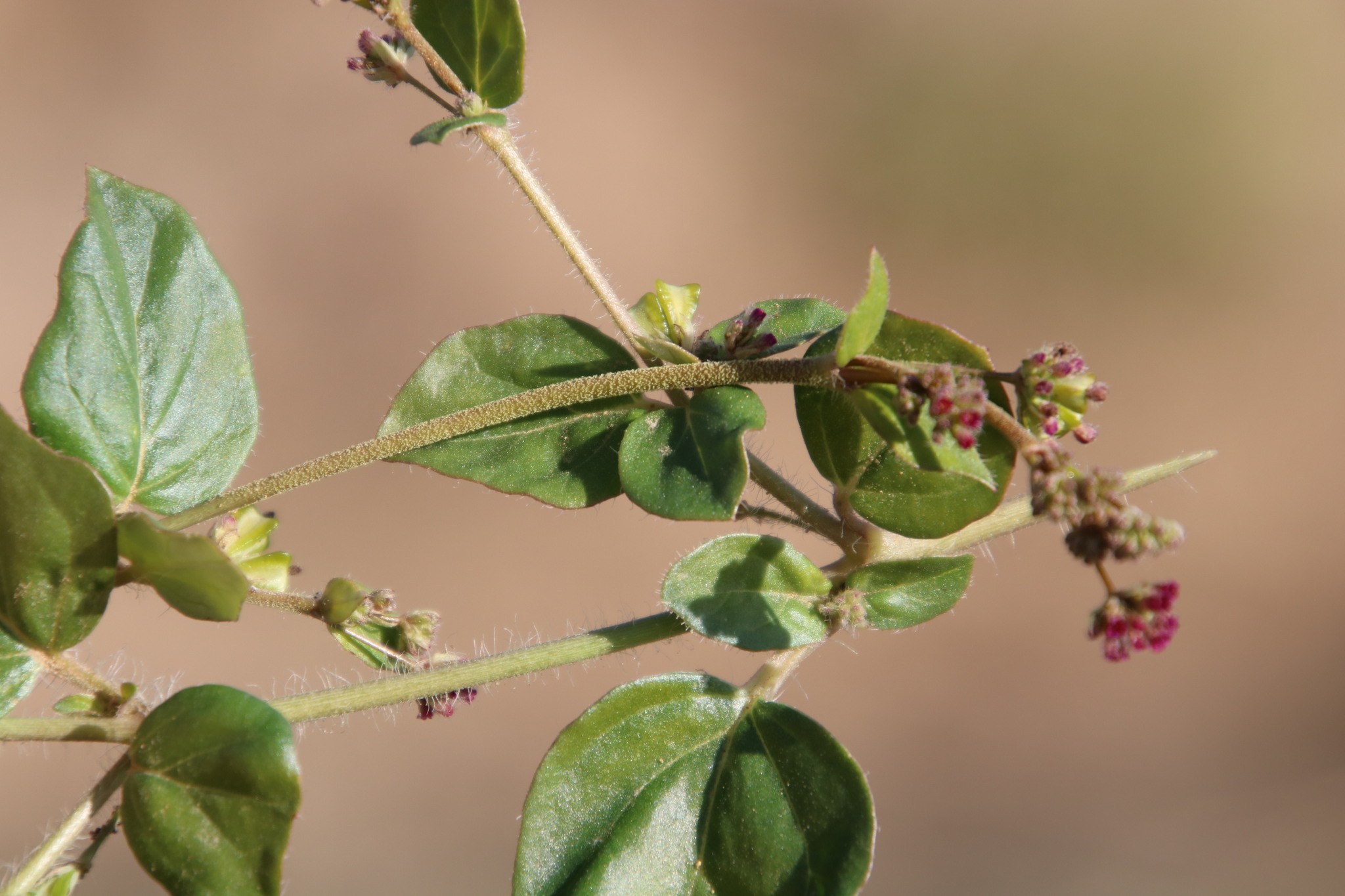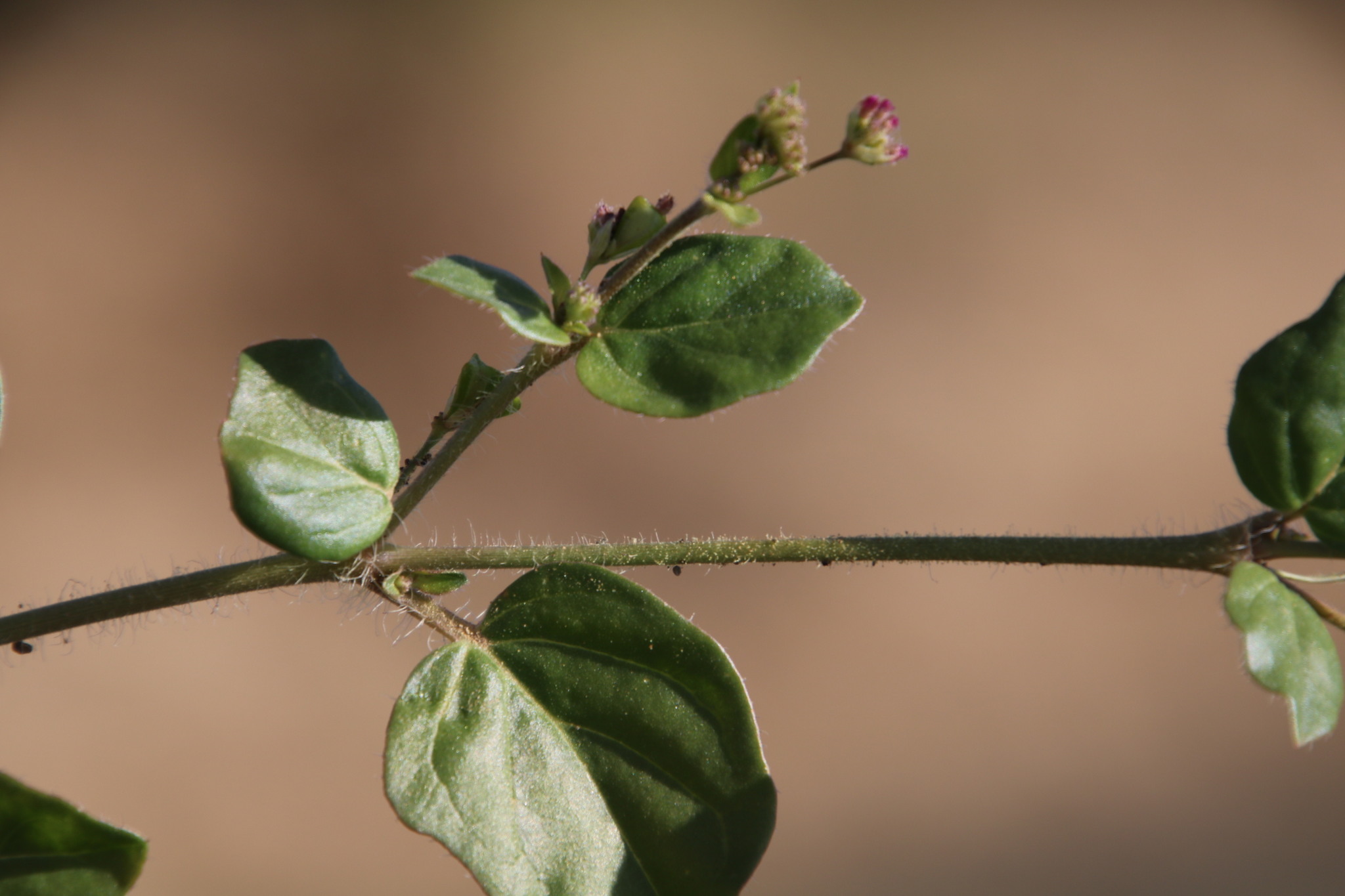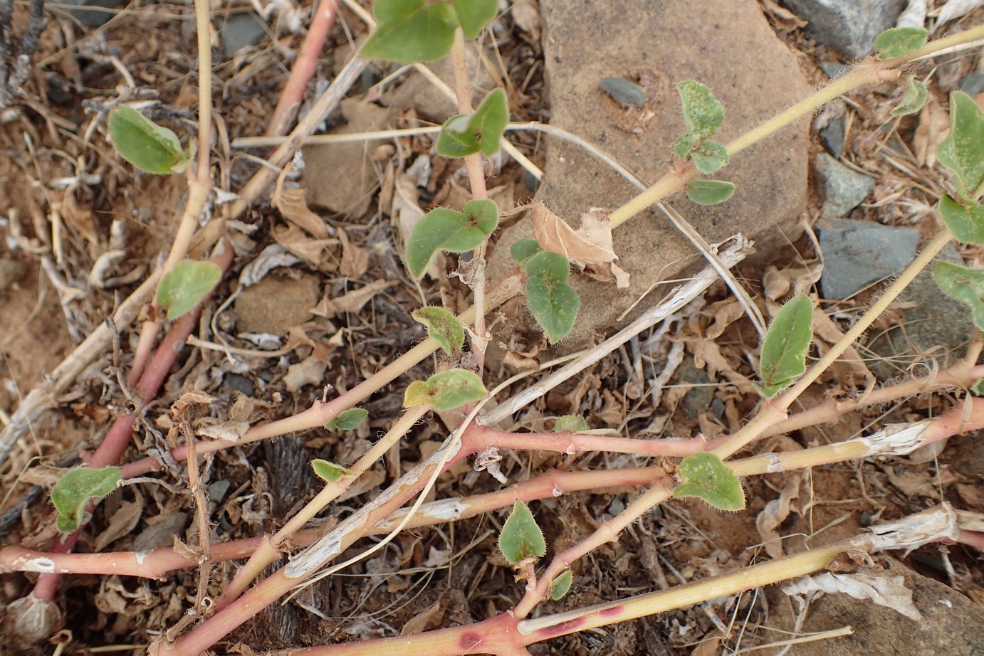 Annual or perennial herb, 0.4 m high. Stems prostrate, puberulous to hispid with scattered, long, septate hairs. Leaves deltoid, oblong, lanceolate, elliptic or ovate; blade14-47 x 8-34 mm, sparsely hispid on margins and nerves below, glabrous above, base obtuse to truncate, apex acute to obtuse; petioles 3-25 mm long. Inflorescence a compound cyme, usually freely branched; peduncles glandular-puberulous. Flowers small, 3 mm long, lower portion of flower green, coriaceous, 3- or 4-ribbed with apices of ribs expanded, upper portion petaloid, purple. Flowering time Nov.-Apr. Fruit 3-4 mm long anthocarp, 3- or 4-winged. From: Bredenkamp, CL; Matiapoto, MMH; Struwig, M. 2019. Nyctaginaceae. In: CL Bredenkamp (ed.), A Flora of the Eastern Cape Province. Strelitzia 41(2): 1251-1253. South African National Biodiversity Institute, Pretoria. [CC BY]