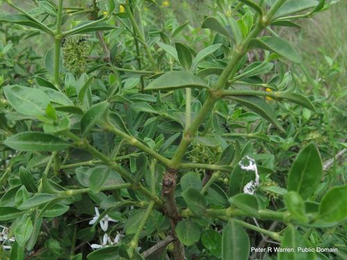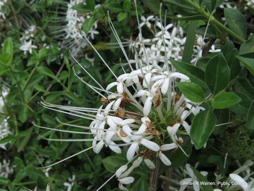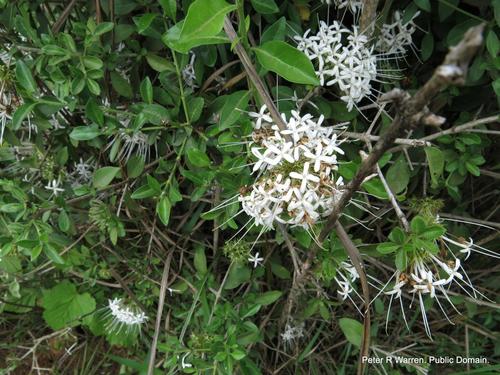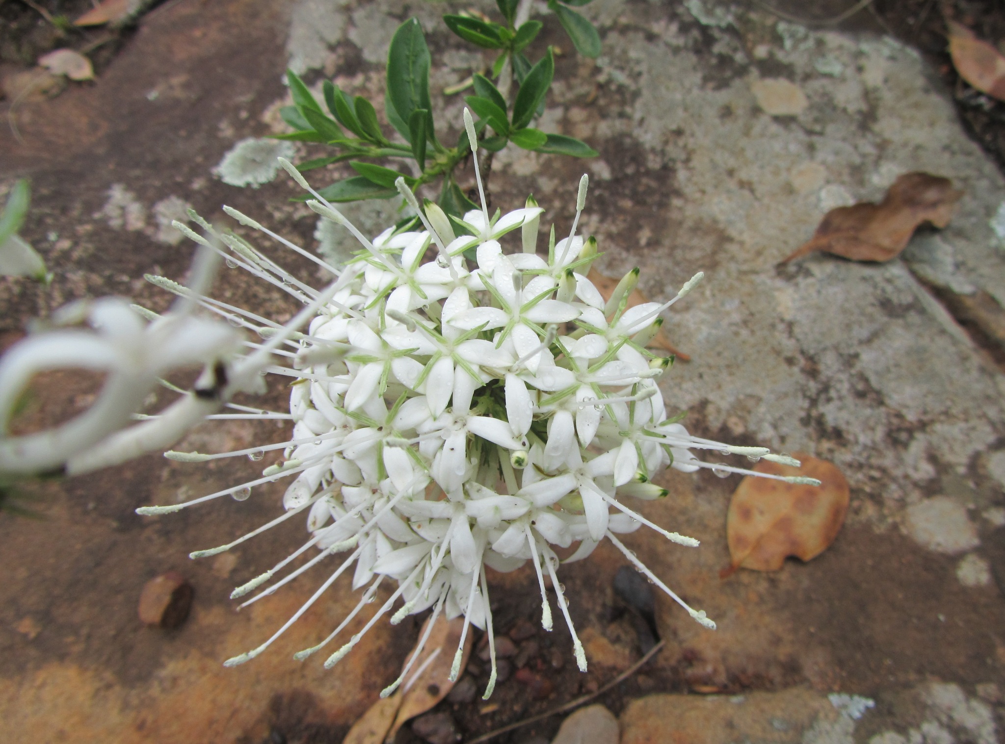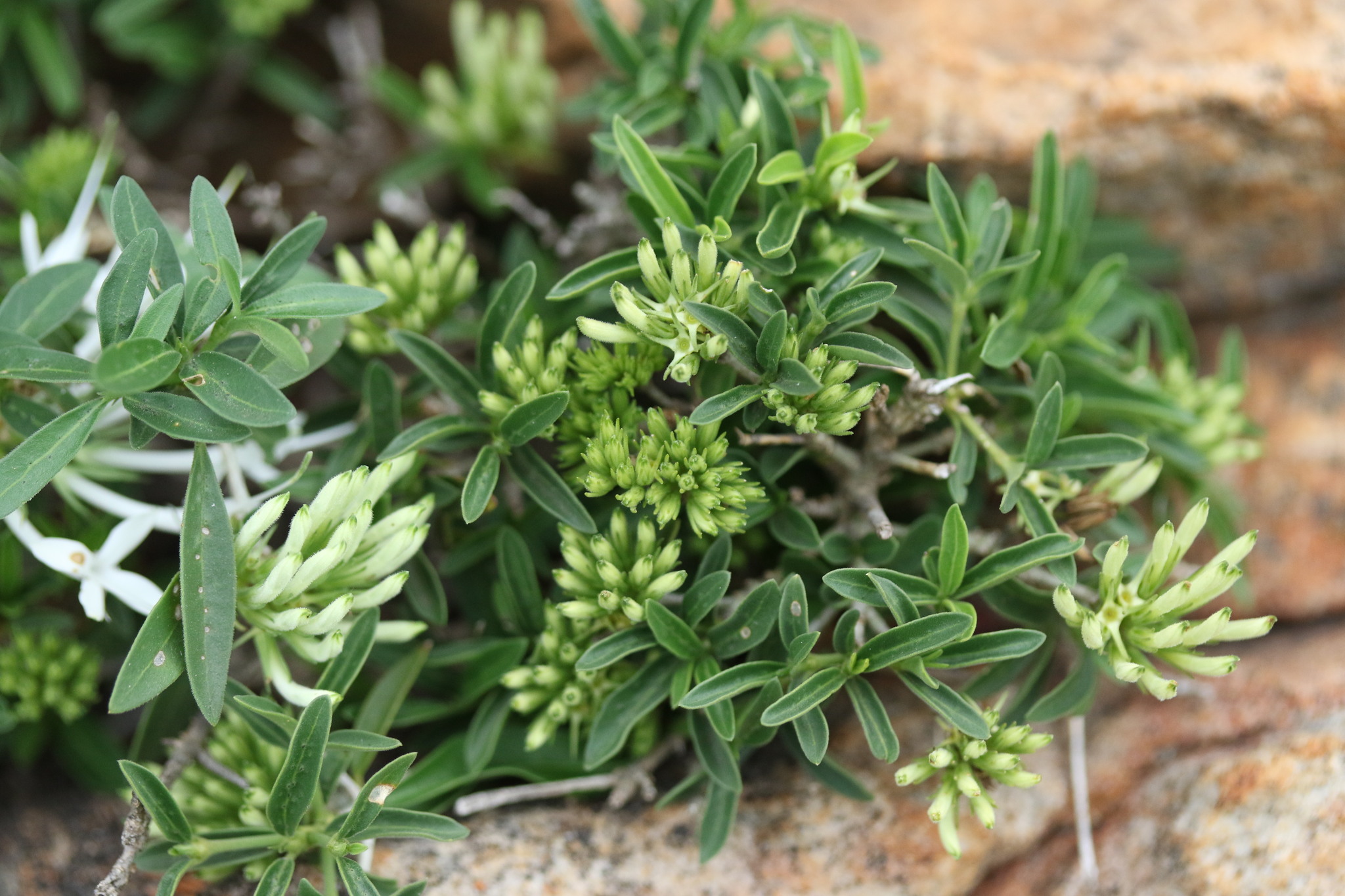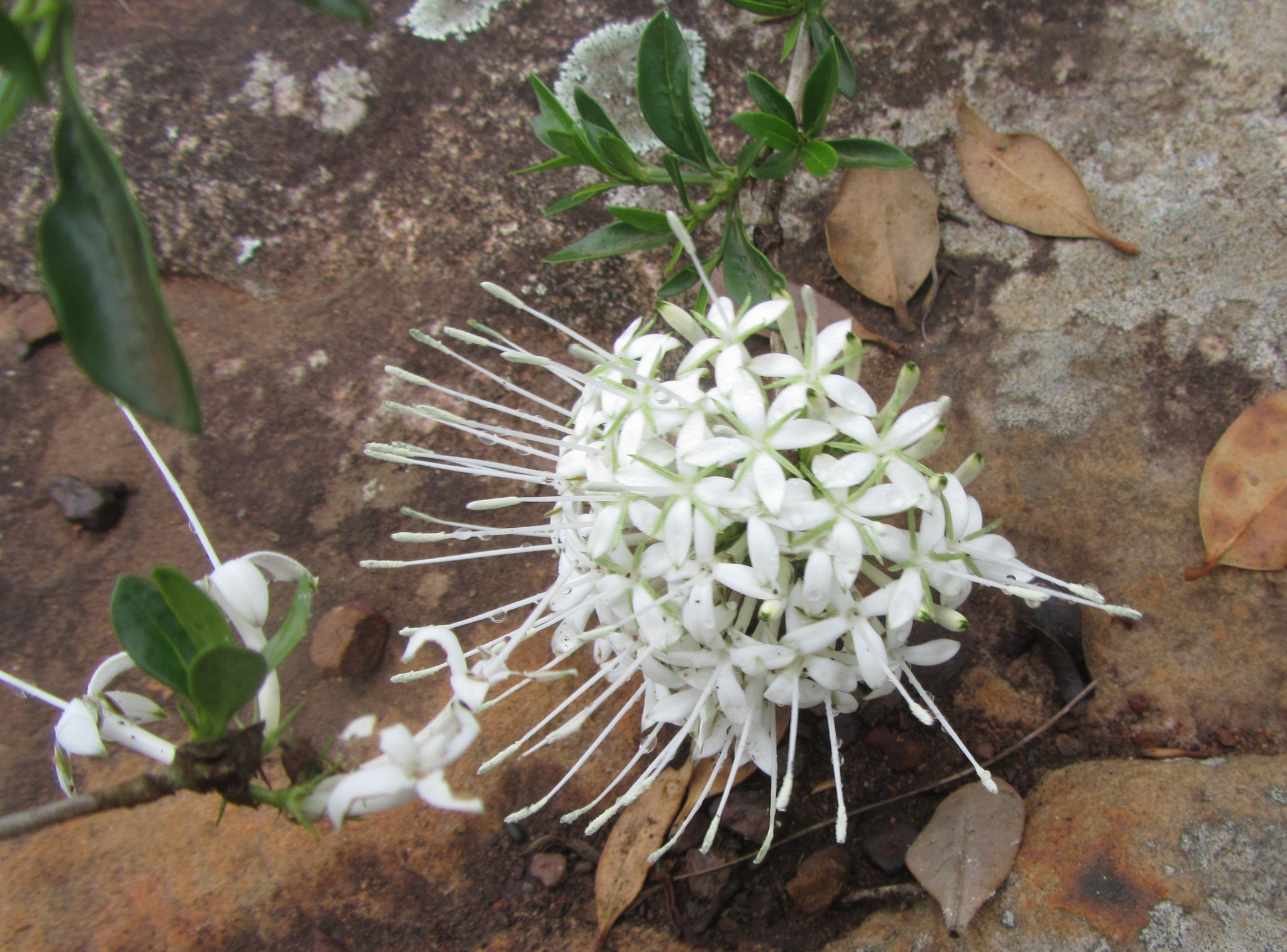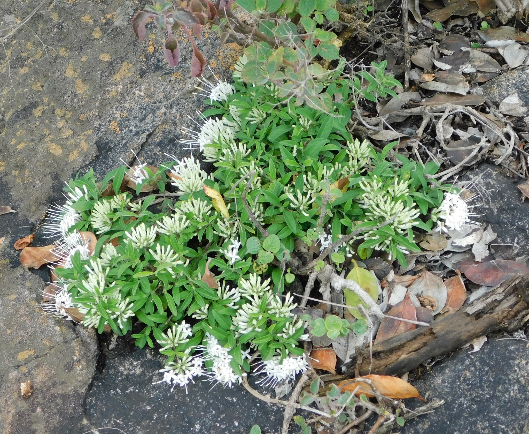 General notes: Margin of Dry Forest, among rocks. A small, much branched shrub. Leaves lanceolate, pale yellow-green. Flowers tubular, white, fragrant, in dense heads; stamens exserted.