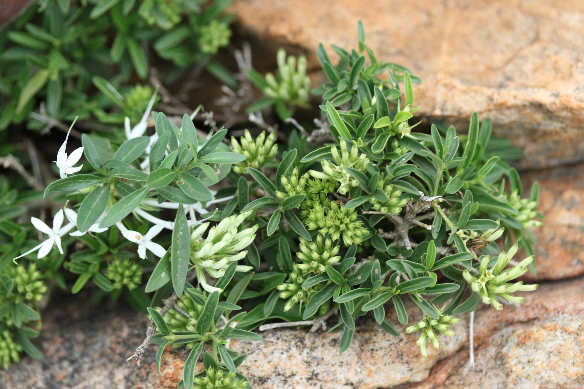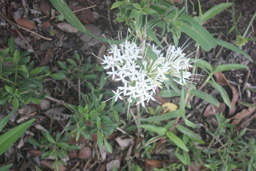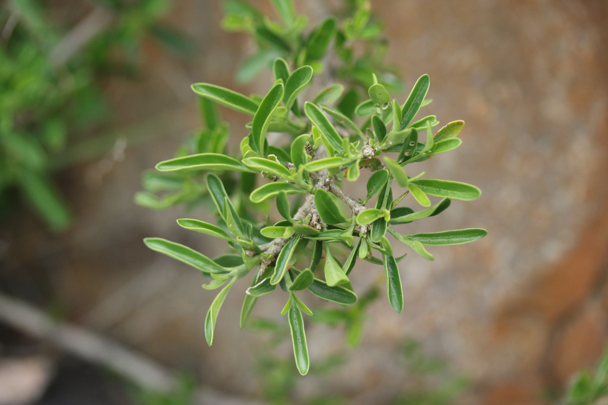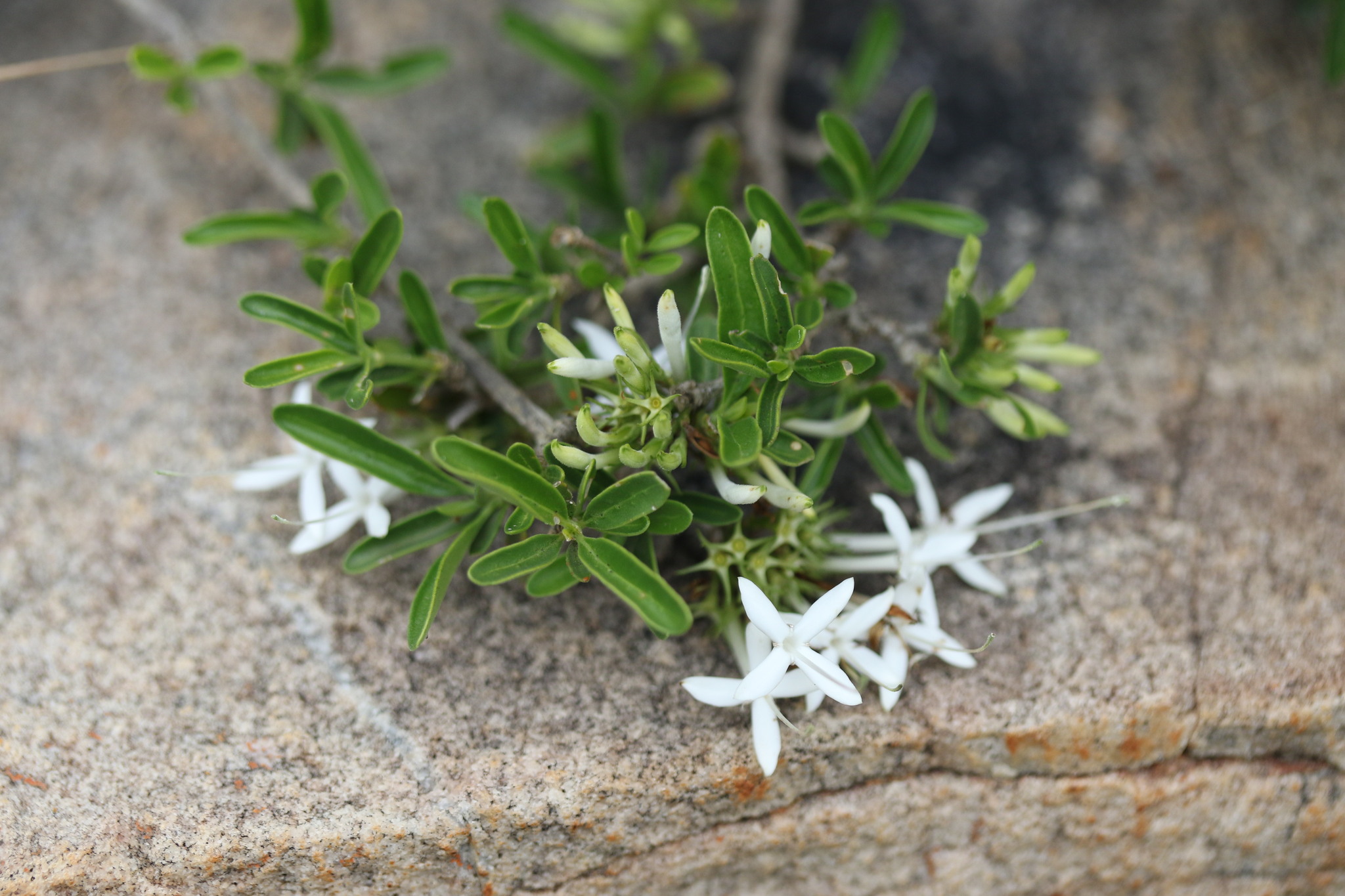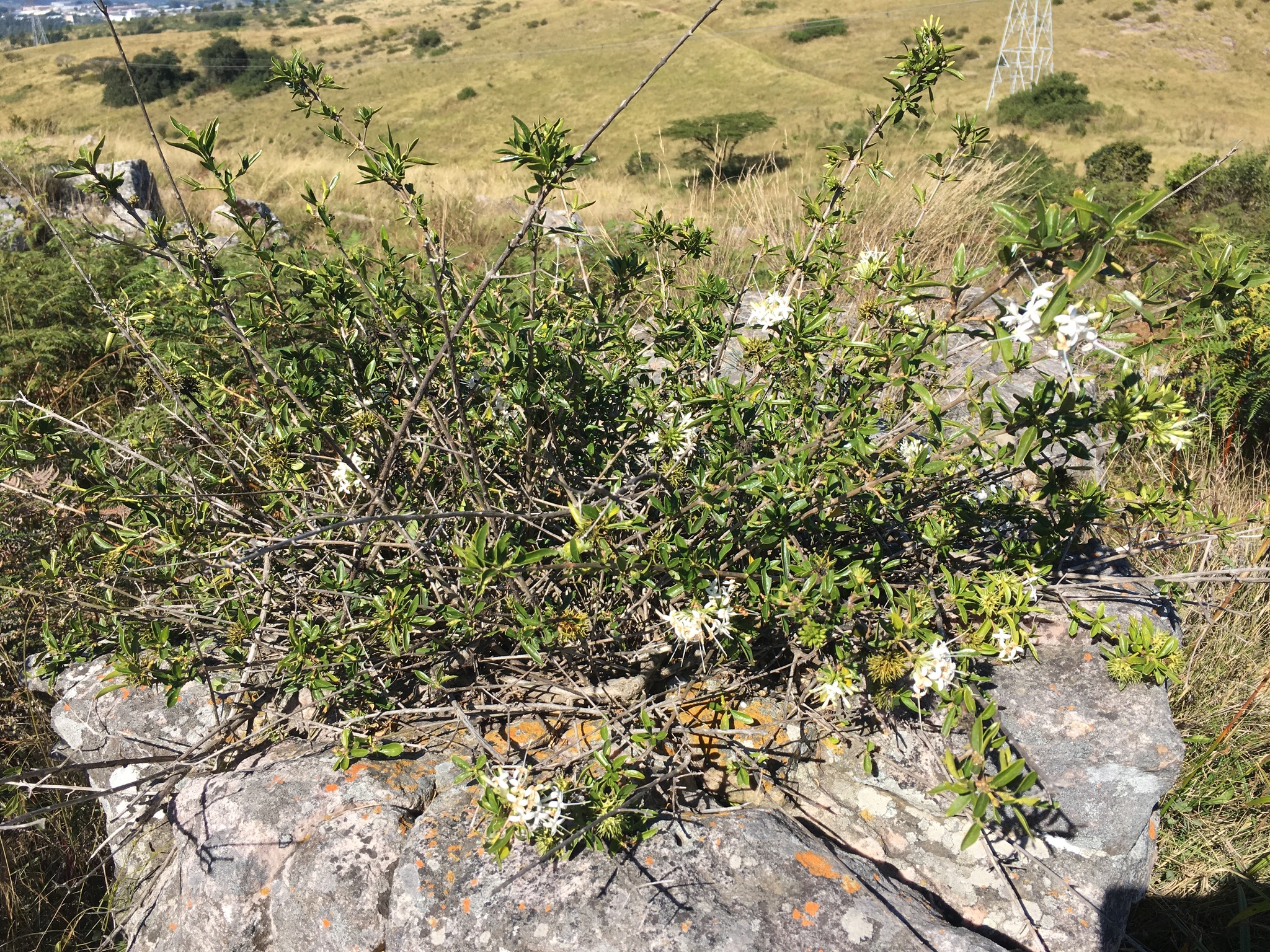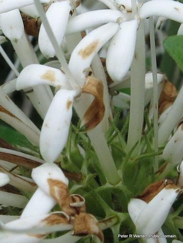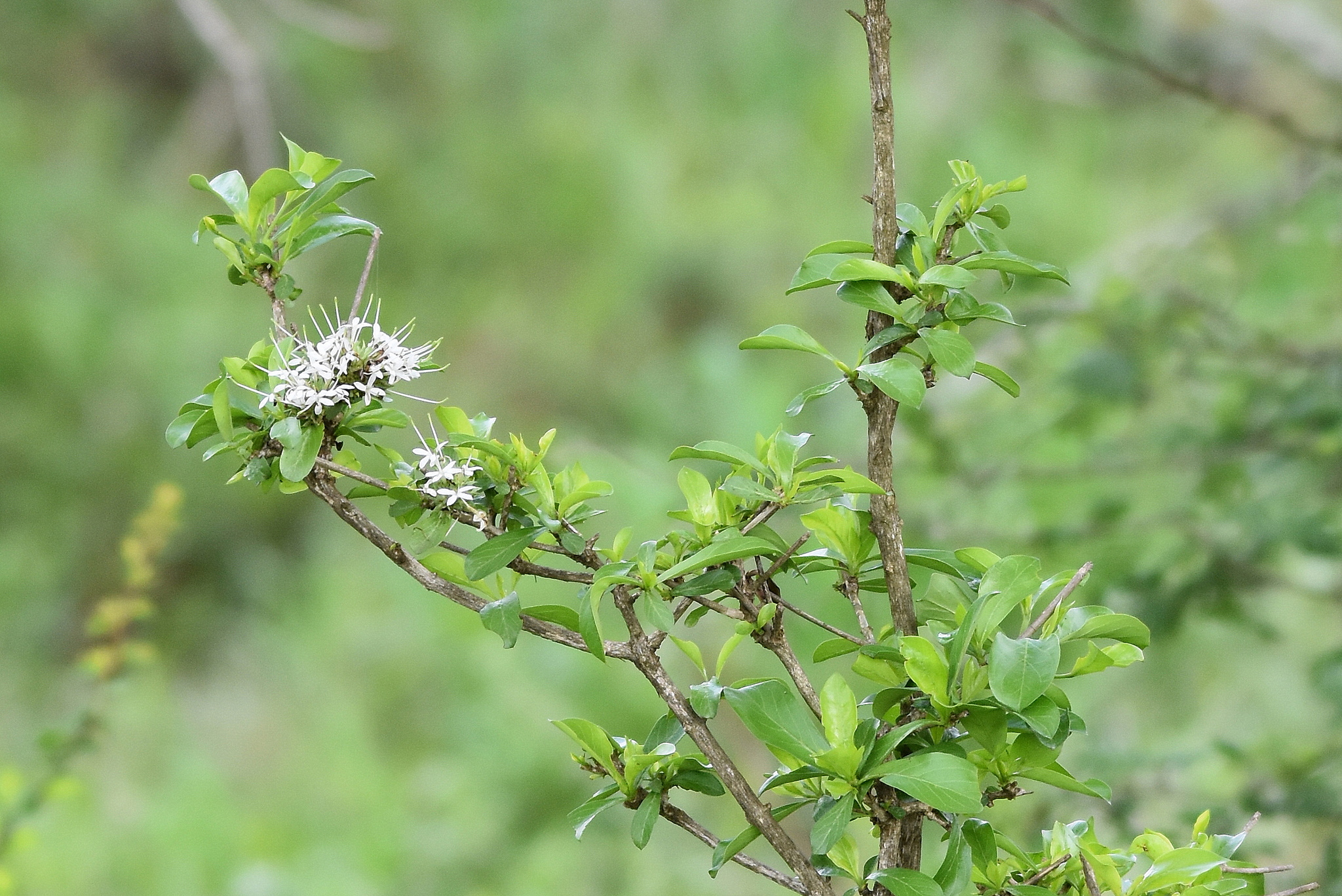 General notes: Margin of Dry Forest, among rocks. A small, much branched shrub. Leaves lanceolate, pale yellow-green. Flowers tubular, white, fragrant, in dense heads; stamens exserted.