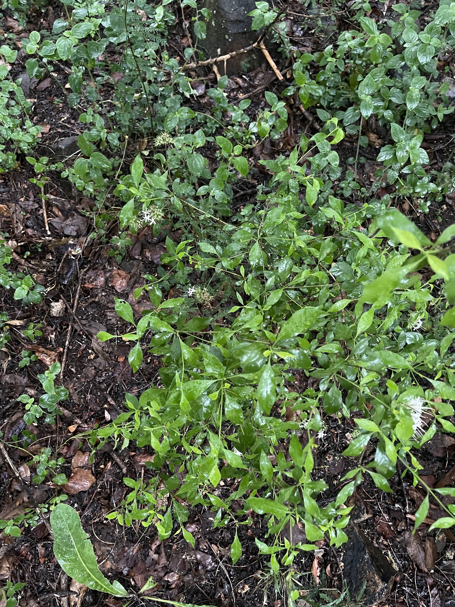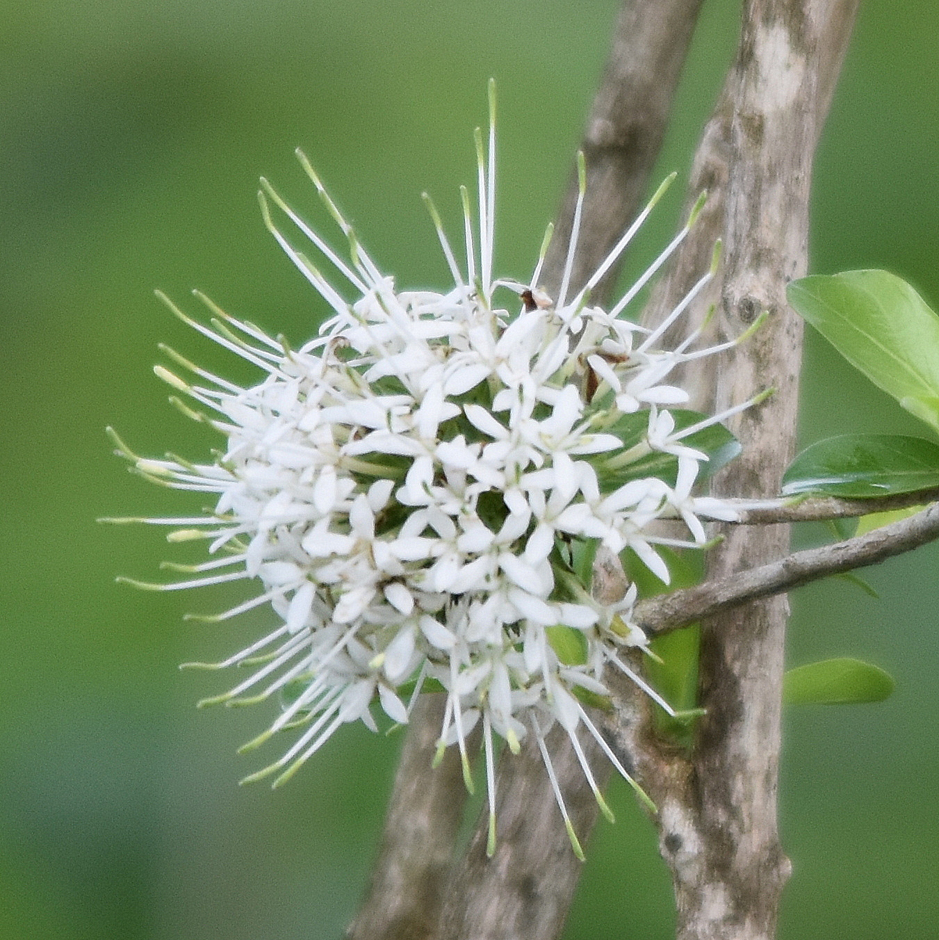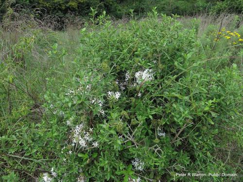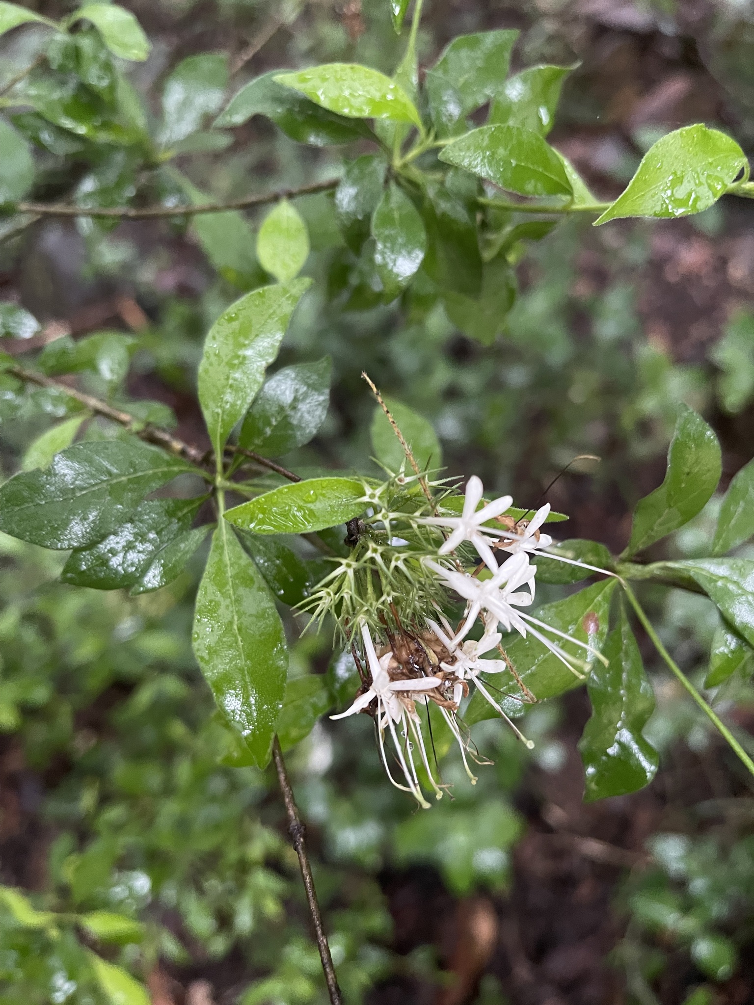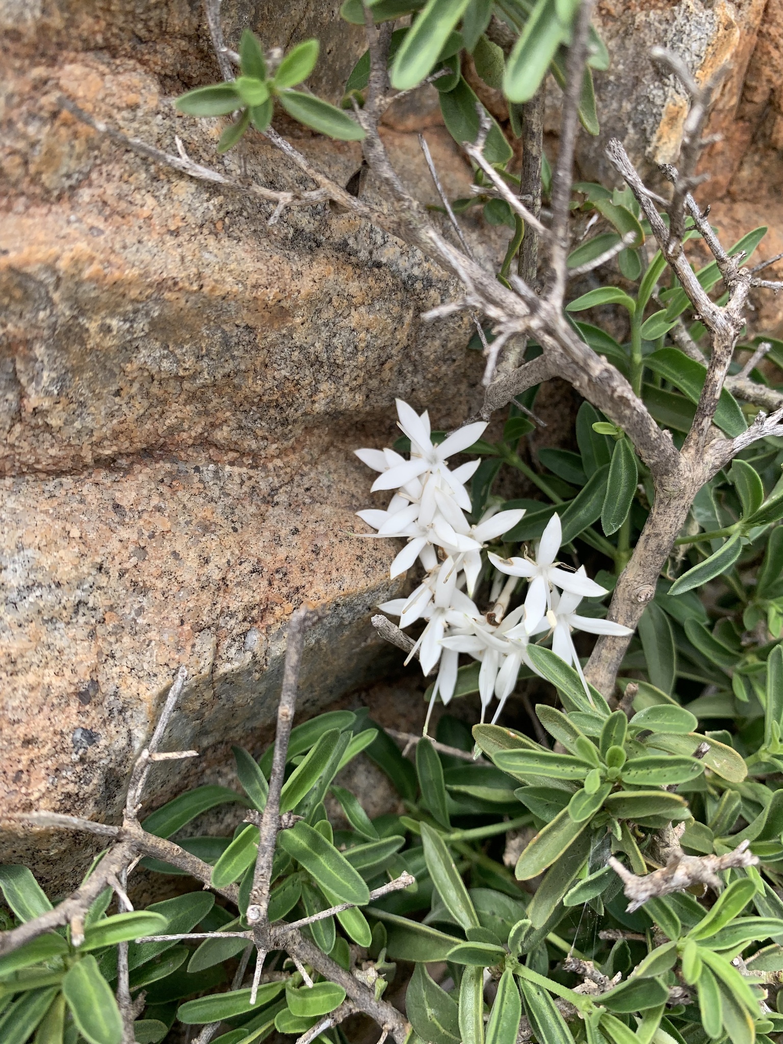 General notes: Margin of Dry Forest, among rocks. A small, much branched shrub. Leaves lanceolate, pale yellow-green. Flowers tubular, white, fragrant, in dense heads; stamens exserted.