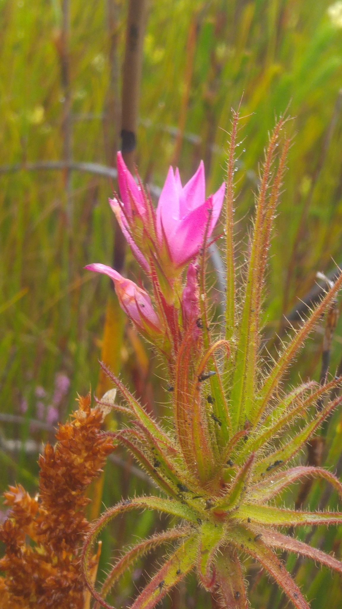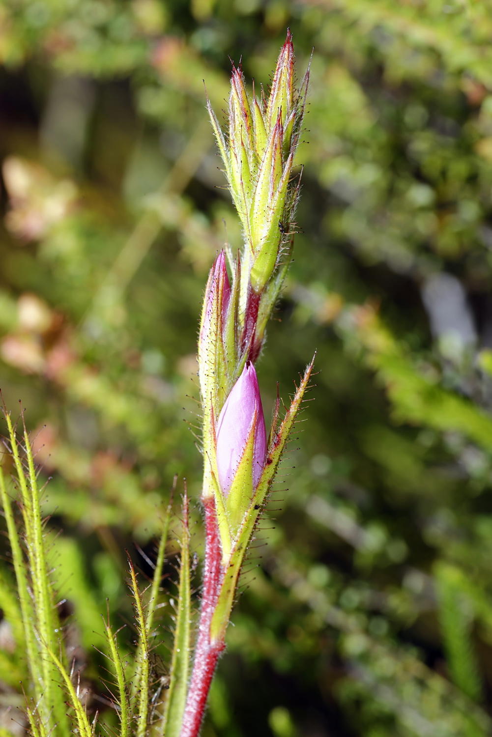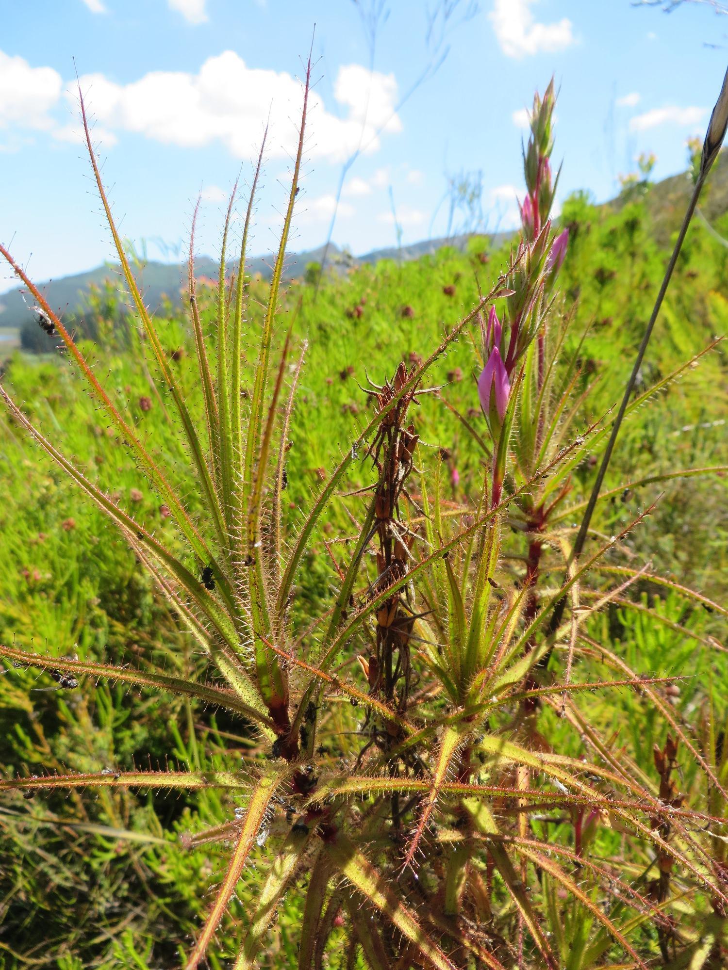 General notes: Well- drained; sandy loam stony soil. W aspect. Moderate slope. Wet mountain fynbos; TMG - sandstone; full sunlight; 7 months after fire. Fynbos vegetation. No effect seen . Locally rare. Perenial dwarf shrub. Pink flowers. No fruit. Plant height: 0.68 m. Stem branched, leaves alternate, closely packed near top of stem branches; leaves covered with long sticky hairs for catching insects etc. Leaves 5 - 9 cm long & 0.2 - 0.6 cm broad. Shale soil.