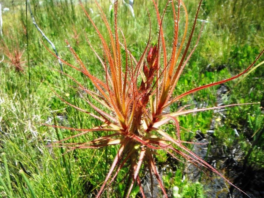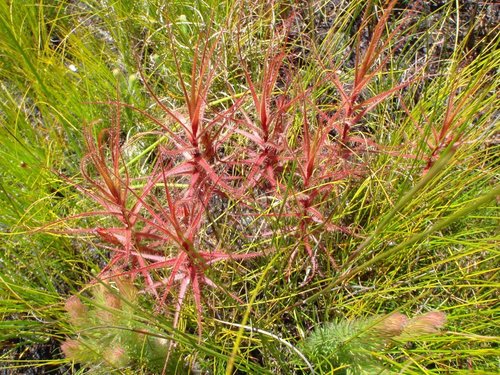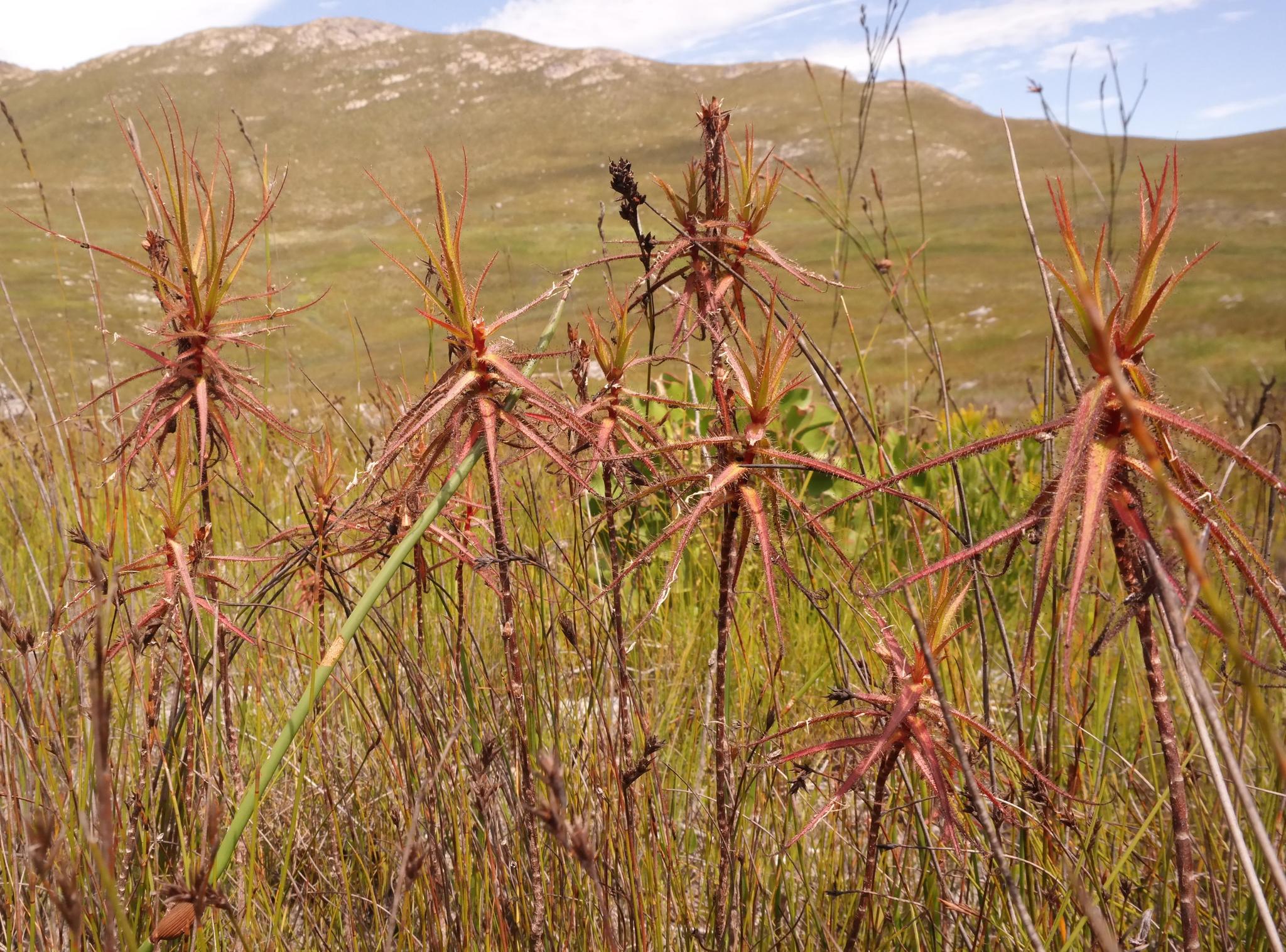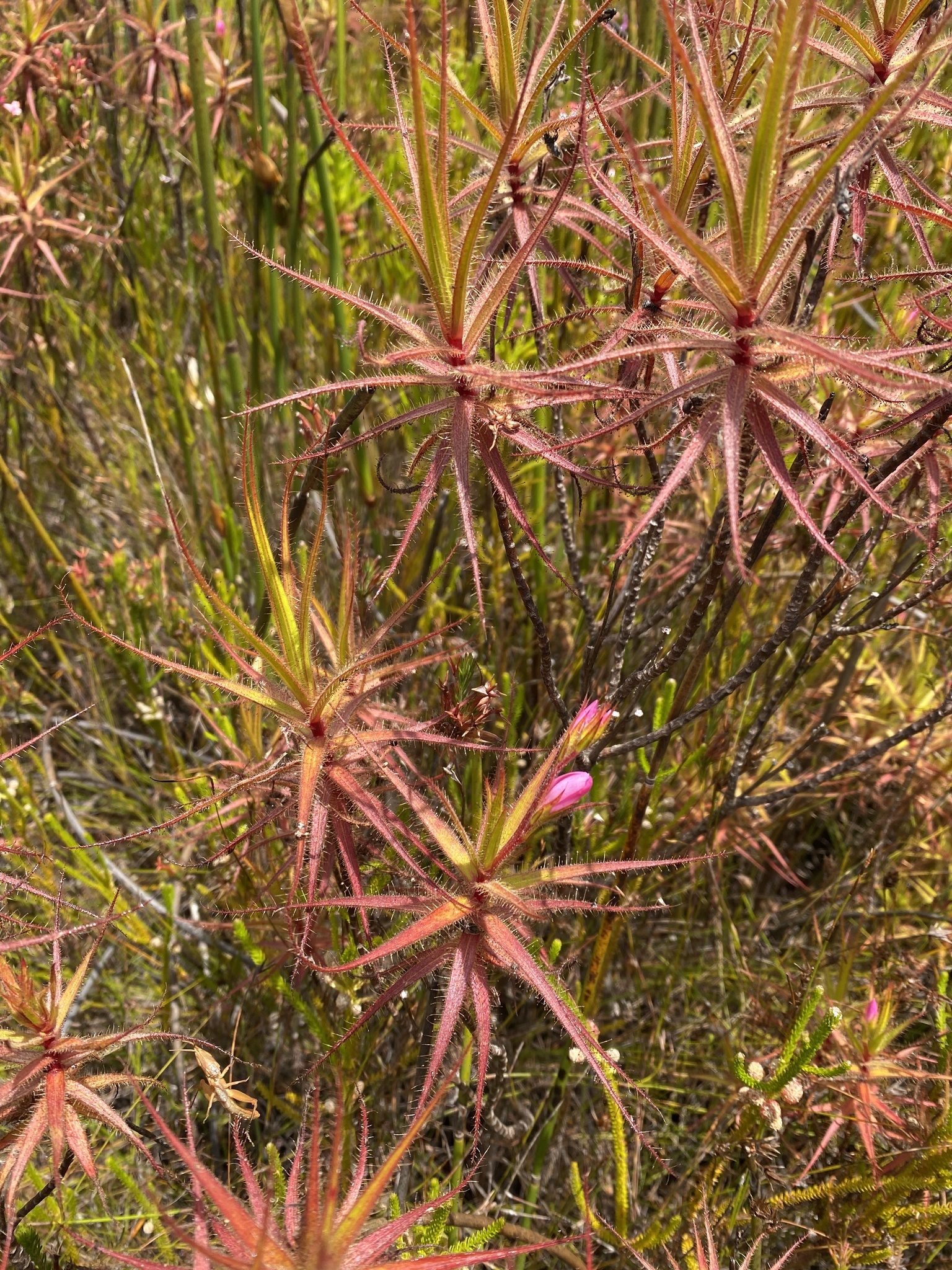 General notes: Well- drained; sandy loam stony soil. W aspect. Moderate slope. Wet mountain fynbos; TMG - sandstone; full sunlight; 7 months after fire. Fynbos vegetation. No effect seen . Locally rare. Perenial dwarf shrub. Pink flowers. No fruit. Plant height: 0.68 m. Stem branched, leaves alternate, closely packed near top of stem branches; leaves covered with long sticky hairs for catching insects etc. Leaves 5 - 9 cm long & 0.2 - 0.6 cm broad. Shale soil.