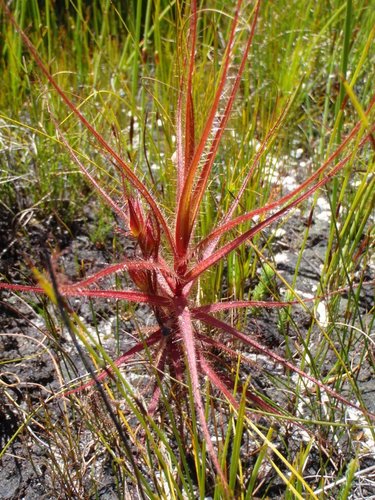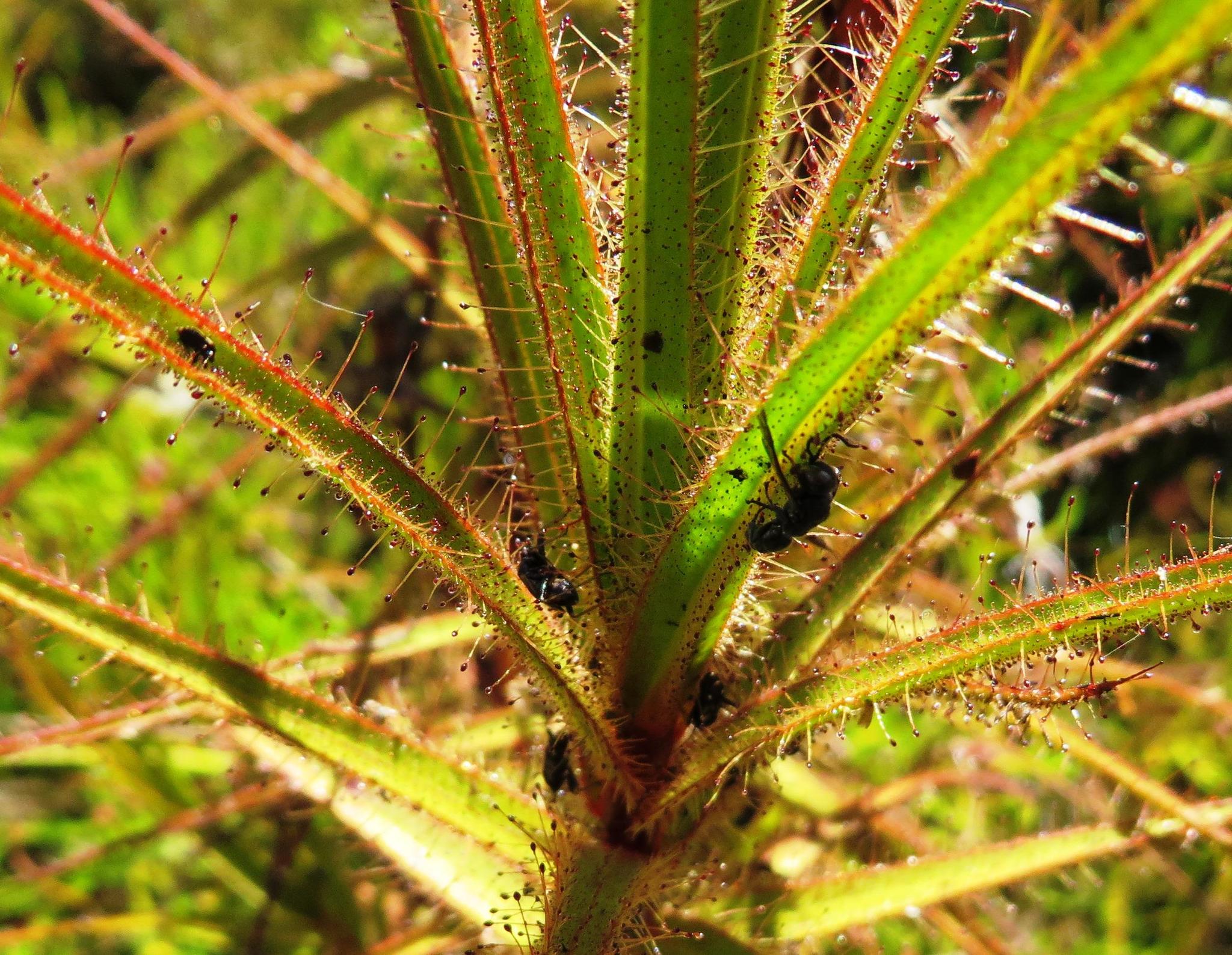 Shrublets up to 60 cm high. Stems fairly stout with prominent horizontal leaf-scars, brownish, ending in racemes which die off but producing side branches below the old inflorescences. Leaves crowded at the ends of the branches, the older reflexed, younger erect; lamina linear, up to 12 cm long and 5 mm broad, tapering gradually to a filiform tip, margin entire, beset with long-stemmed tentacles tipped with knob-shaped glands; upper surface with small tentacles and long white setae; lower surface glabrous but the raised midrib furnished with a row of short tentacles. Flowers aggregated into terminal racemes bearing 10-12 flowers on short bractiferous pedicels. Sepals linear-subulate, 15 mm long, the tip ending in a tentacle, margin softly hairy. Petals ovate, 15 mm long, apiculate, with a dark base, deciduous. Stamens with the anthers opening by wide slits. Ovary glabrous with 2-4 ovules in each locule, style broadening towards the apex where it forms a wide, flat, papillate stigma. Capsule narrowly ovoid, 1 cm, herbaceous; seeds angled, verrucose, 2.5 mm long, brown. From: Obermeyer, AA. 1970. Roridulaceae. Fl. S. Africa 13: 201-204. Dept. Agric. and Technical Services, Pretoria. [CC BY]