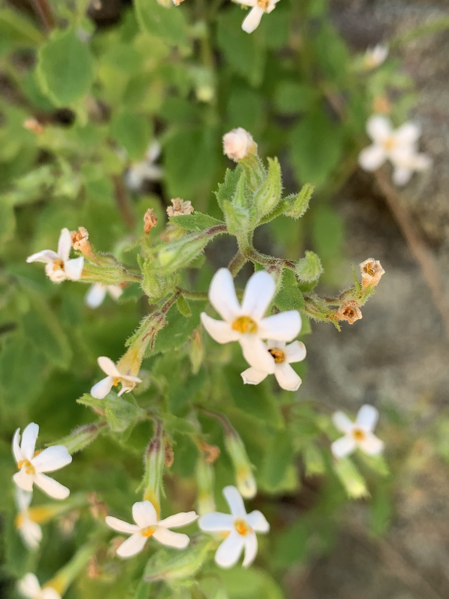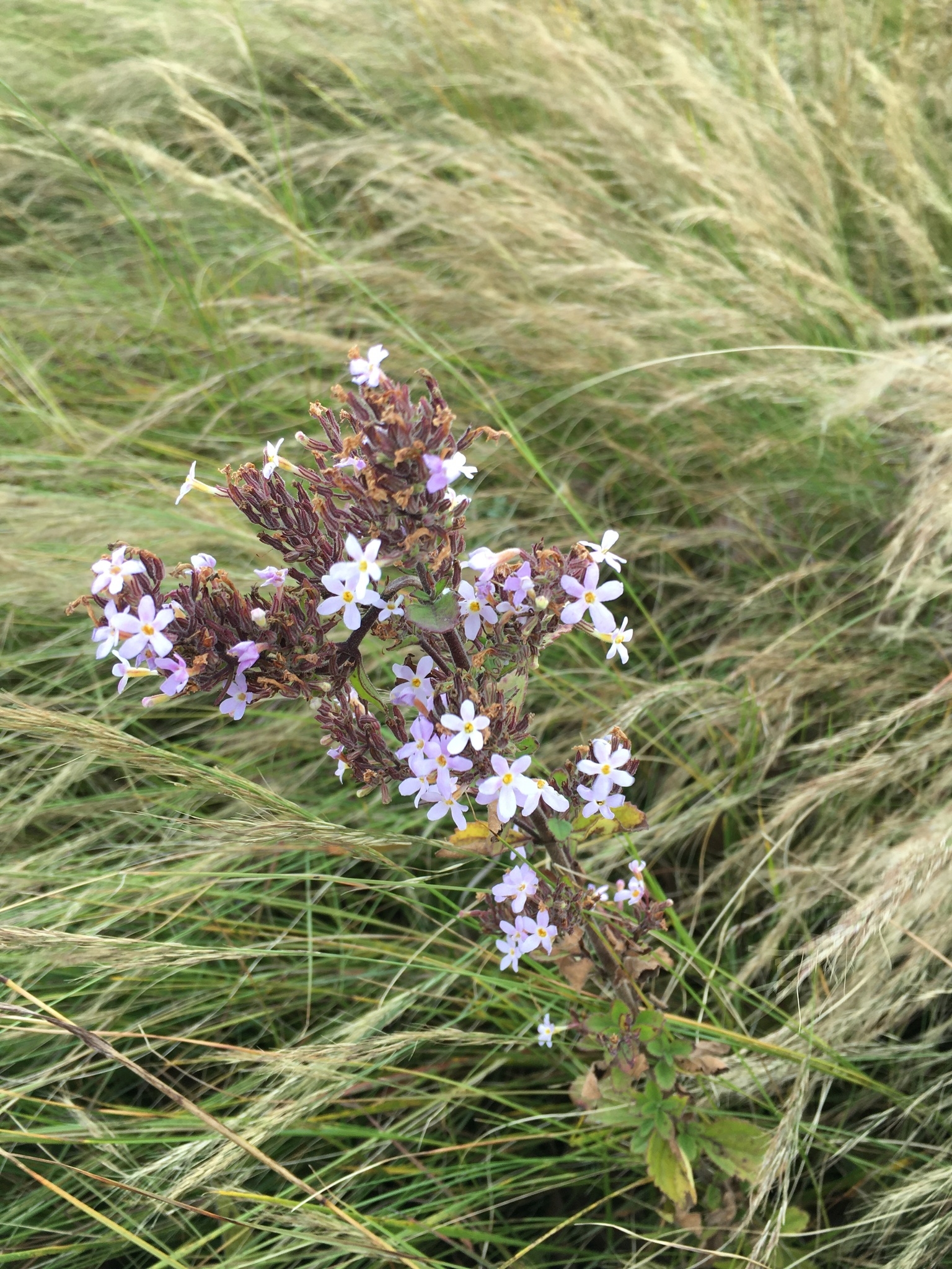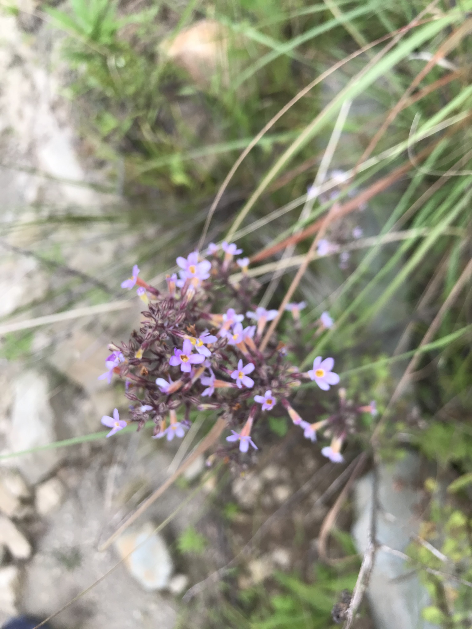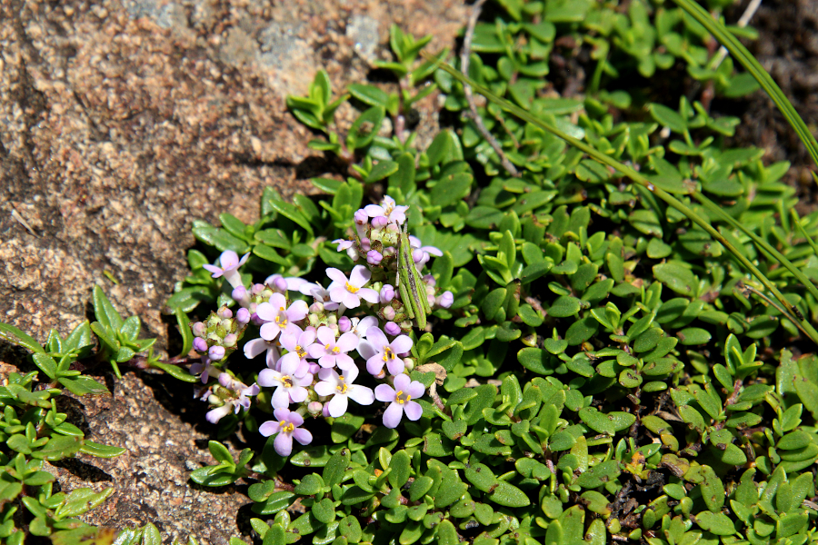 General notes: Geskuil teen groot rots, koel swart leemgrond. Klam. Los vertakte bos oortrek me wit blommetjies. Sagte blare. Beperkte voorkoms.